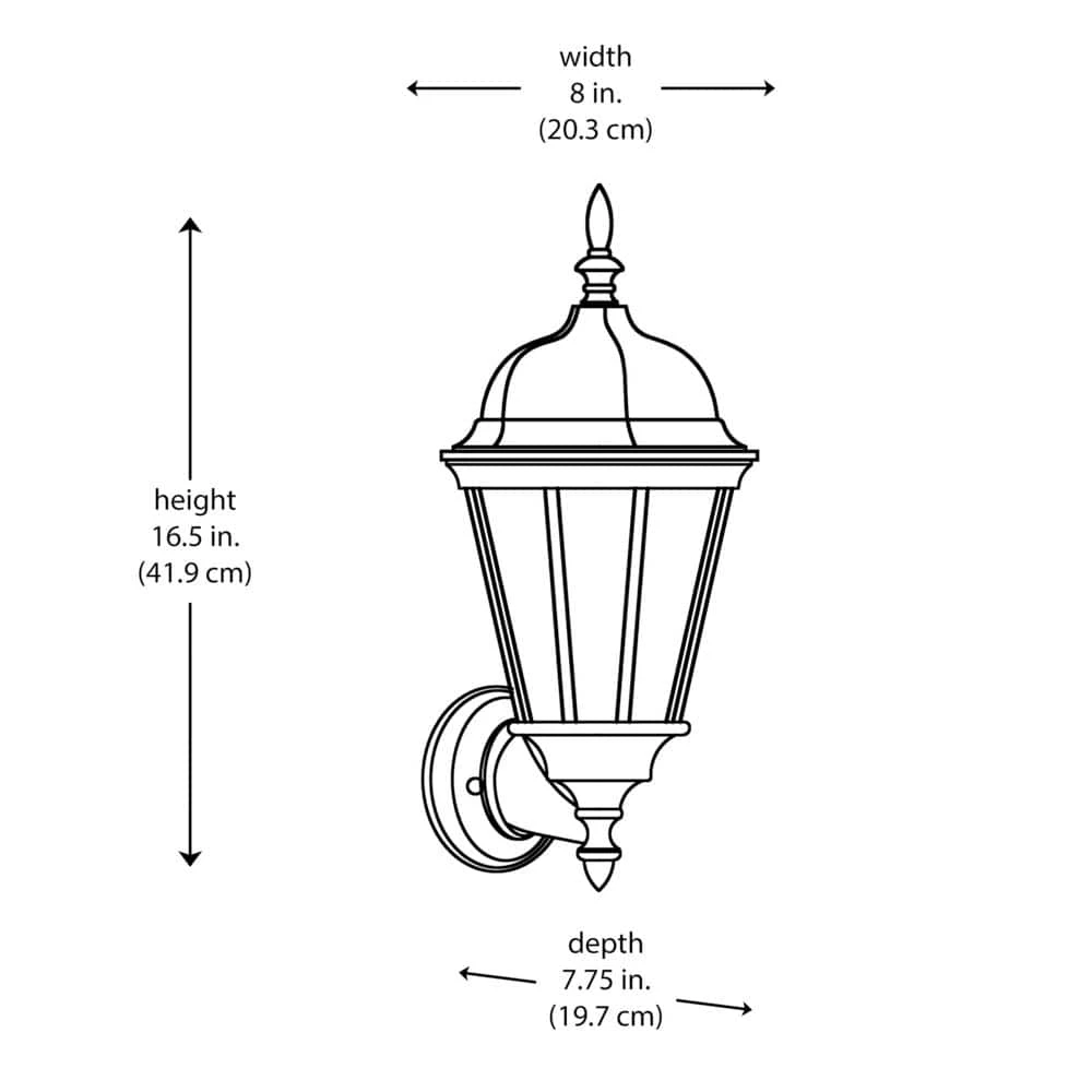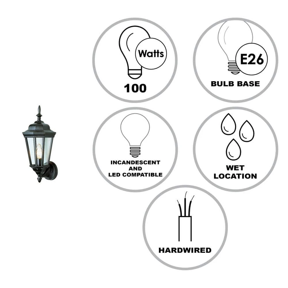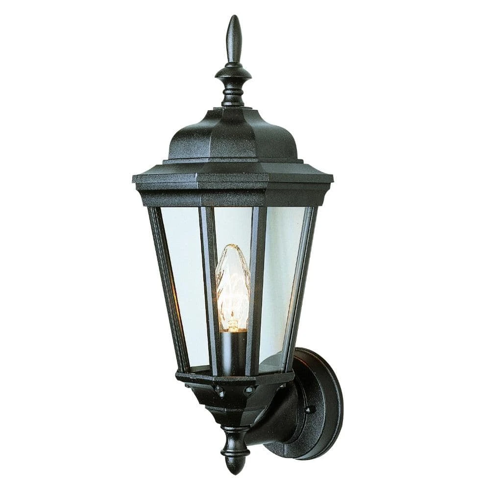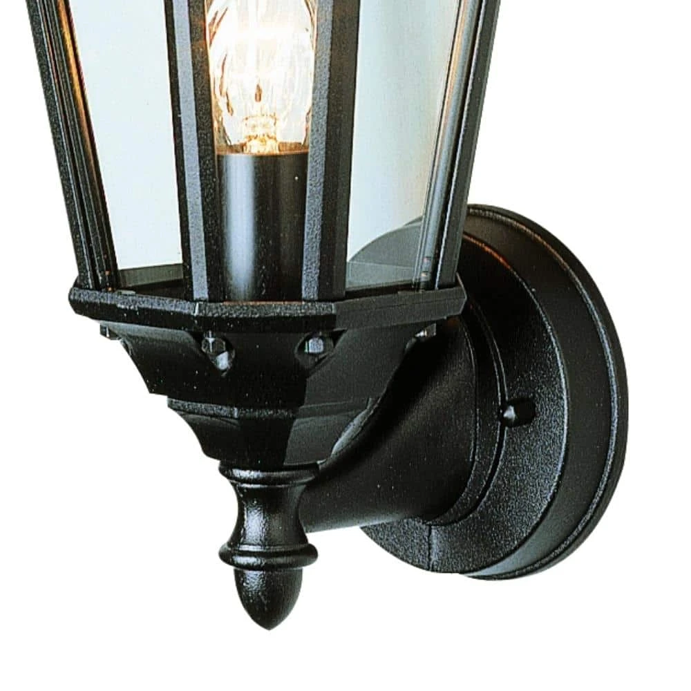 This traditional outdoor wall lantern from Bel Air is ideal for adding area lighting to a variety of exterior living spaces. The wall light is inspired by coach-style lighting and features a tapered metal frame that sits atop a decorative arm, attaching it to the round wall plate. The fixture is fully enclosed by windows of clear glass, protecting the single light bulb inside from harsh weather conditions. In addition to providing protection for the bulb, the transparent glass allows an ample amount of light to shine out from the bulb in the fixture. The sconce is finished in black to coordinate with a variety of exterior home styles and with existing black-finished fixtures and hardware. Install this outdoor wall light on either side of a garage door to light up your home’s driveway, near porch entryways and access points, or along pathways and steps.