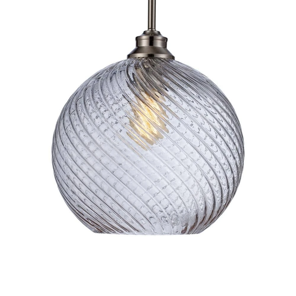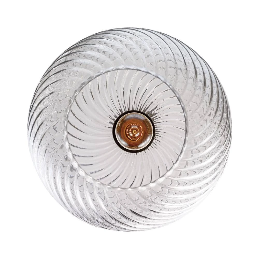 - Clear glass globe shade with swirl pattern is open at the bottom