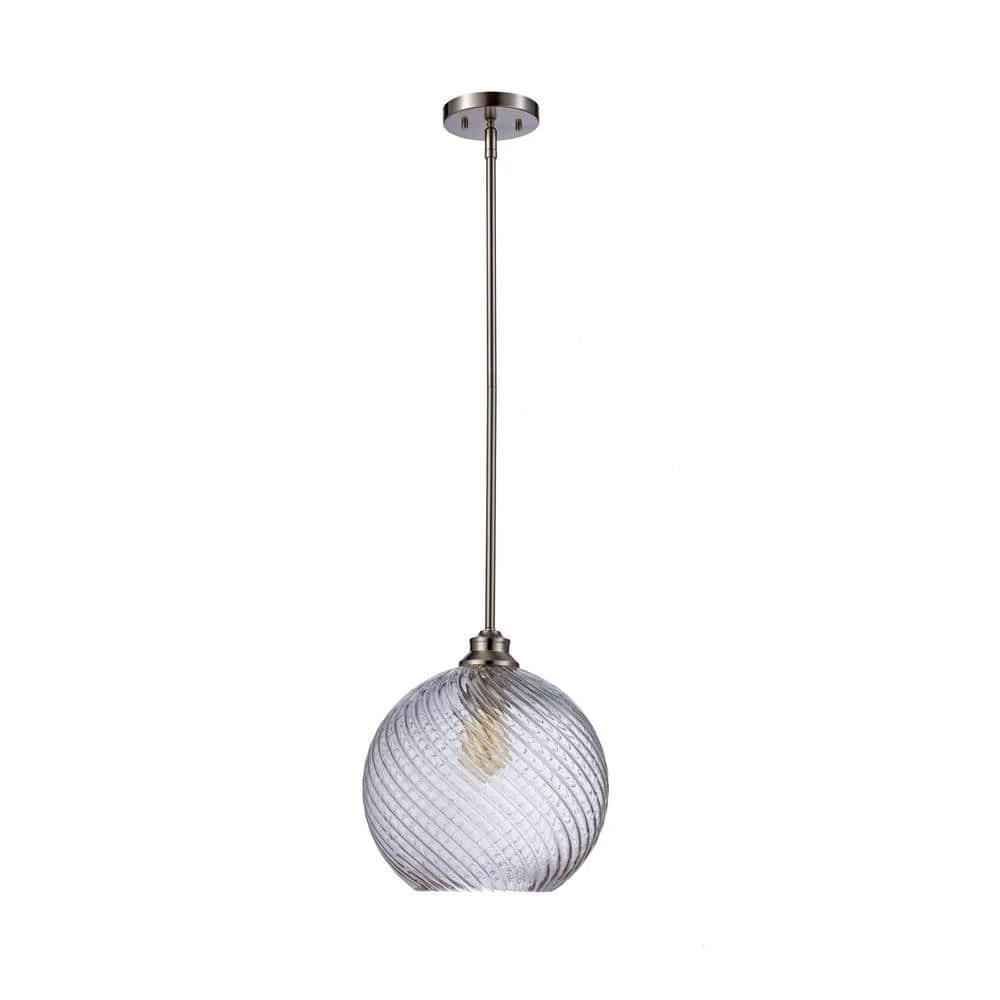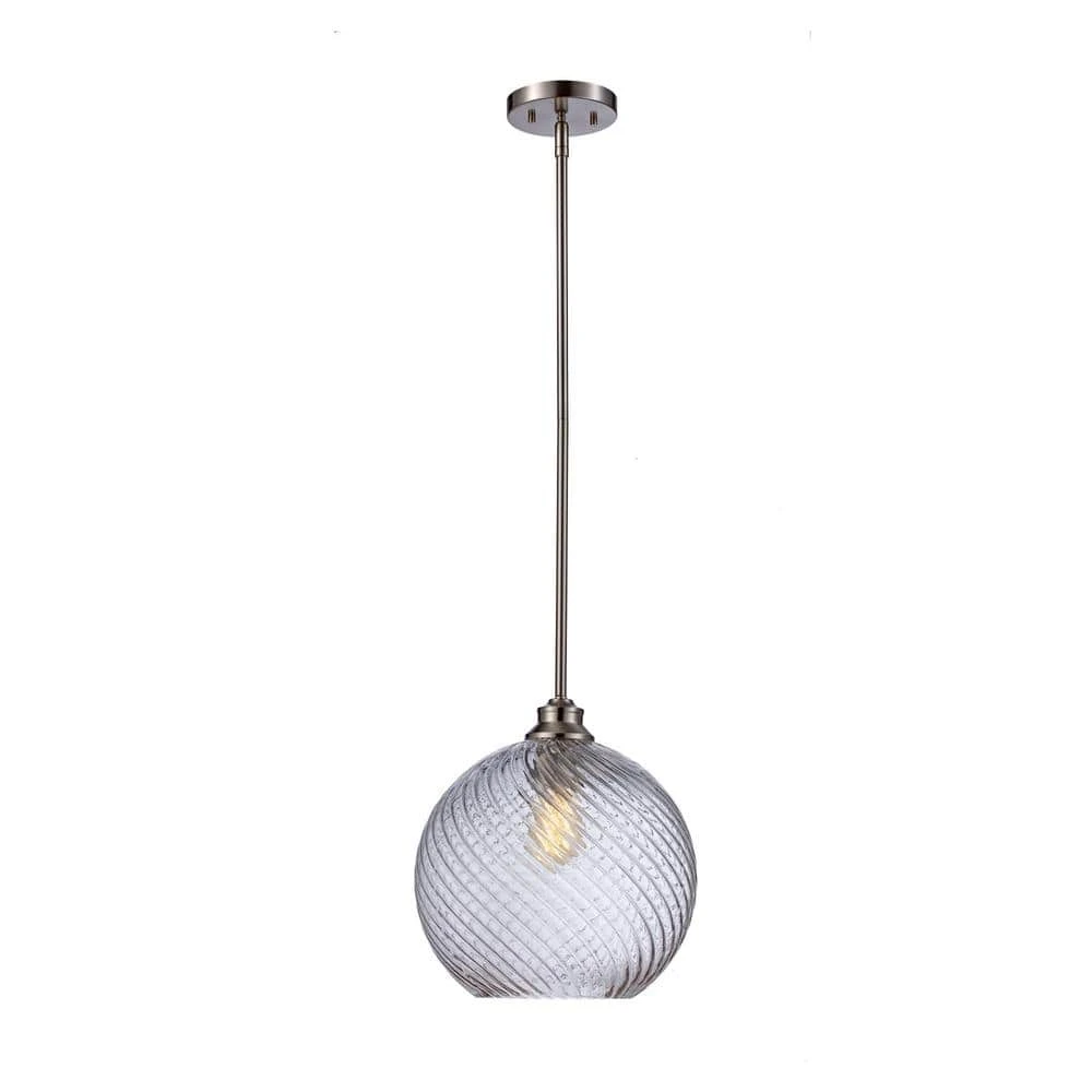 This transitional pendant from Bel Air Lighting is designed to suit a variety of home decor styles from farmhouse to modern. The globe pendant is a decorative hanging light that works well in dining areas, kitchens, and foyer entrances. Use as a single unit over a dining room table, or install as a set over a linear kitchen island or bar table for additional illumination in larger spaces. The fixture is constructed of brushed nickel-finished metal and includes a circular ceiling plate and a clear glass orb-shaped shade. The glass is ribbed with a swirling texture, houses a single bulb inside, and is open at the bottom for easy access to change the bulb and for directional lighting in the space below. The pendant body hangs from matching nickel extension rods, of which multiple extras are included for an adjustable height.