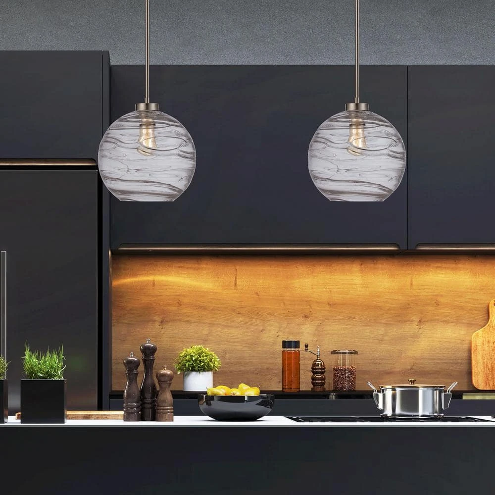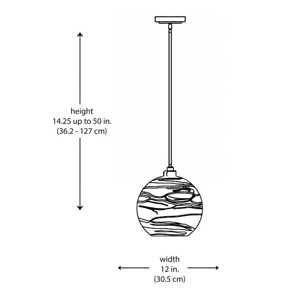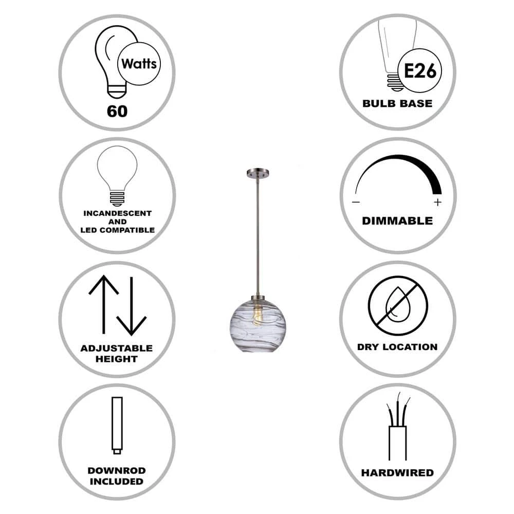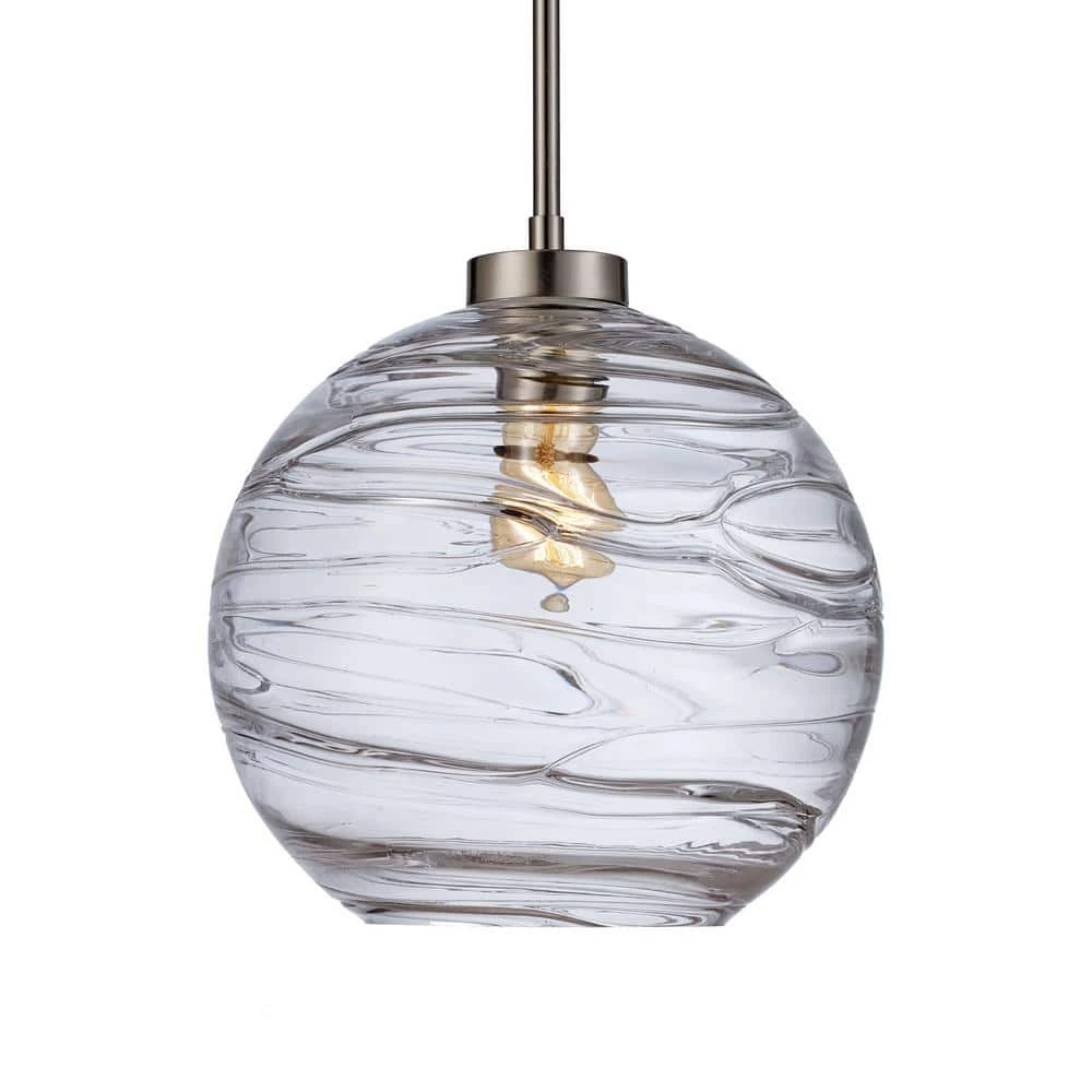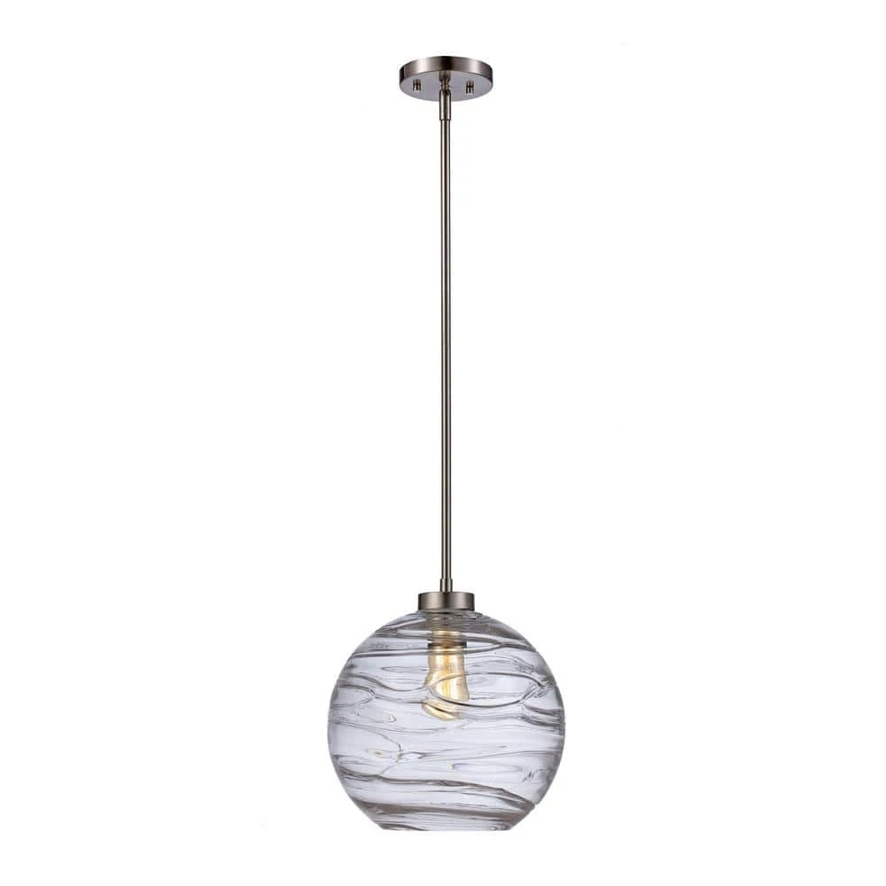 This unique pendant from Bel Air Lighting exhibits a modern and fresh take on the traditional globe pendant, offering a decorative and functional upgrade to your kitchen or dining room spaces. The orb shade features abstract, soft swirls throughout the glass and an open bottom design to allow easy access to the single light bulb inside. The wave pattern glass adds interest to the piece without compromising light output. The glass hangs from a brushed nickel extension rod and brushed nickel ceiling canopy. Additional extension rods are included for an adjustable hanging height. This pendant looks beautiful as a single piece, but also works well hung as multiples over a kitchen island or bar table.