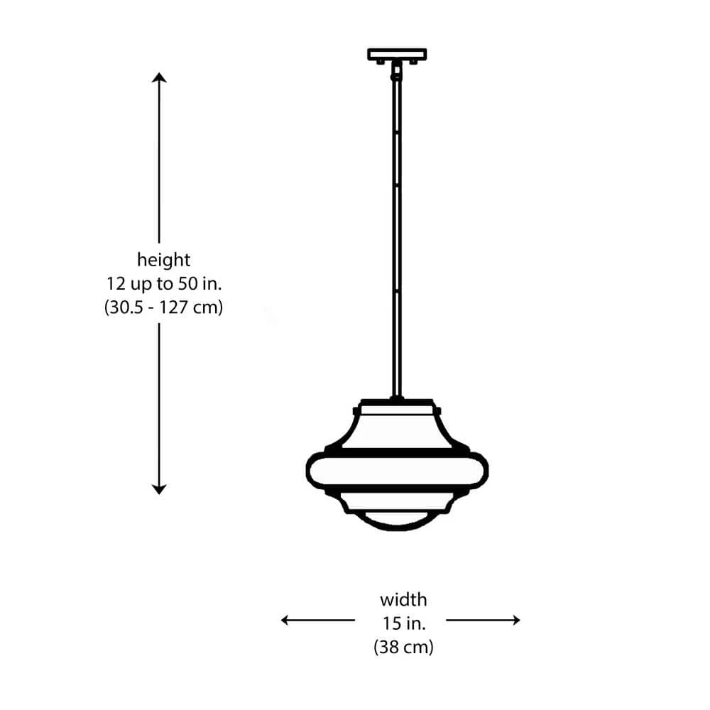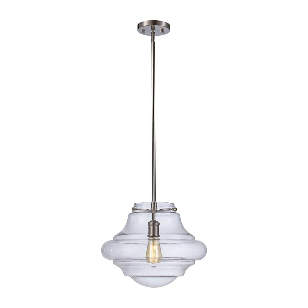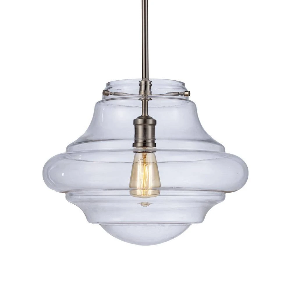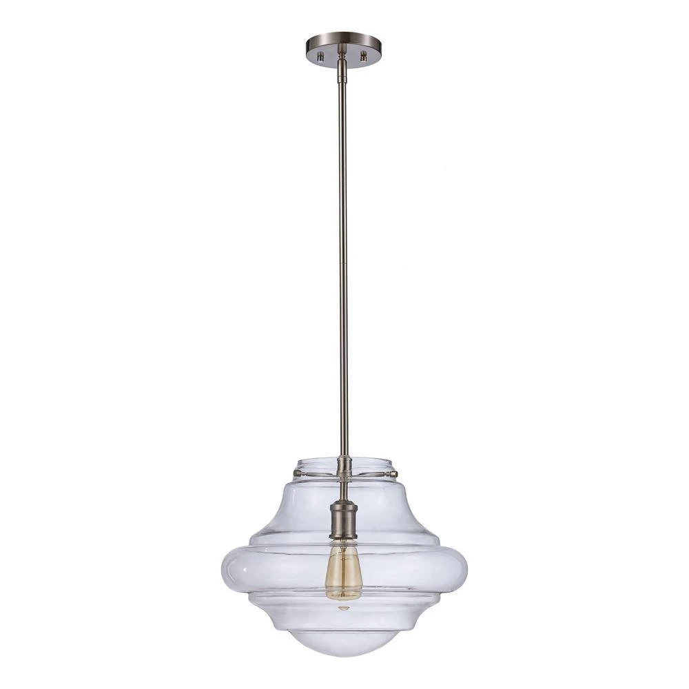This transitional pendant from Bel Air Lighting is designed to suit a variety of home decor styles from farmhouse to modern. The globe pendant is a decorative hanging light that works well in dining areas, kitchens, and foyer entrances. Use as a single unit over a dining room table, or install as a set over a linear kitchen island or bar table for additional illumination in larger spaces. The fixture is constructed of brushed nickel-finished metal and includes a circular ceiling plate and a clear glass schoolhouse-shaped shade. The glass is ridged and bubbles out from the center of the fixture, houses a single bulb inside, and is fully enclosed to protect the bulb. The pendant body hangs from matching nickel extension rods, of which multiple extras are included for an adjustable height.