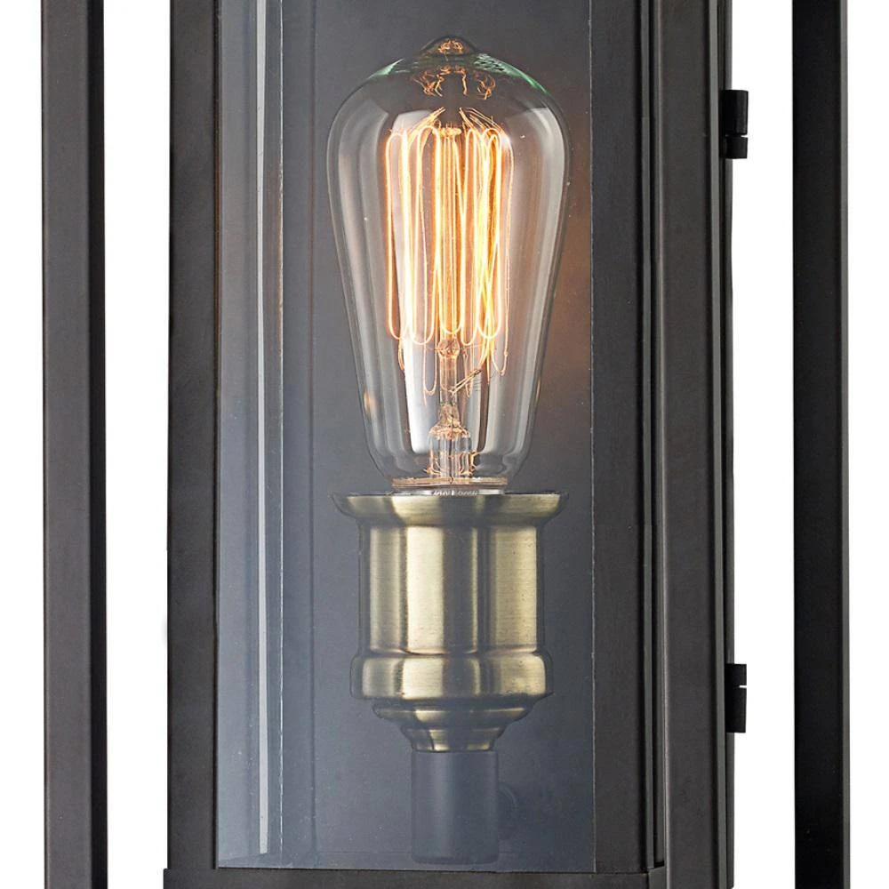 The Showcase Collection from Bel Air exhibits industrial inspired outdoor wall lights designed for modern and transitional styled homes. Each wall sconce in the Showcase family features a sleek finish, a vintage bulb socket, metal frame, and clear glass windows. The 11 inch tall model is the smallestin the collection and is finished in rubbed oil bronze to coordinate with existing bronze outdoor decor. The metallic antique brass socket is exposed, contrasting the dark finish on the frame, and an Edison style filament bulb is recommended to highlight the retro-industrial theme. A clear glass door on the front of the fixture opens on hinges to allow easy access to the bulb when needed. This sconce is ideal for use in porch spaces, backyard decks, near exterior entry points, and along outdoor walkways.