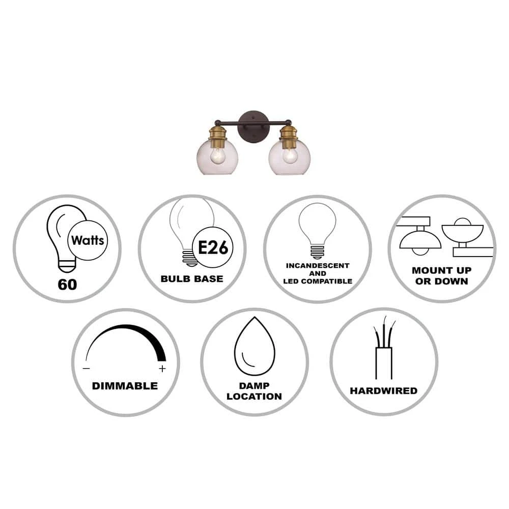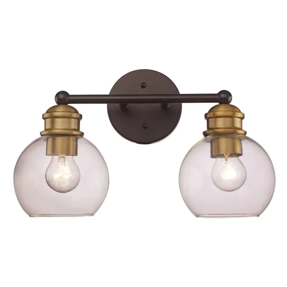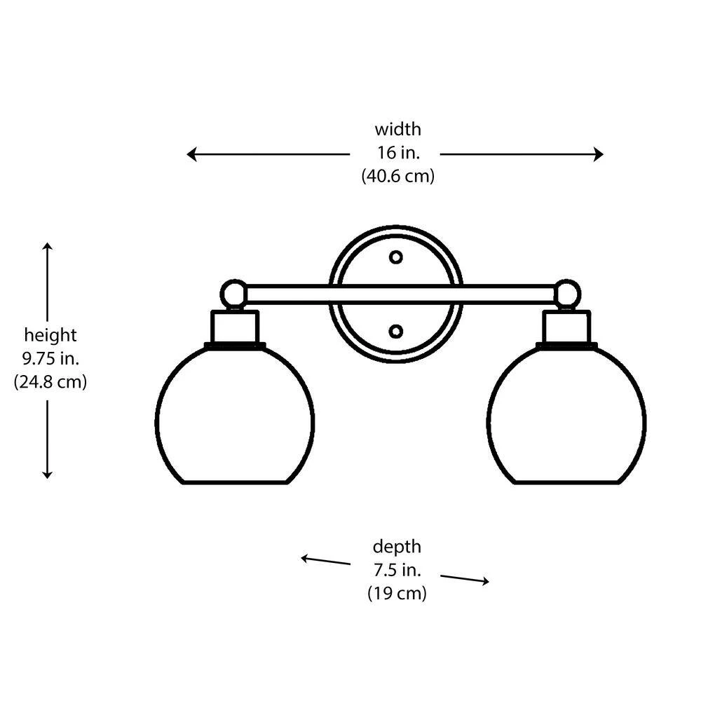 This vanity collection from Bel Air draws on midcentury and industrial design themes for a series of wall lights that are truly unique. The 2-light fixture is the smallest in the collection, measuring 16 inches wide. The size is ideal for smaller single vanities and sinks, or for use as a set over a double sink. A black finish is paired with antique gold metallic socket covers that capitalize on the trendy two-toned finish look and add an industrial farmhouse appeal. Two clear glass globe shades are included, and are open at the bottom. The light bulbs are fully visible inside the transparent glass allowing for maximum light output in your bathroom and powder room spaces. Mount this vanity light over a bathroom mirror with the shades facing up or down for a customized look.