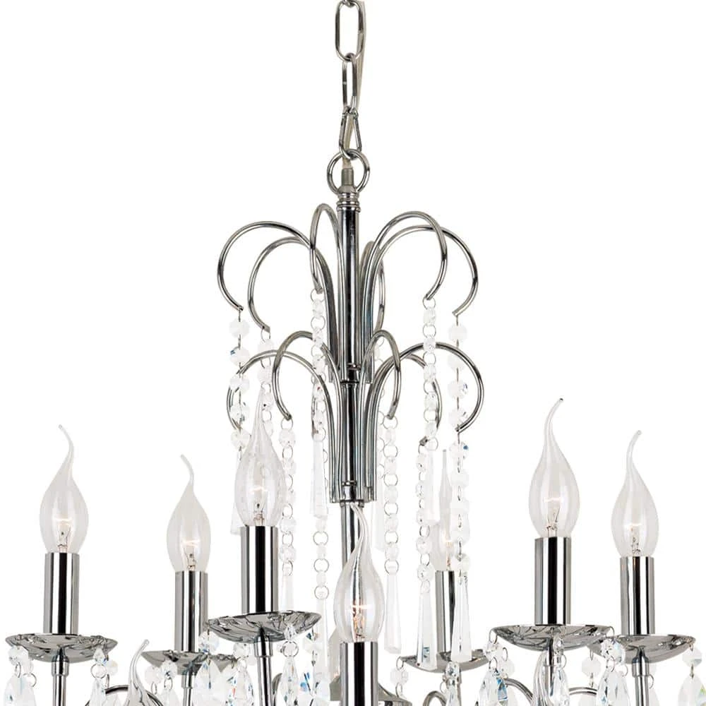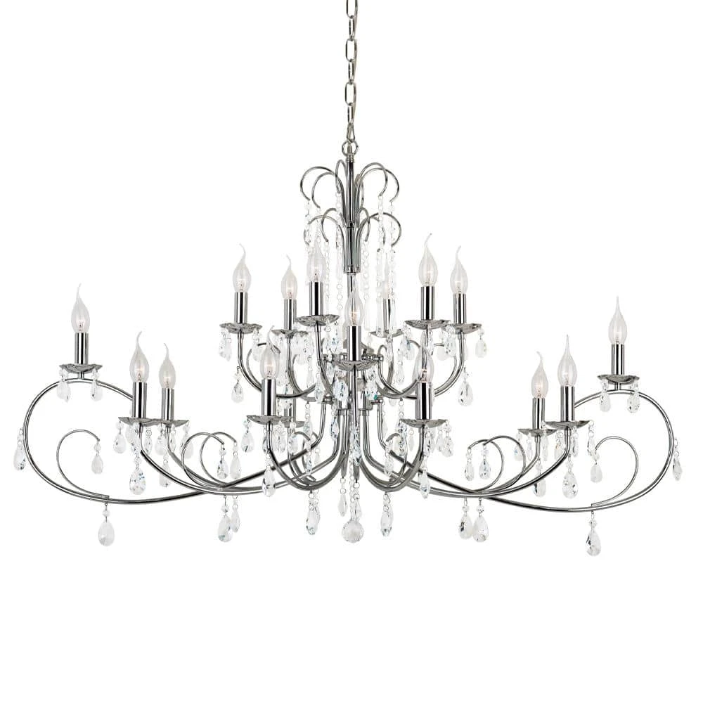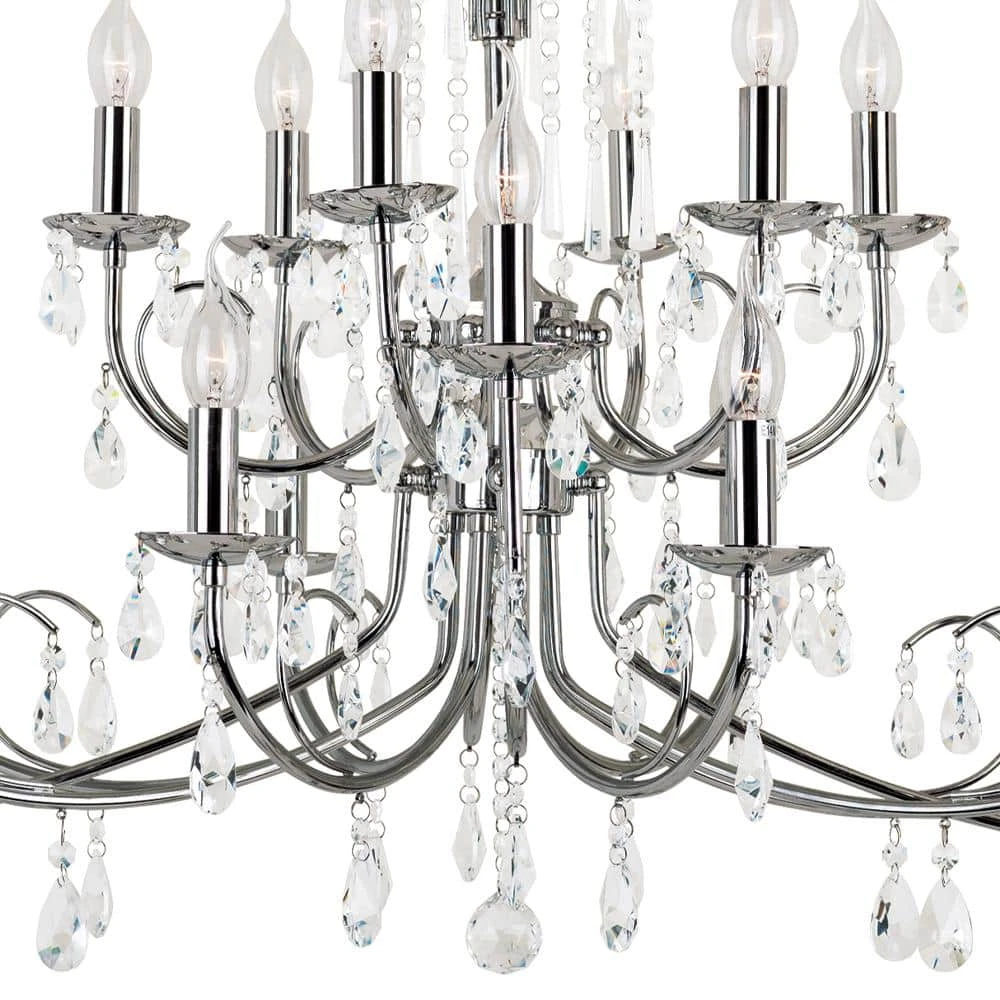 This crystal chandelier from Bel Air Lighting is a glamorous way to bring decorative, functional illumination into your home’s foyer entryway and dining room spaces. The classic tiered design is upgraded into the modern age with a multitude of cascading crystal beads that hang delicately from the decorative support arms. Each of the 18 candelabra bulb sockets perch on a round dish, creating a candle-style design. The polished chrome hardware and crystal beads work in harmony to reflect and refract the light from the bulbs, providing even brighter illumination. The width of this chandelier is twice the depth, offering a linear style that works well over dining room tables. The chandelier body hangs from a matching chrome chain allowing for height adjustability and sloped ceiling compatibility.