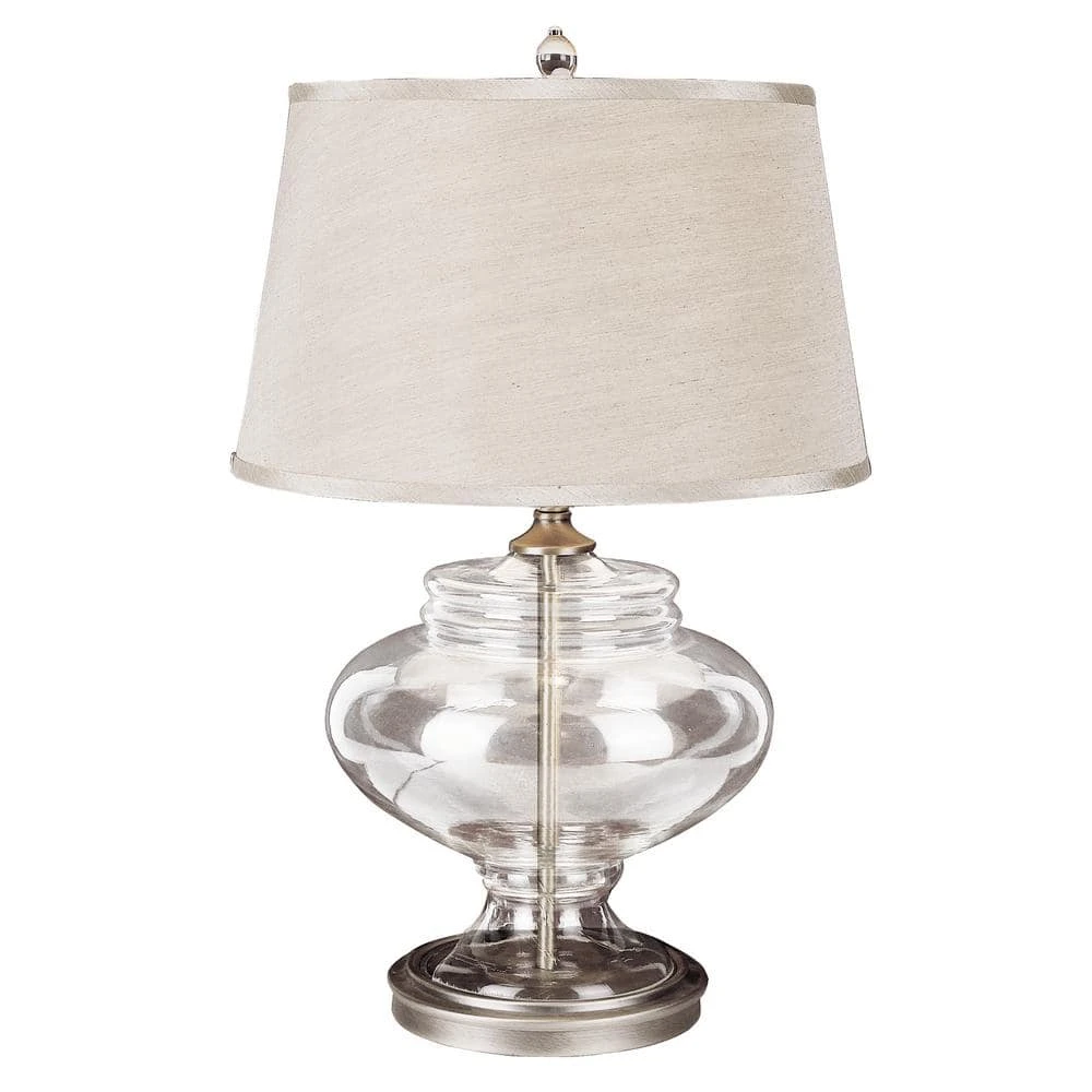 This updated-traditional table lamp from Bel Air Lighting is a stylish way to bring functional illumination into your home’s bedrooms, living spaces, office, and more. The unique design features a brushed nickel metal base, transparent blown glass centerpiece, and a matching decorative nickel finial that sits above the shade. The off-white fabric shade has a tapered drum shape that compliments the clear glass and metallic trim beautifully. A single bulb is housed inside the shade, and a 3-way control switch is included for customized brightness; choose the lower light setting for accent lighting or night, or the brighter setting for task lighting.