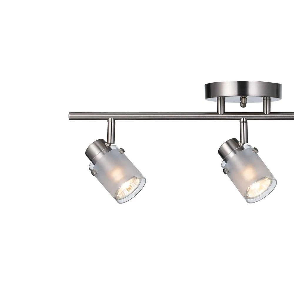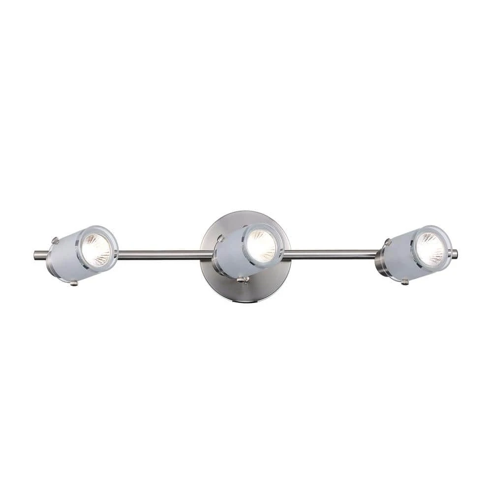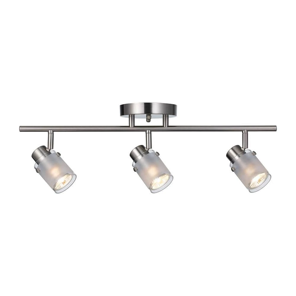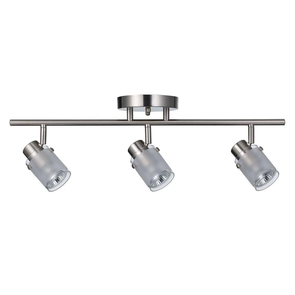 This contemporary track light from Bel Air is a single track, semi flush ceiling fixture designed to provide diffused task and accent lighting in any bedroom, entryway, kitchen, or dining room. The piece is finished in a metallic brushed nickel, a neutral tone that will coordinate seamlessly with a variety of interior decor styles and existing stainless steel appliances and hardware when being used in a kitchen. Each of the three halogen light bulbs is shaded by a frosted glass cylindrical shade that is open at the bottom to provide directional lighting. The pairing of metallic and frosted glass with the sleek lines present throughout the light lends itself to the contemporary style. Each of the track heads can be swiveled and adjusted independently of one another for directional spot-lighting. This style track unit is also available in a four light version.