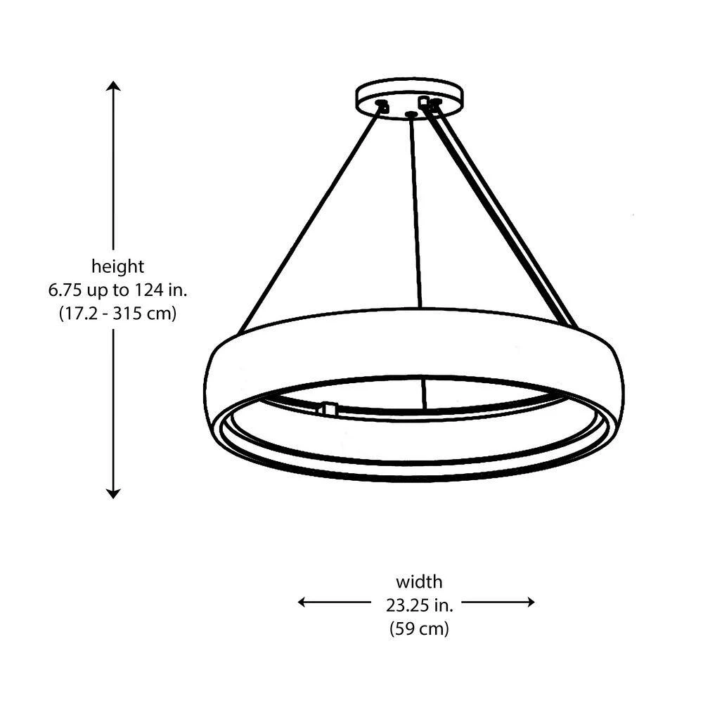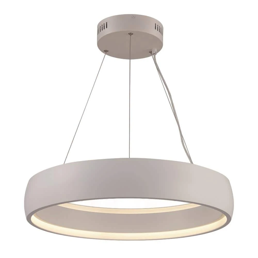 This LED pendant from Bel Air Lighting is a modern ceiling light designed to suit a variety of home decor styles from transitional to contemporary. The pendant is a decorative hanging light that works well in dining areas, kitchens, and foyer entrances. Use as a single unit over a dining room table, or install as a set over a linear kitchen island or bar table for additional illumination in larger spaces. The round ringed shade is constructed of metal, finished in white, and includes two strips of LED lights inside that are diffused by frosted glass. The integrated LED lights are low maintenance as you will never need to replace the bulbs for the life of the fixture. The simplified design and neutral finish lends a minimalist style that will add a clean look to your home’s decor. The pendant body is suspended from three independent hanging wires that allows for an adjustable hanging height.