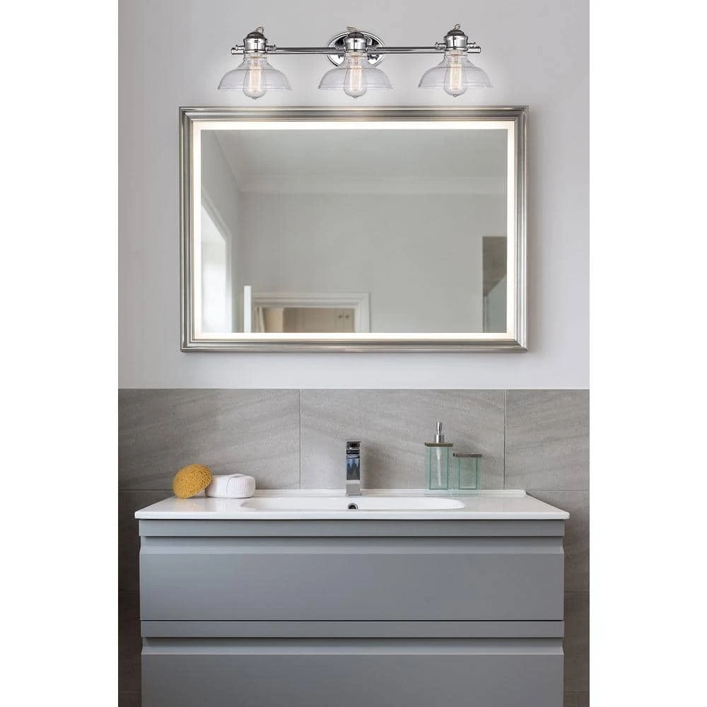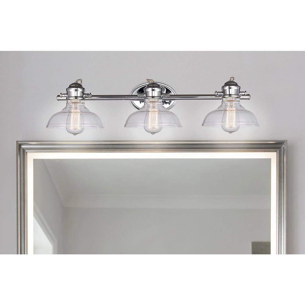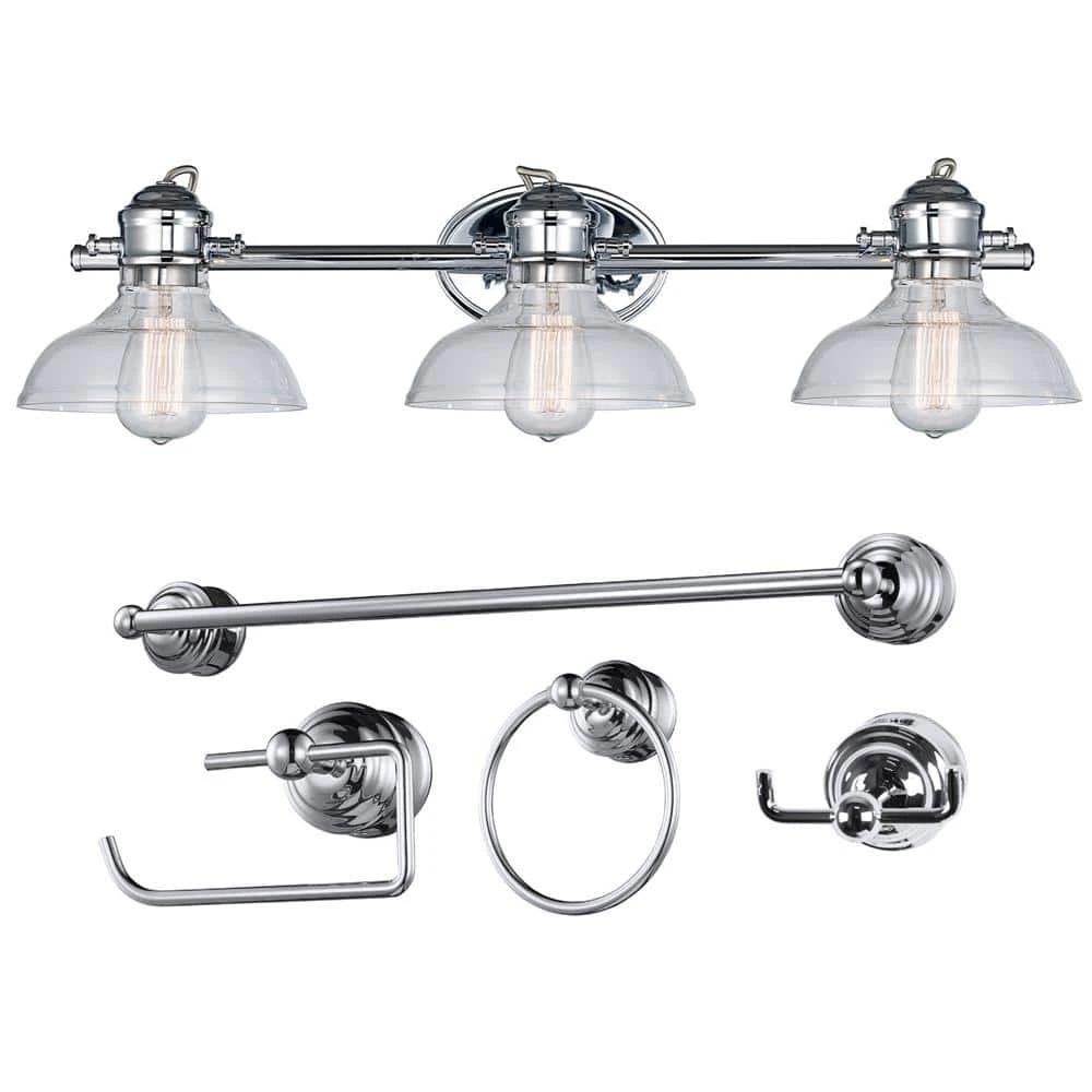 This vanity kit from Bel Air Lighting includes everything you need to renovate your bathroom or powder room. The coordinating set includes a three light vanity bar, a towel bar and towel ring hook, a robe hook, and a toilet tissue holder. Each piece is finished in a sleek, polished chrome that was designed to match with existing hardware and bathroom decor. The vanity fixture includes three schoolhouse shaped glass shades that are open at the bottom to allow the light from incandescent or LED bulbs to shine through without shadows. Vintage, Edison style filament bulbs are recommended to capitalize on the industrial styling of the set. Whether you’re updating your existing bathroom or building one from scratch, this bathroom set has all the fixtures you’ll need.