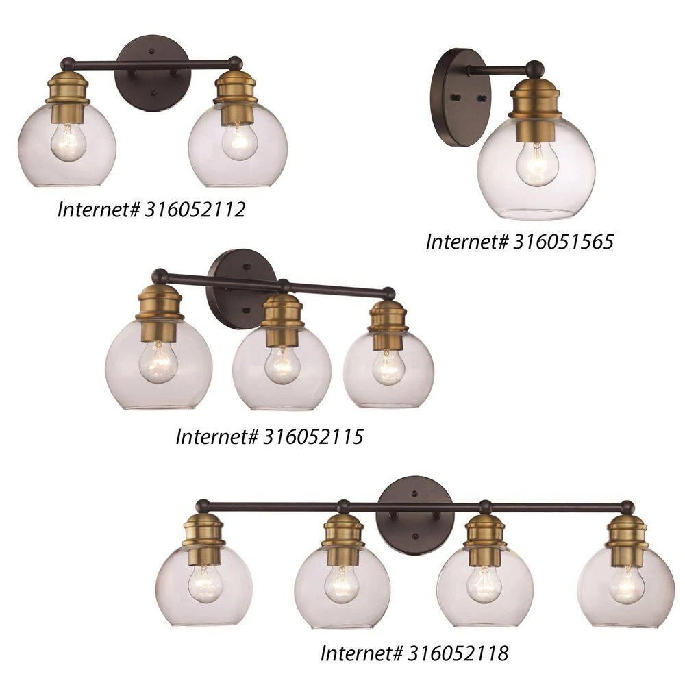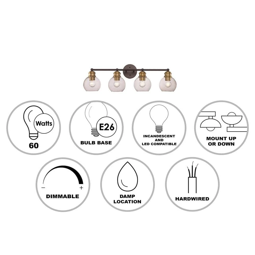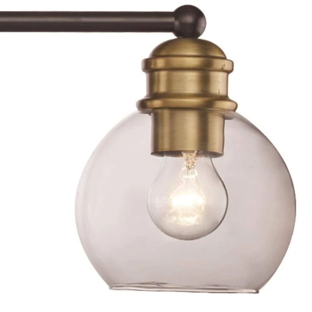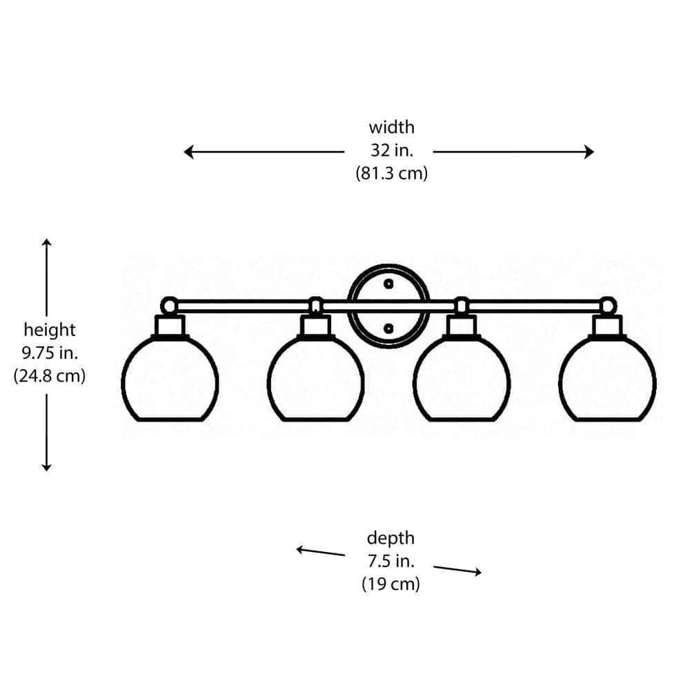 This vanity collection from Bel Air draws on midcentury and industrial design themes for a series of wall lights that are truly unique. The 4-light fixture is the largest in the collection, measuring 32 inches wide. The size is ideal for single vanities and sinks, or for use as a set over a double sink in a large bathroom. A black finish is paired with antique gold metallic socket covers that capitalize on the trendy two-toned finish look and add an industrial farmhouse appeal. Four clear glass globe shades are included, and are open at the bottom. The light bulbs are fully visible inside the transparent glass allowing for maximum light output in your bathroom and powder room spaces. Mount this vanity light over a bathroom mirror with the shades facing up or down for a customized look.