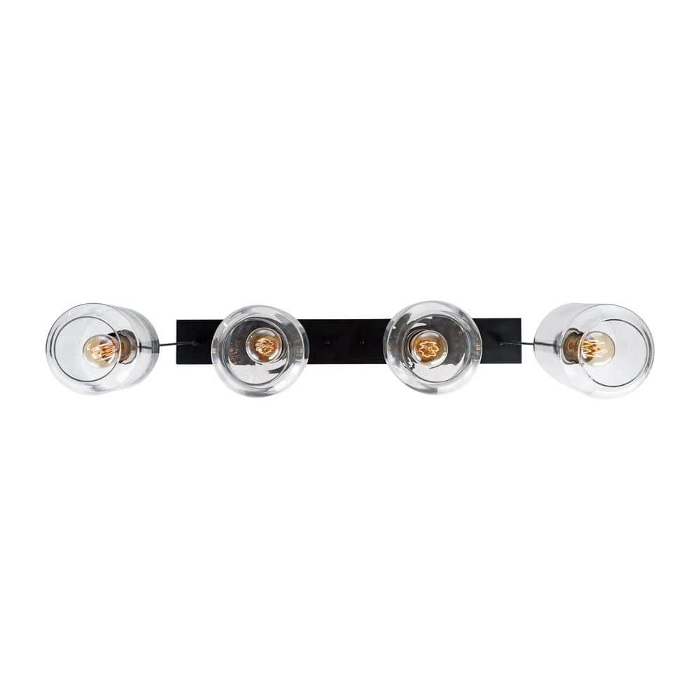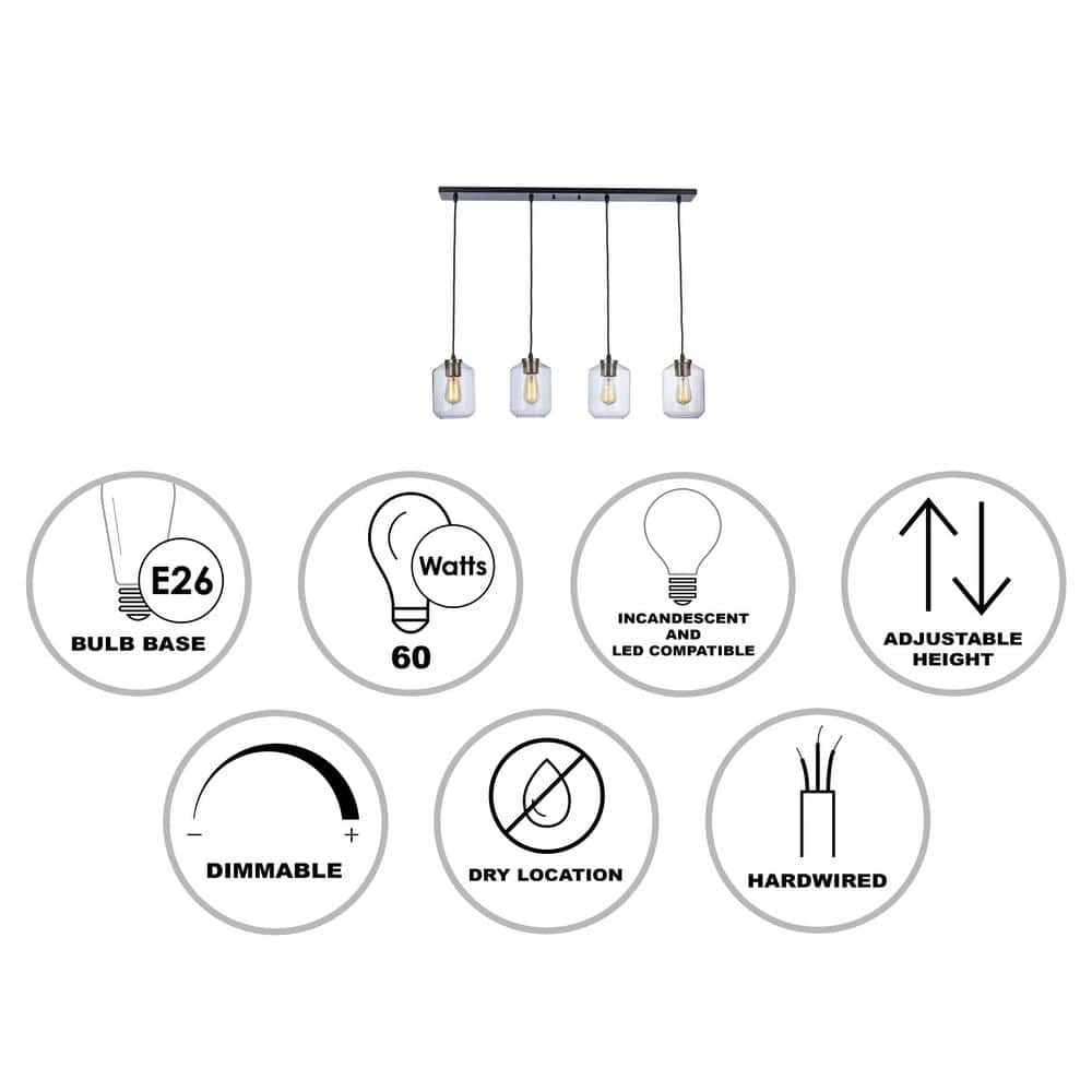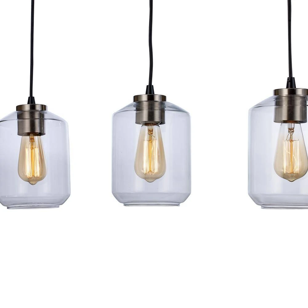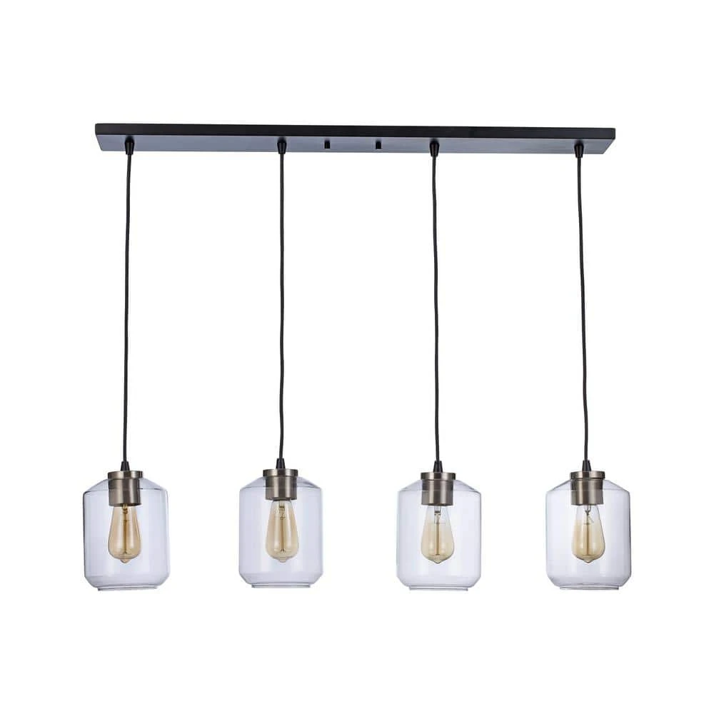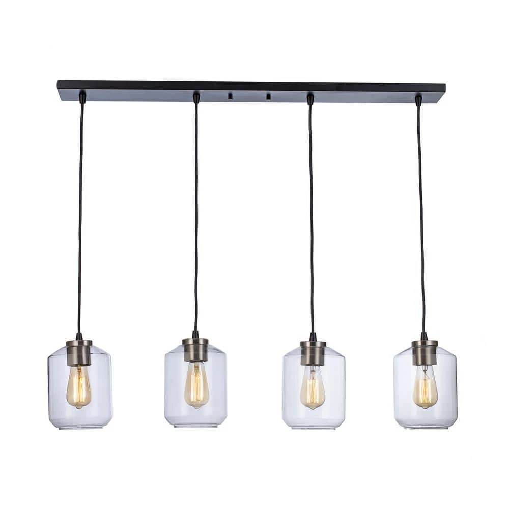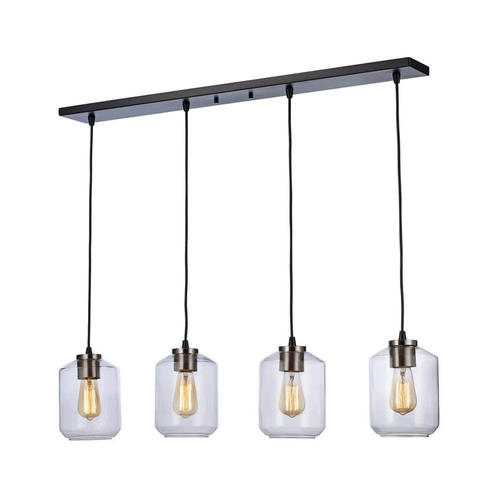 The transitional island pendant from Bel Air features a black finish with brushed nickel socket accents and mason-jar style clear glass shades. The piece evokes comfort and style while remaining fully functional, providing ample task lighting over a kitchen island or elongated dining room table. Each of the four glass shades houses a 60-watt down light bulb. Industrial, Edison style filament bulbs are recommended for added style (not included). The bulbs and glass shades hang from independent wires, offering height adjustability and sloped ceiling compatibility.