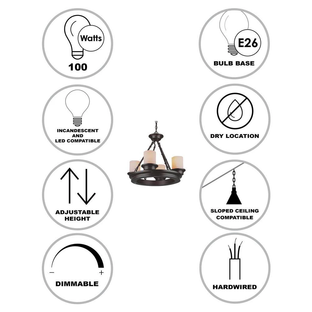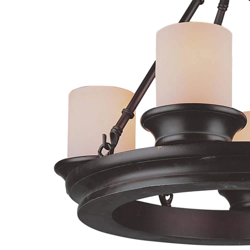 This chandelier from Bel Air Lighting combines classic styling with functionality, offering a piece that works well in dining rooms, kitchens, and foyer entryways. A warm rubbed oil bronze finish is contrasted with beige frosted glass for a look that is both classy and timeless. Each of the 4 cylindrical shades has been designed to mimic the look of votive candles with light illuminating out from the bulbs within. The shades sit atop a round, wagon-wheel style chandelier body which gives the fixture an added rustic appeal. The piece hangs from a matching bronze chain and round canopy, allowing for an adjustable height and sloped ceiling compatibility.
