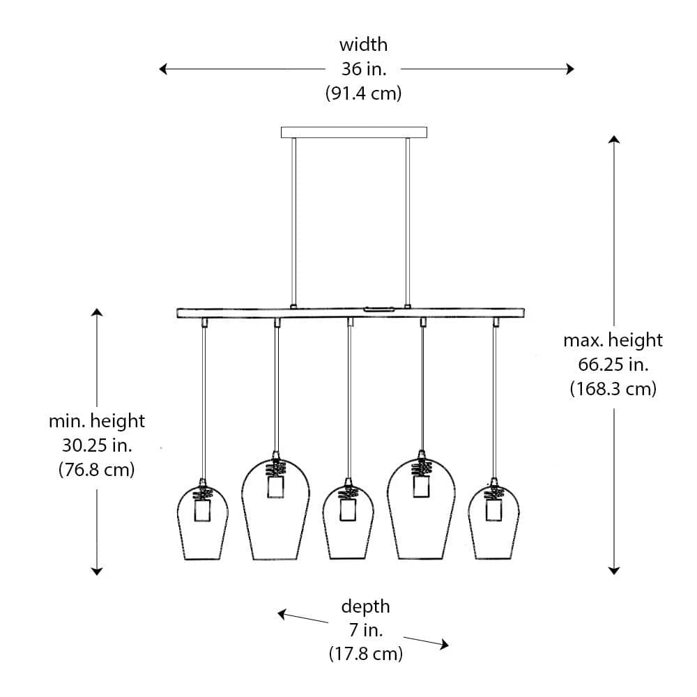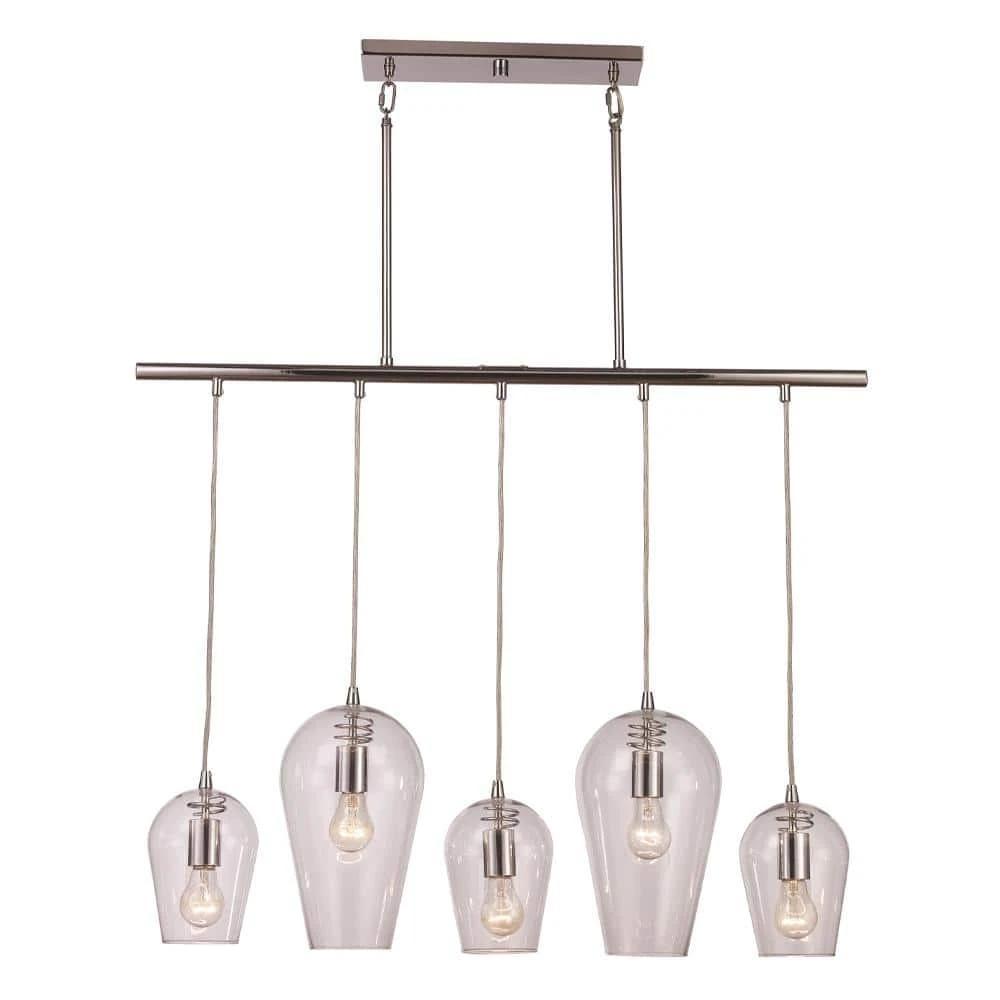 The Bel Air Lighting spiral socket island pendant is a unique way to bring functional, decorative illumination to your home’s kitchen and dining room spaces. The metallic polished chrome finish reflects the light from the five 60-watt bulbs while the clear glass shades allow the light to shine out brightly and uninterrupted. The highlight of the piece is the matching chrome spiral details capping each bulb socket; the spring-like shapes add contemporary appeal and unique decoration. The linear shape is ideal for use as a dining room light over a dining table, or island light in the kitchen. Each of the glass shades hangs from a transparent wire, while the cluster of lights hang from a set of extension rods. Additional extension rods are included with the fixture to allow for height adjustments.