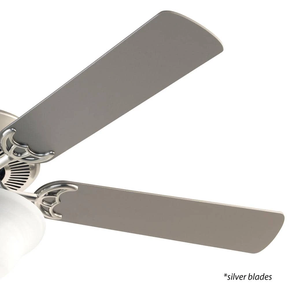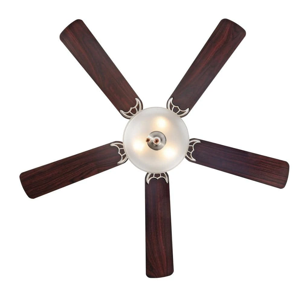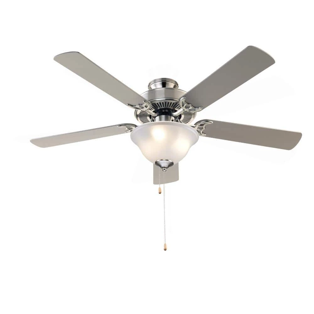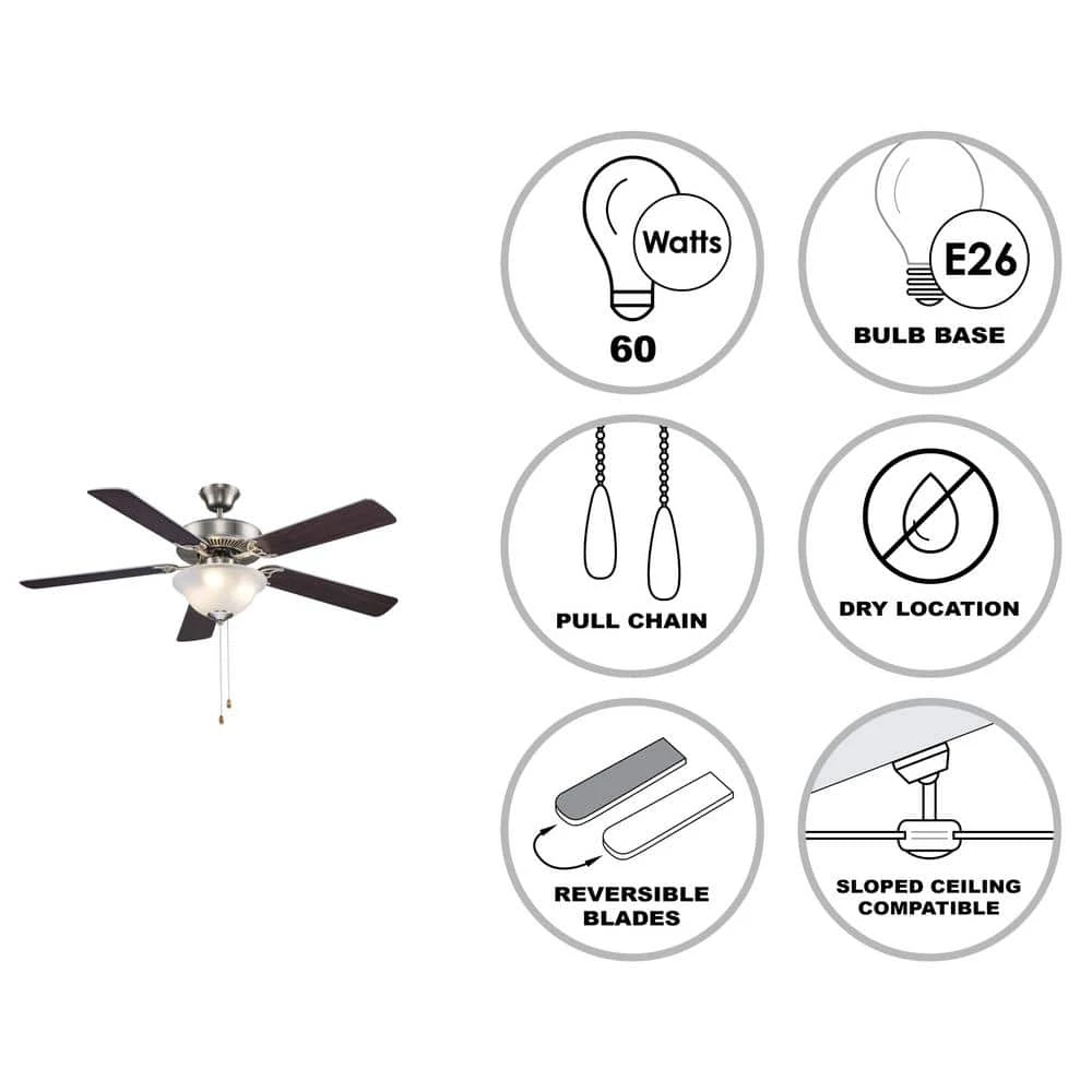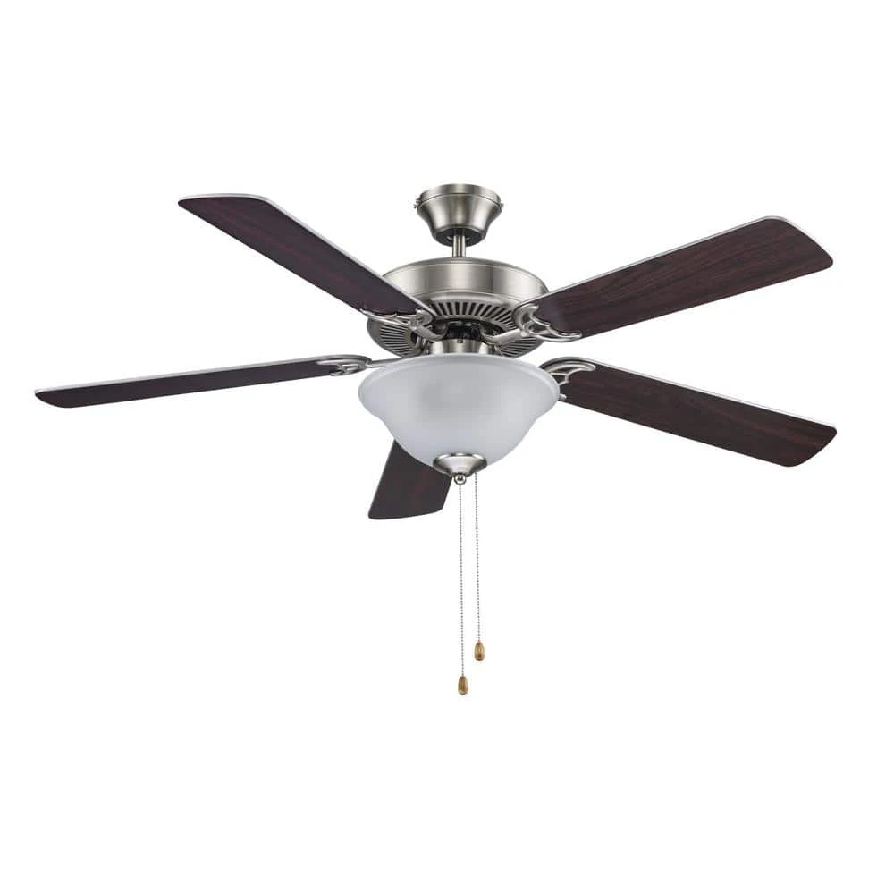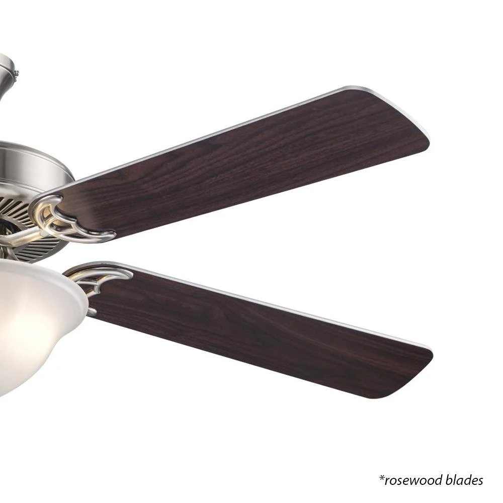 The Bel Air Lighting traditional ceiling fan is designed to add functional elegance to your home while providing refreshing air circulation, ample illumination and a pleasing design. This 52 in. round ceiling fan is featured in a traditional brushed nickel finish and includes 5 reversible blades for a customized look. Choose to display the warm-toned rosewood side of the blades or flip them over to display the silver side to match seamlessly with the nickel finish of the fan housing. The included light kit requires 3 energy saving LED bulbs, shaded by a white frosted glass bowl shade. The fan body mounts to a round ceiling plate and extension rod with angle mount hardware, allowing this unit to be installed on a sloped ceiling. Separate pull-chains are included, 1 to turn the lights on/off and the other to cycle through the 3-speeds of the fan. This traditional indoor ceiling fan is built to last and will compliment decor styles in a wide variety of home types. Mount in home offices, living rooms, bedrooms and more.