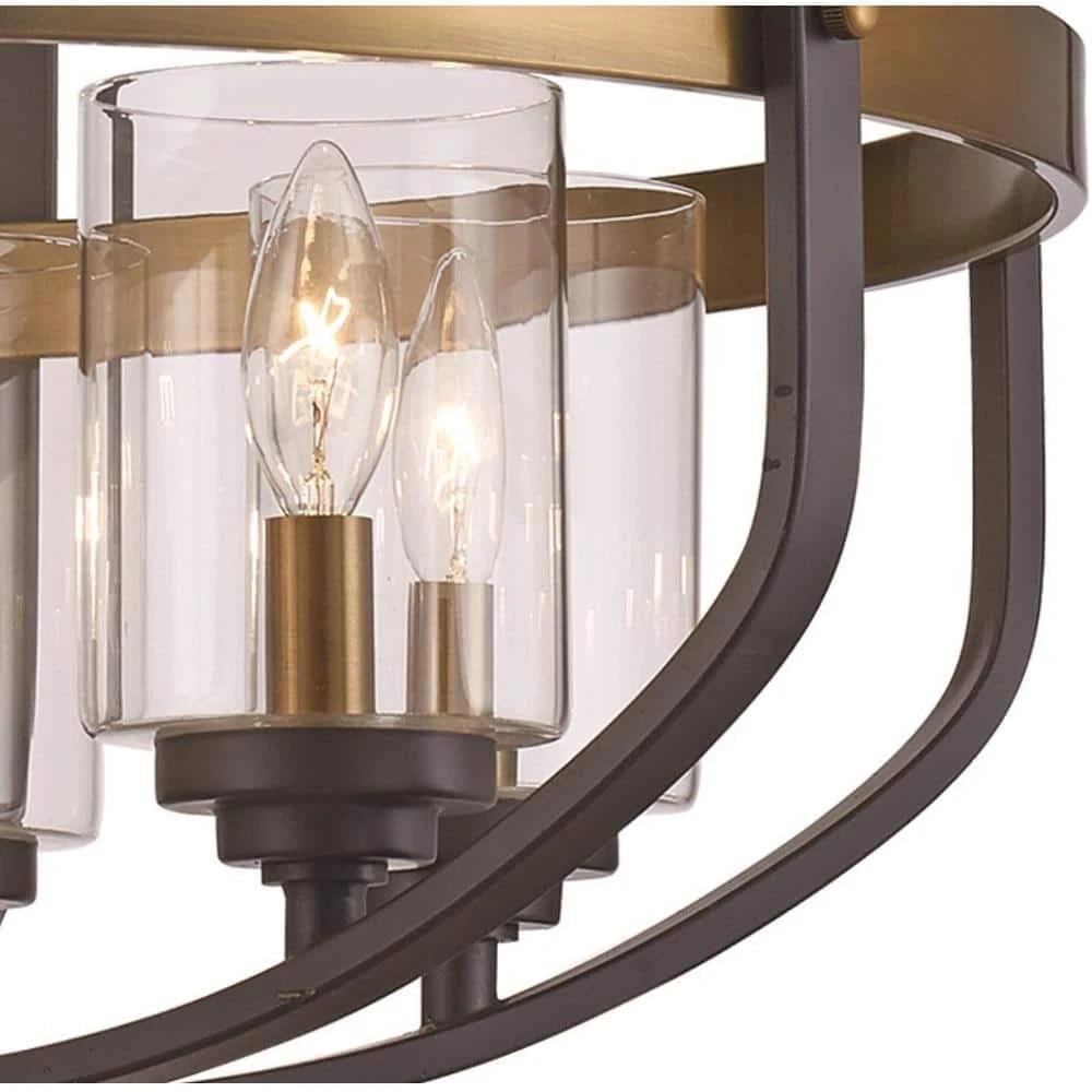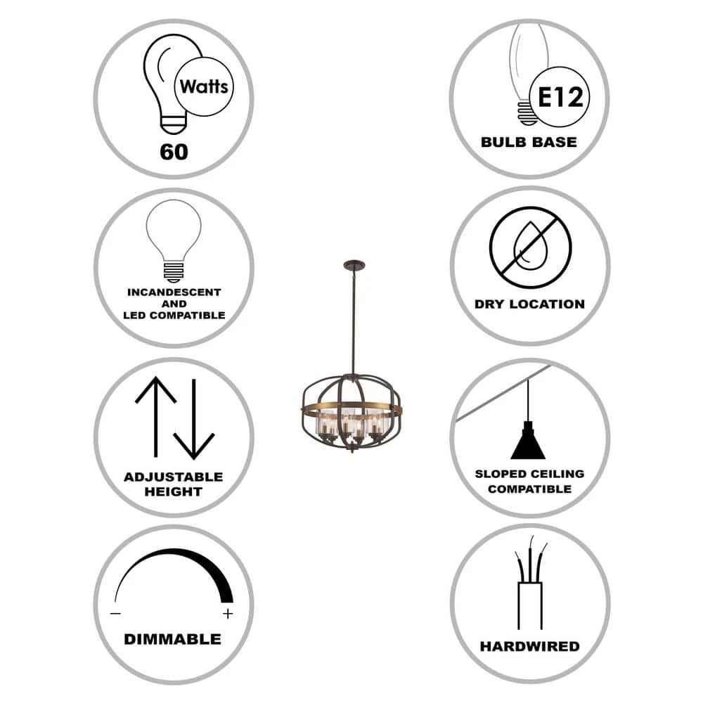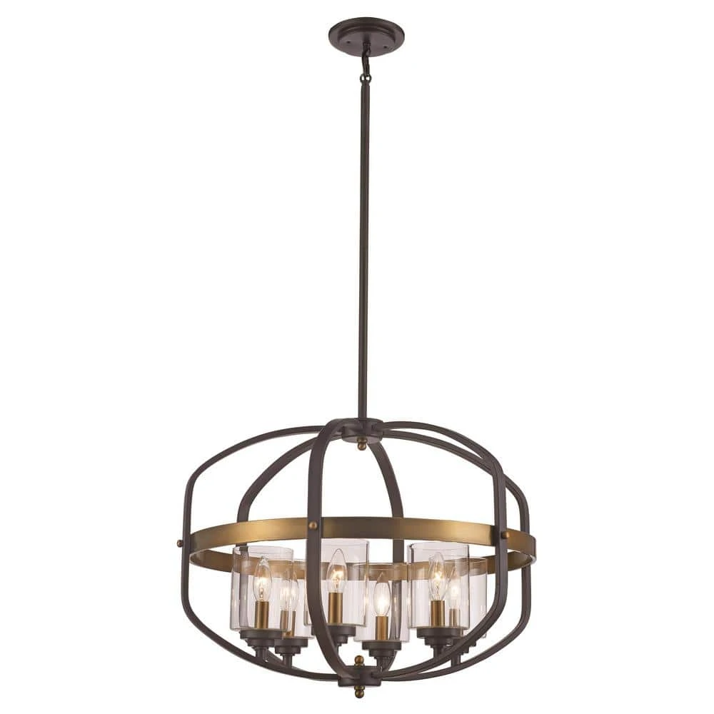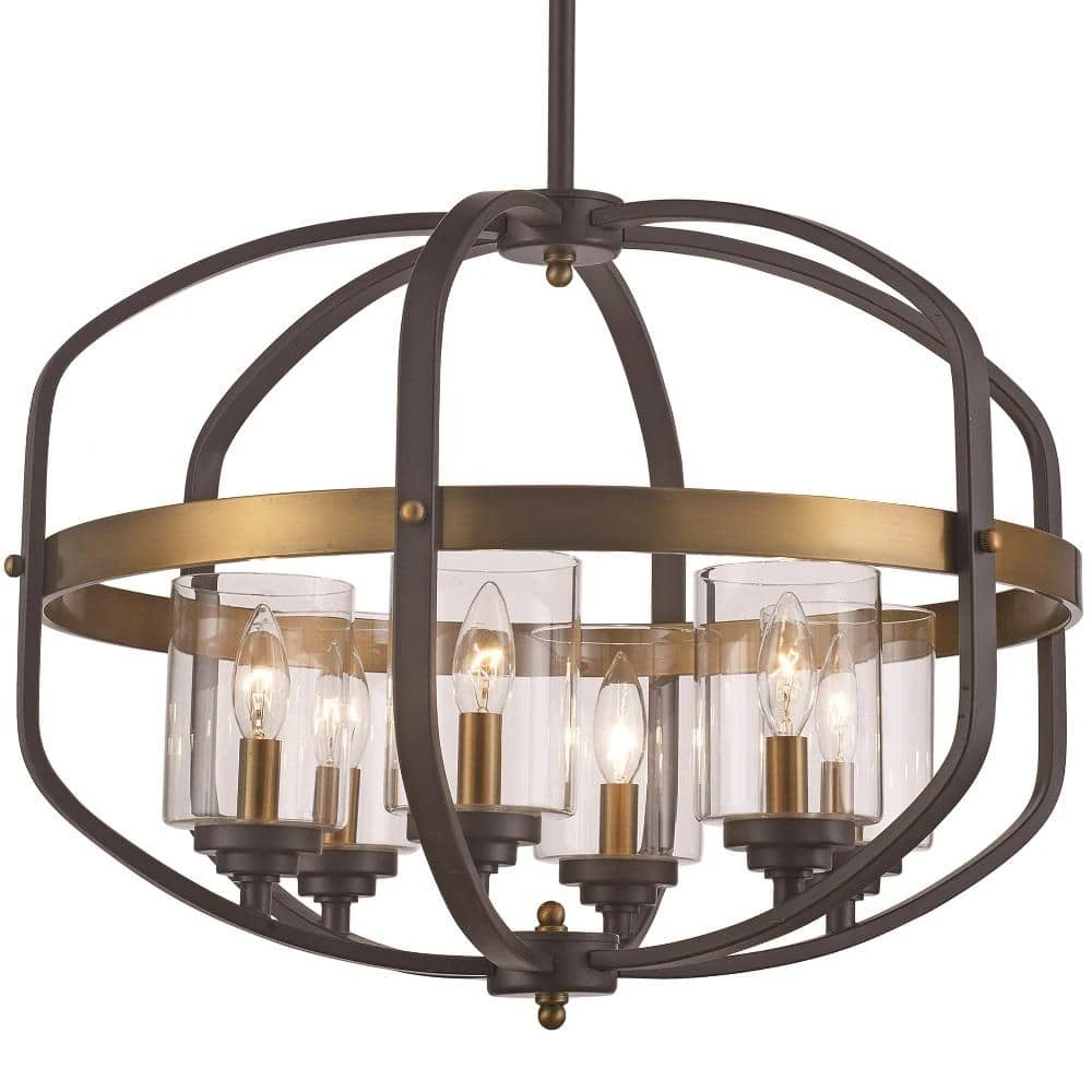 Enhance your home’s foyer entryway, kitchen, or dining room with the transitional styling of this six-light pendant. Highlighted by the trendy two-toned finish combination of rubbed oil bronze and antique gold, this metal pendant works well with a variety of interior decor styles form loft industrial to modern farmhouse. The rounded open-weave cage houses six clear glass cylinder shades, each of which holds a single candelabra light bulb (not included). The antique gold bulb sockets and metal ring complement the warm bronze finish beautifully, adding style and interest to the design. The pendant body hangs from connecting extension rods and chain hardware, allowing for sloped ceiling compatiblity and height adjustability.