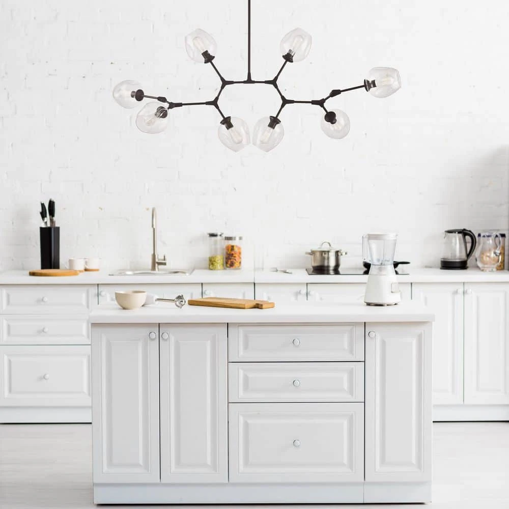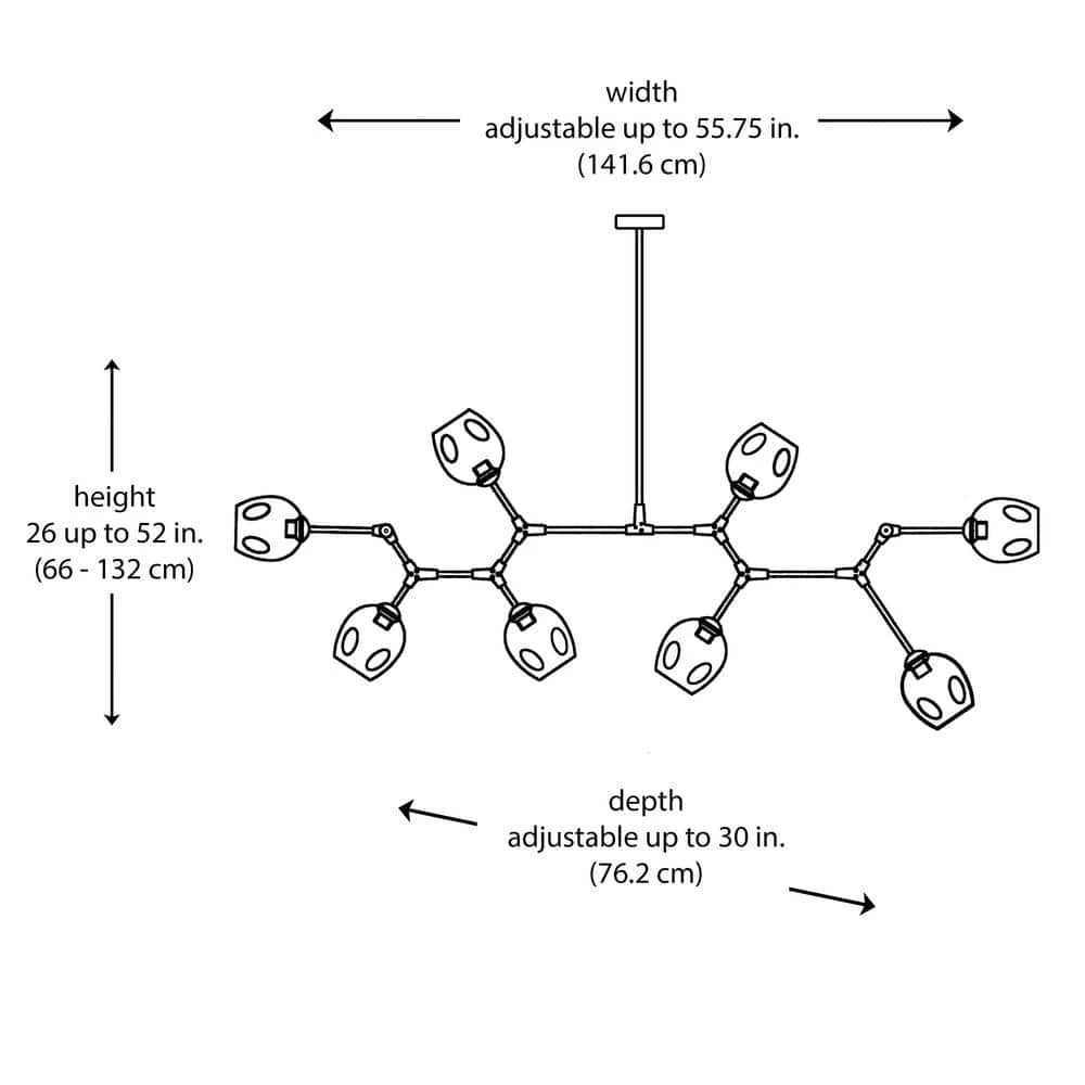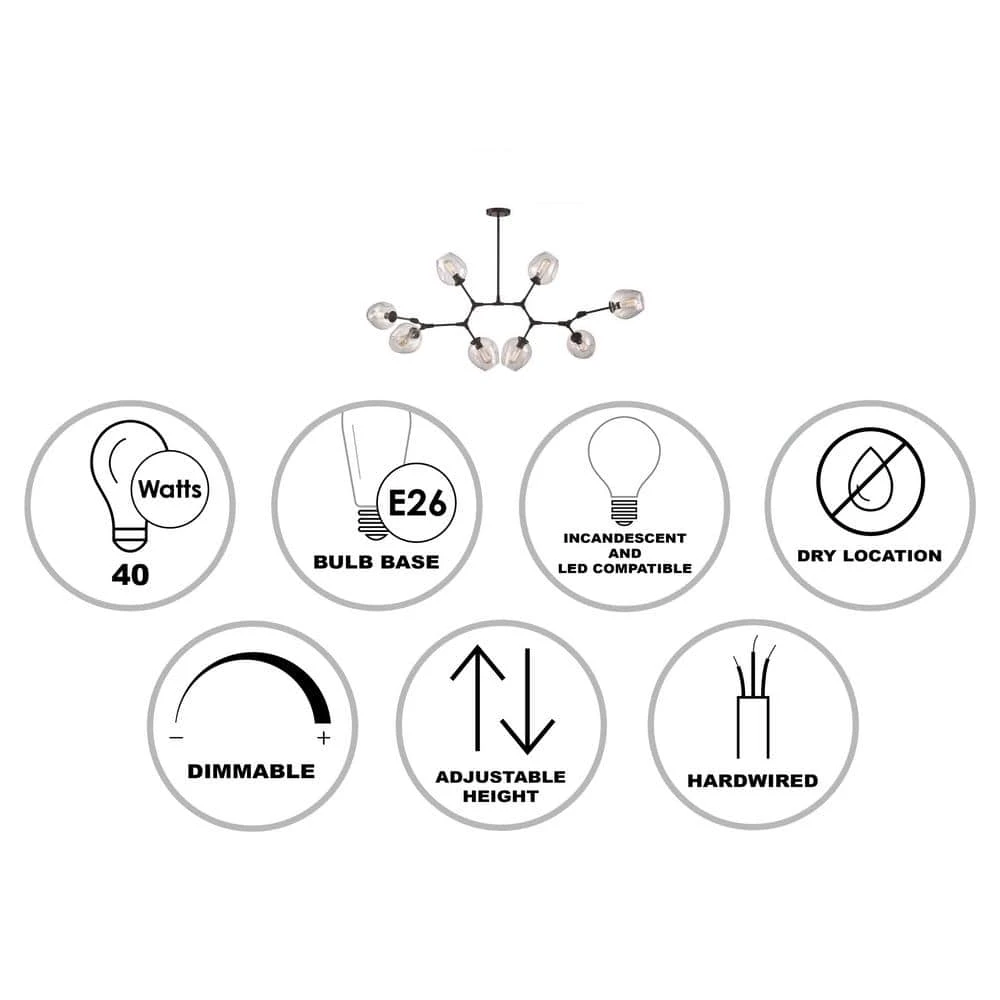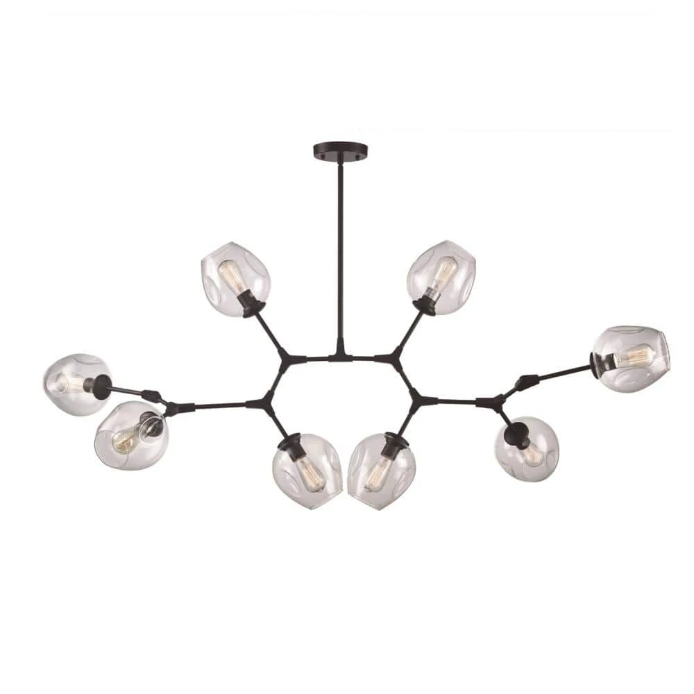 This midcentury-inspired sputnik pendant from Bel Air Lighting is designed to suit a variety of home decor styles from transitional to modern. The pendant is a decorative hanging light that works well in dining areas, kitchens, and foyer entrances. The fixture is constructed of black-finished metal and includes a circular ceiling plate and a series of eight moveable support arms that reach out in a starburst fashion to hold glass globe shades in place. The clear glass shades feature decorative dimple impressions, house a single light bulb each, and are open at the end for easy access to change the bulbs. Each arm can be adjusted for directional lighting, and to orient the fixture into a linear shape for use over a dining table or kitchen island. The pendant body hangs from matching black extension rods, of which multiples extras are included for an adjustable hanging height. Shop the collection for additional finishes and sizes.
