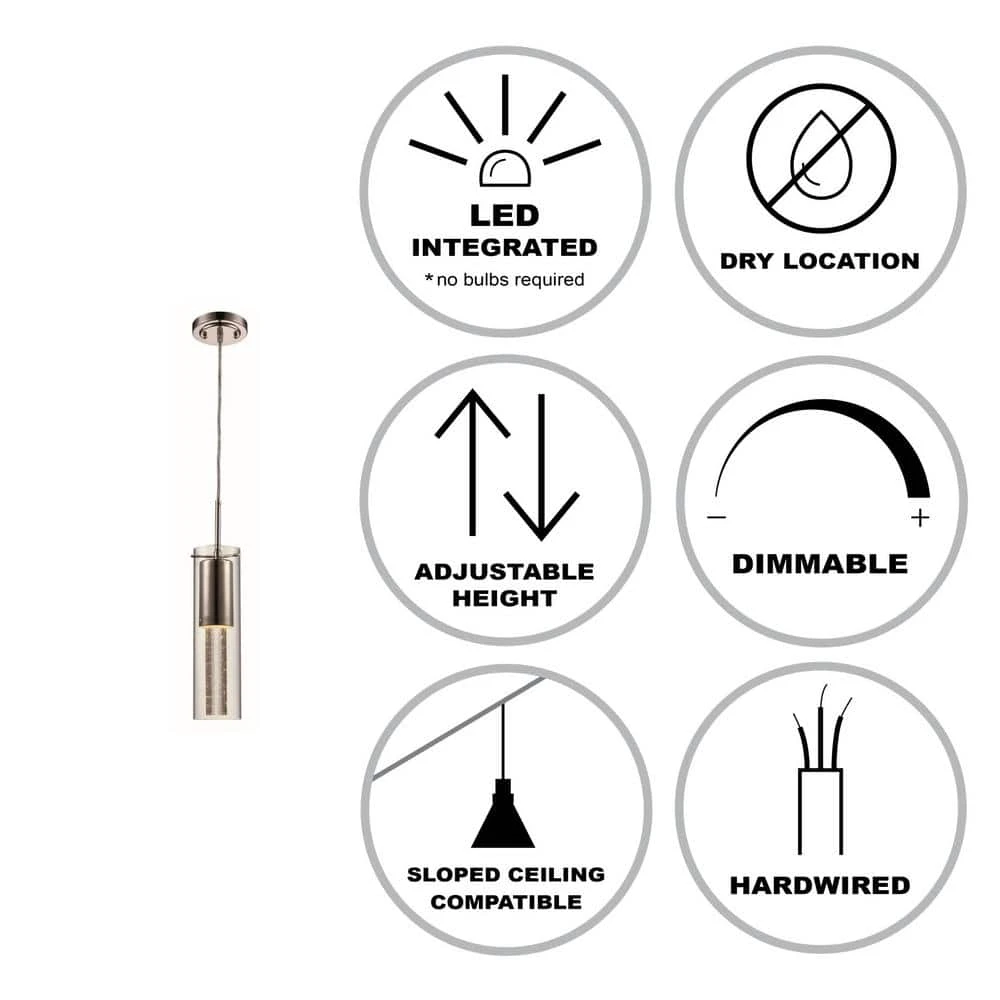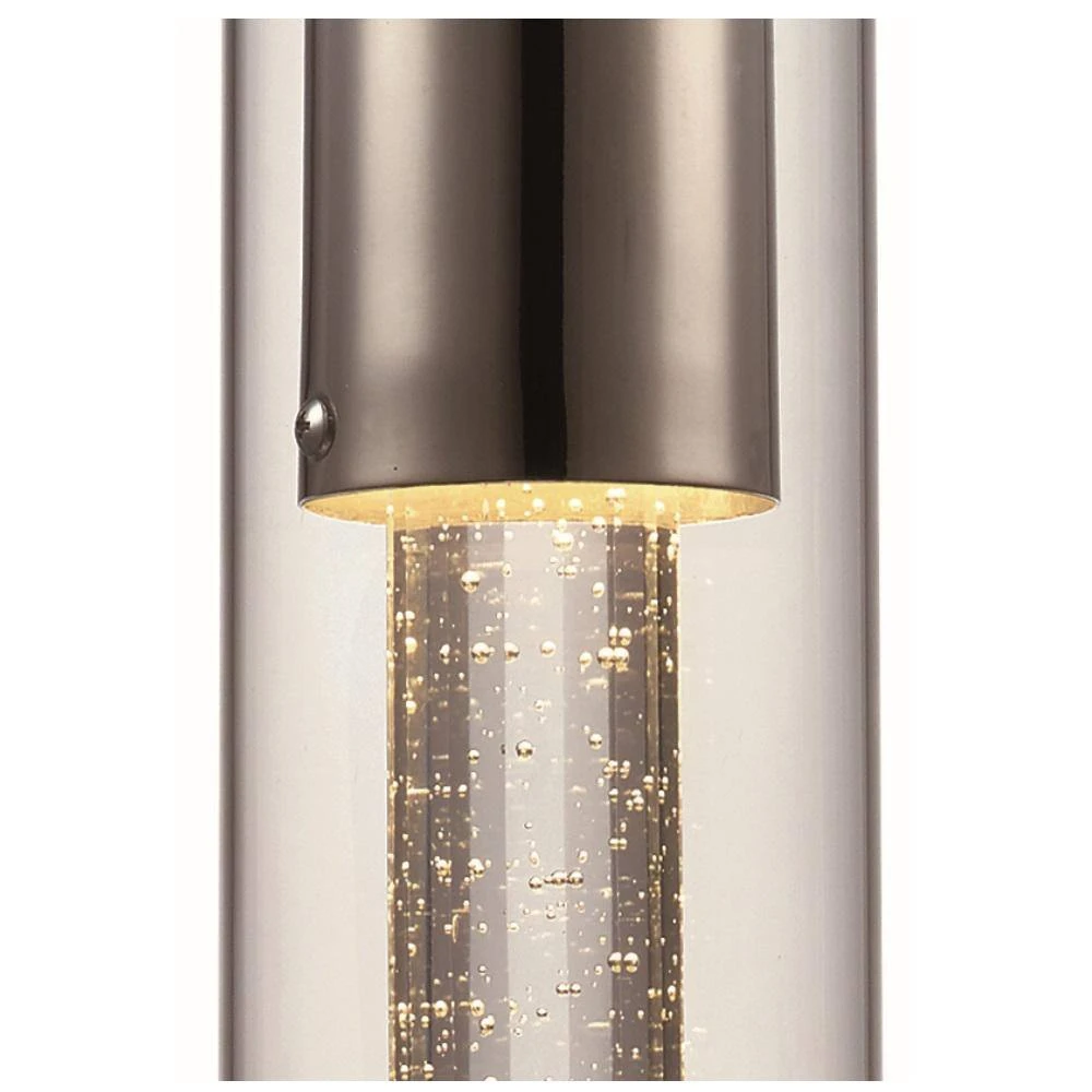 This contemporary mini pendant from Bel Air Lighting is designed to suit a variety of home decor styles from transitional to modern. The pendant is a decorative hanging light that works well in dining areas, kitchens, and other compact spaces where focused light is needed. Use as a single unit, or install as a set over a linear kitchen island or bar table for additional illumination in larger spaces. The fixture is constructed of polished chrome metal and includes a circular ceiling plate and dual paned glass shade. The elongated cylinder shade has a bubble-glass inner insert that houses the LED modules, and a clear glass outer tube. The integrated LED design is low maintenance as you will never need to replace bulbs for the life of the fixture. The energy saving LED module is also dimmable when used with a compatible LED dimmer switch. The pendant body suspends from a clear wire that allows for sloped ceiling compatiblity and height adjustability.