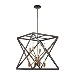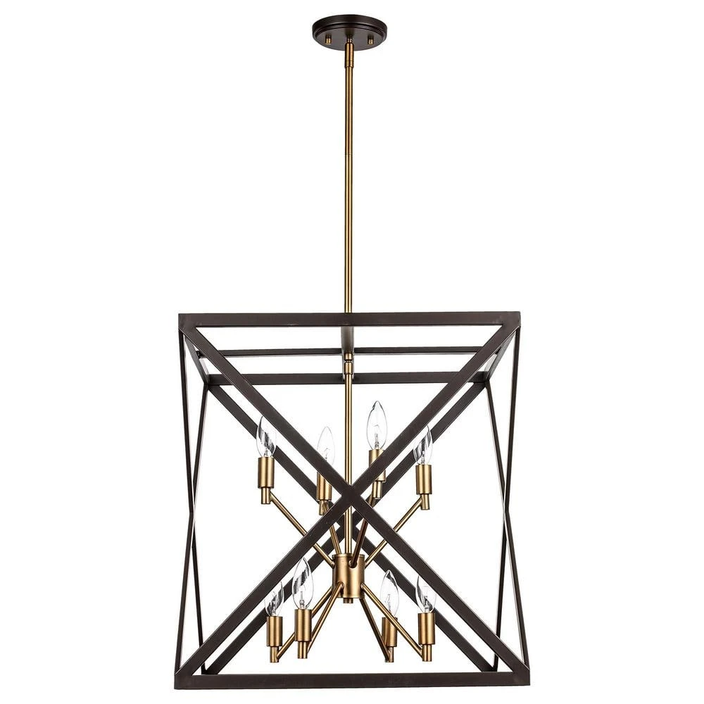 The Ackerman Collection from Bel Air exhibits transitional indoor lighting designed to suit a variety of home decor styles from industrial to modern. The Ackerman caged pendant is a decorative hanging light that works well in dining areas, kitchens, and foyer entrances. The fixture is constructed of an antique brass metal frame and includes a round ceiling plate for mounting and a bronze metal caged shade. The dark bronze shade offsets the metallic brass finish, highlighting the transitional design and adding a unique appeal to the piece. The metal cage surrounds a cluster of eight bulb sockets that are accessible through the open bottom and open criss-cross weave of the shade. The pendant body hangs from extension rods, of which multiple extra rods are included for an adjustable height. Shop the Ackerman Collection for additional finish options and coordinating interior lighting for the whole house.