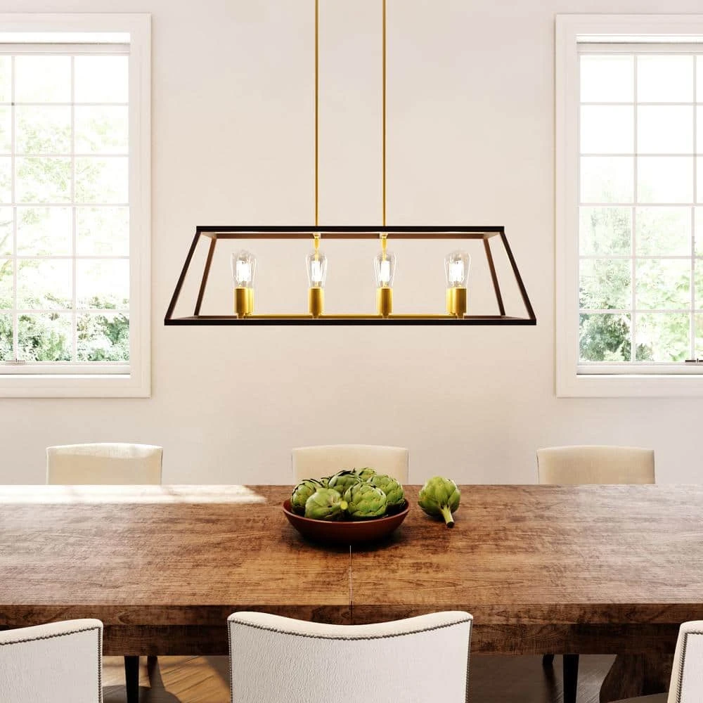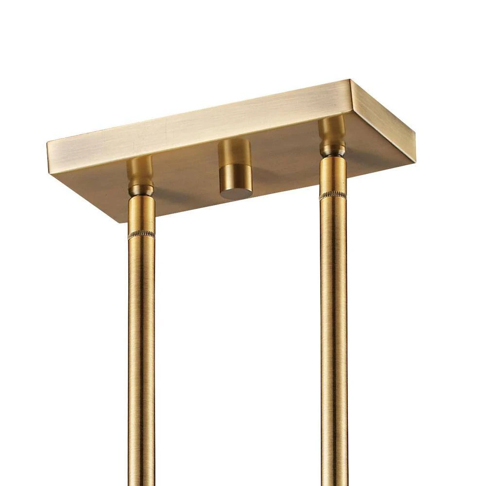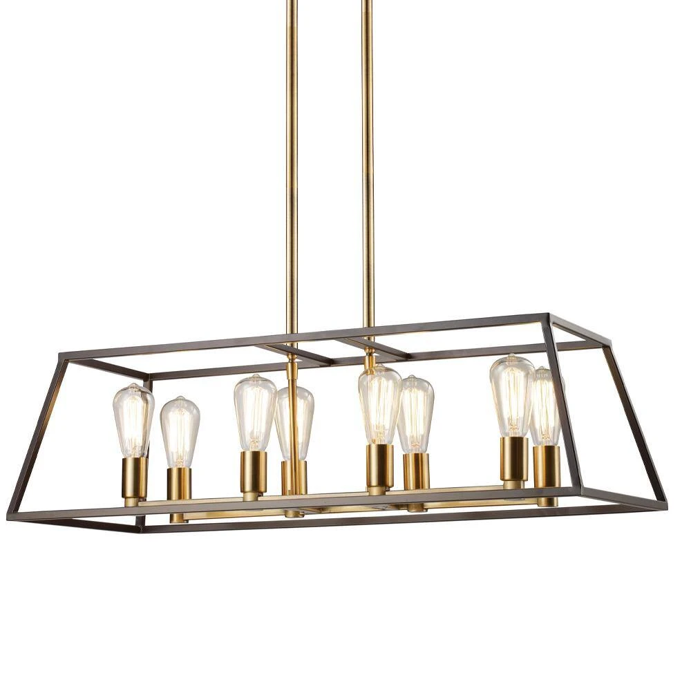 The Adams 35 inch long island pendant provides abundant light to your kitchen and dining room areas while adding functional style and an interesting design. Transform your living spaces with this industrial fixture that enhances a variety of interior design themes, from farmhouse and modern to transitional. This 8 light, four-sided pendant has an open metal frame and is fixed to the ceiling by two metal rods. Various sizes of extension rods are included for an adjustable hanging height. The pendant is secured to the ceiling by a matching antique brass finish rectangular canopy. Shop the Adams Collection for additional interior lighting styles and finishes.