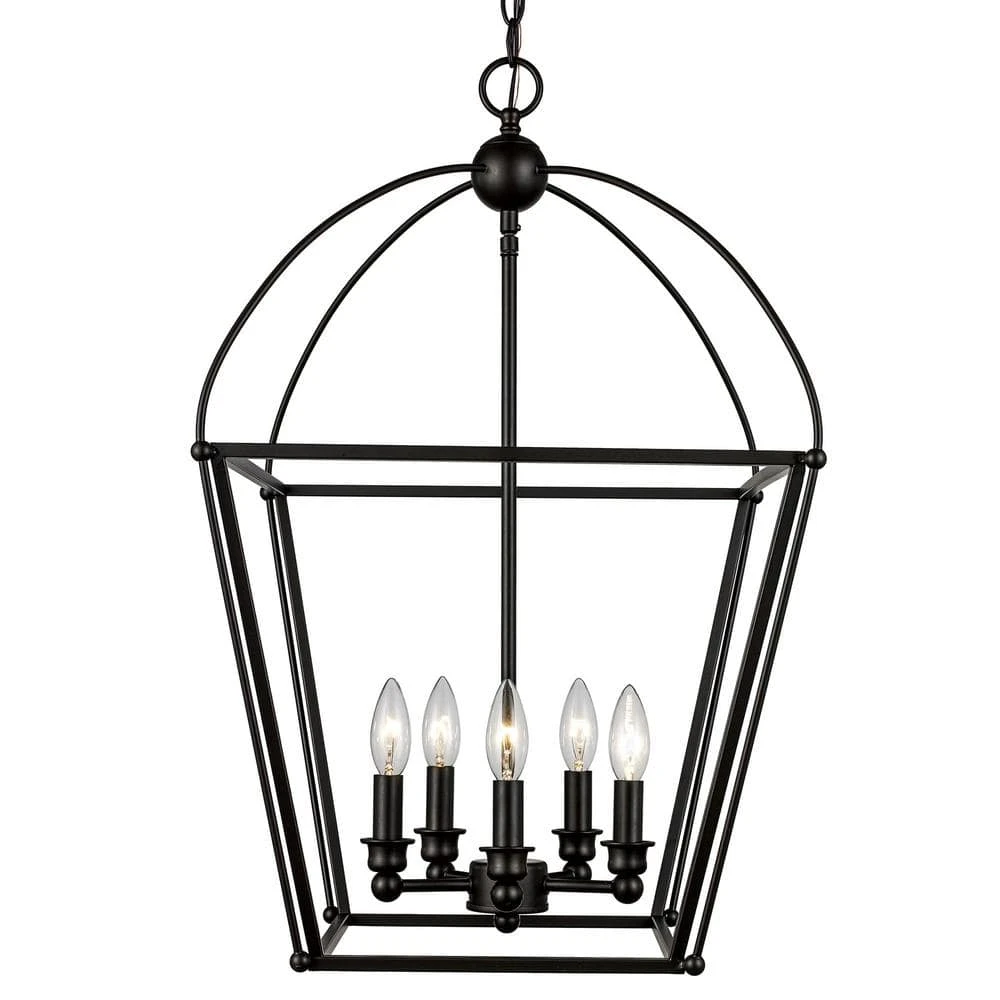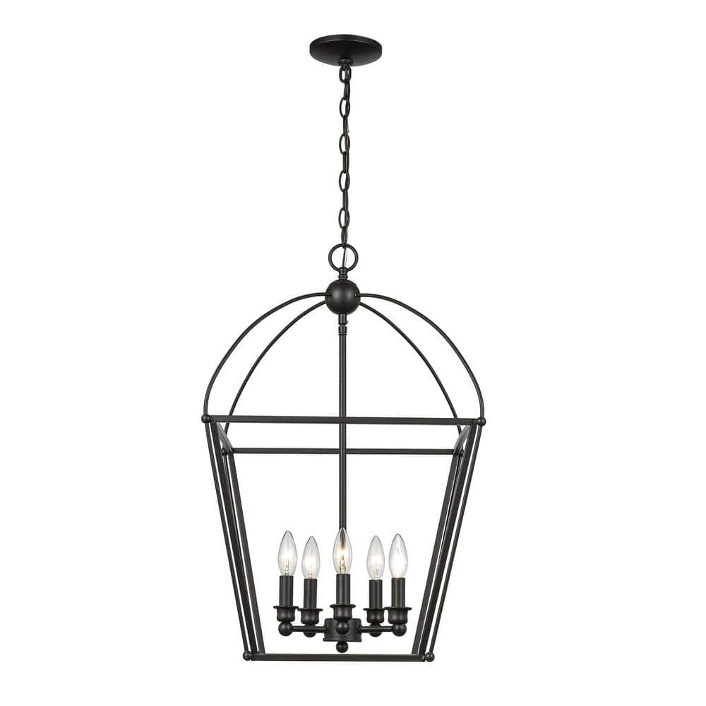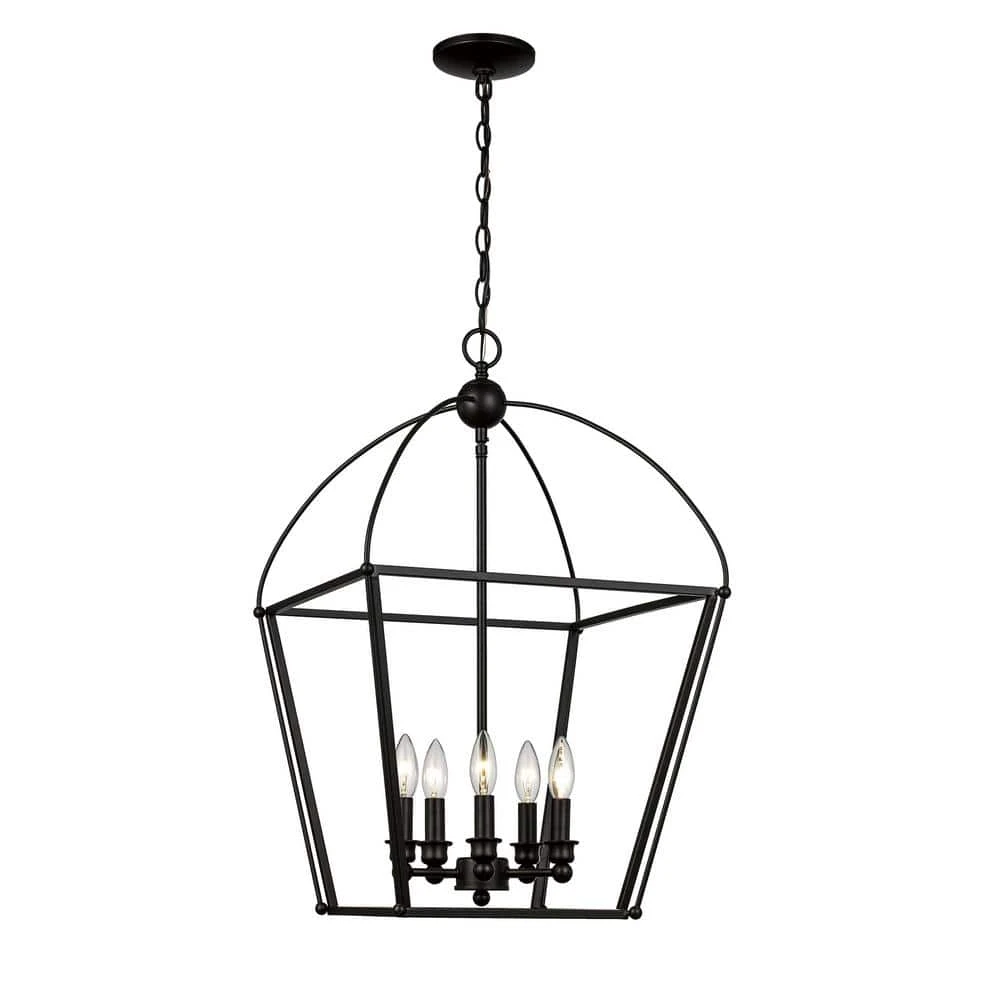 The Agnew Collection from Bel Air exhibits transitional style pendant lighting that is suitable for a wide range of applications and interior decor styles. Highlighted by contemporary metal birdcage frames, each piece in the Agnew Collection works well as a decorative statement piece in foyer entryways, or over kitchen and dining room tables. This pendant is finished in rubbed oil bronze, offering a warm alternative to traditional metallic finishes. Five candelabra bulbs are fully visible inside the open cage metal frame, held in place by decorative candle-style sockets. The curved metal roof adds an organic shape in contrast to the remainder of the square metal frame, softening the design for a more farmhouse feel. The pendant body hangs from a matching bronze chain, allowing for an adjustable height and sloped ceiling compatiblity.