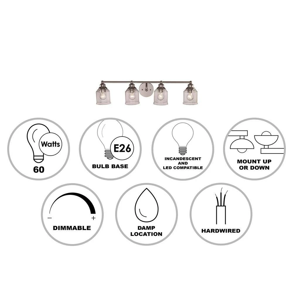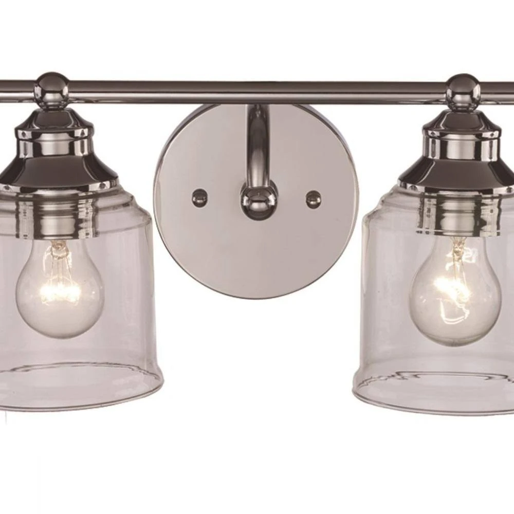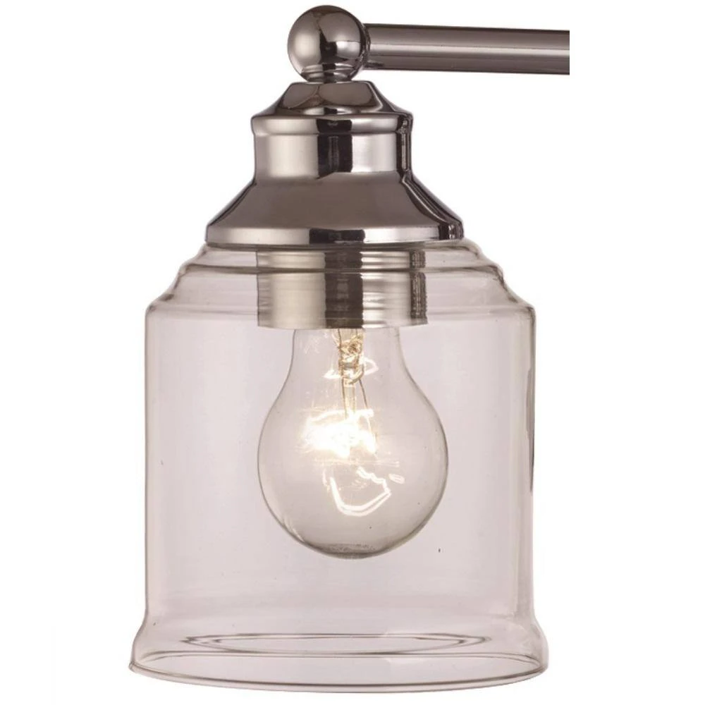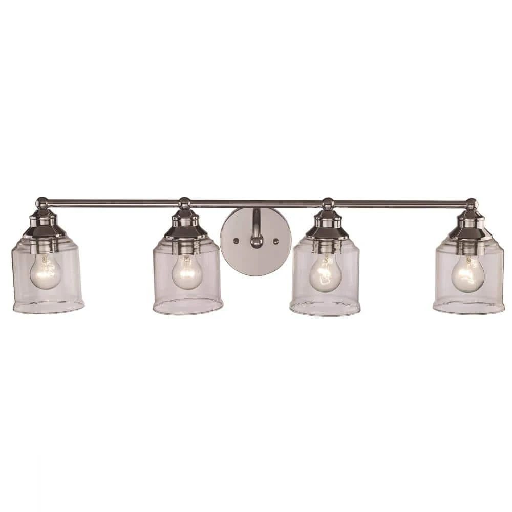 This transitional vanity collection from Bel Air Lighting is the perfect addition to your home’s bathroom and powder room spaces. The 4-light fixture is the largest in the collection, measuring 32 inches wide. The size is ideal for larger single vanities and sinks, or for use as a set over a double sink. The understated design is highlighted by a metallic polished chrome finish and clear glass bell-style shades, designed to coordinate with a variety of home decor styles from farmhouse, to industrial, to modern. Each of the glass shades is connected to a linear support arm that affixes firmly to a matching round wall plate. Light bulbs are in full view inside the transparent glass to provide ample task lighting. Mount this vanity light over a bathroom mirror with the shades facing up or down for a customized look.