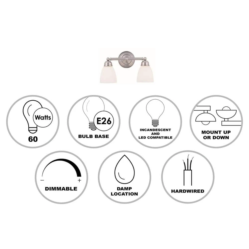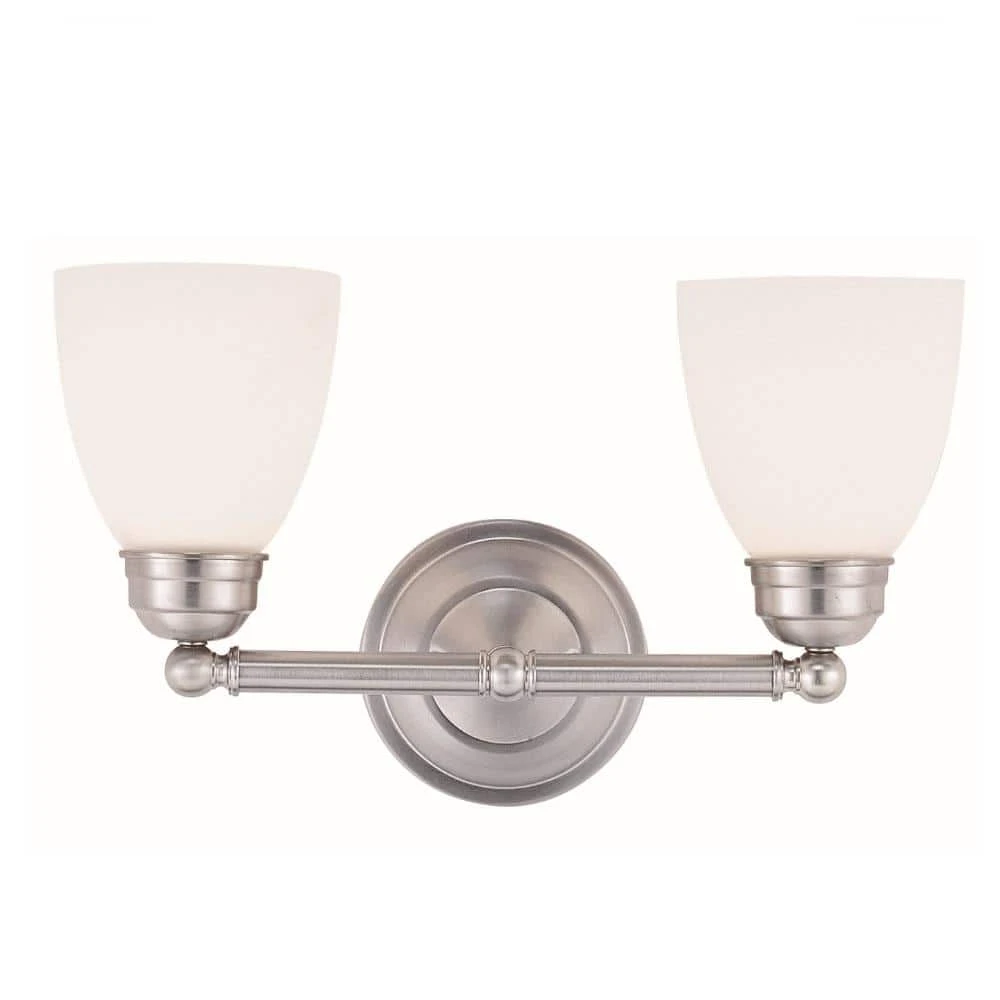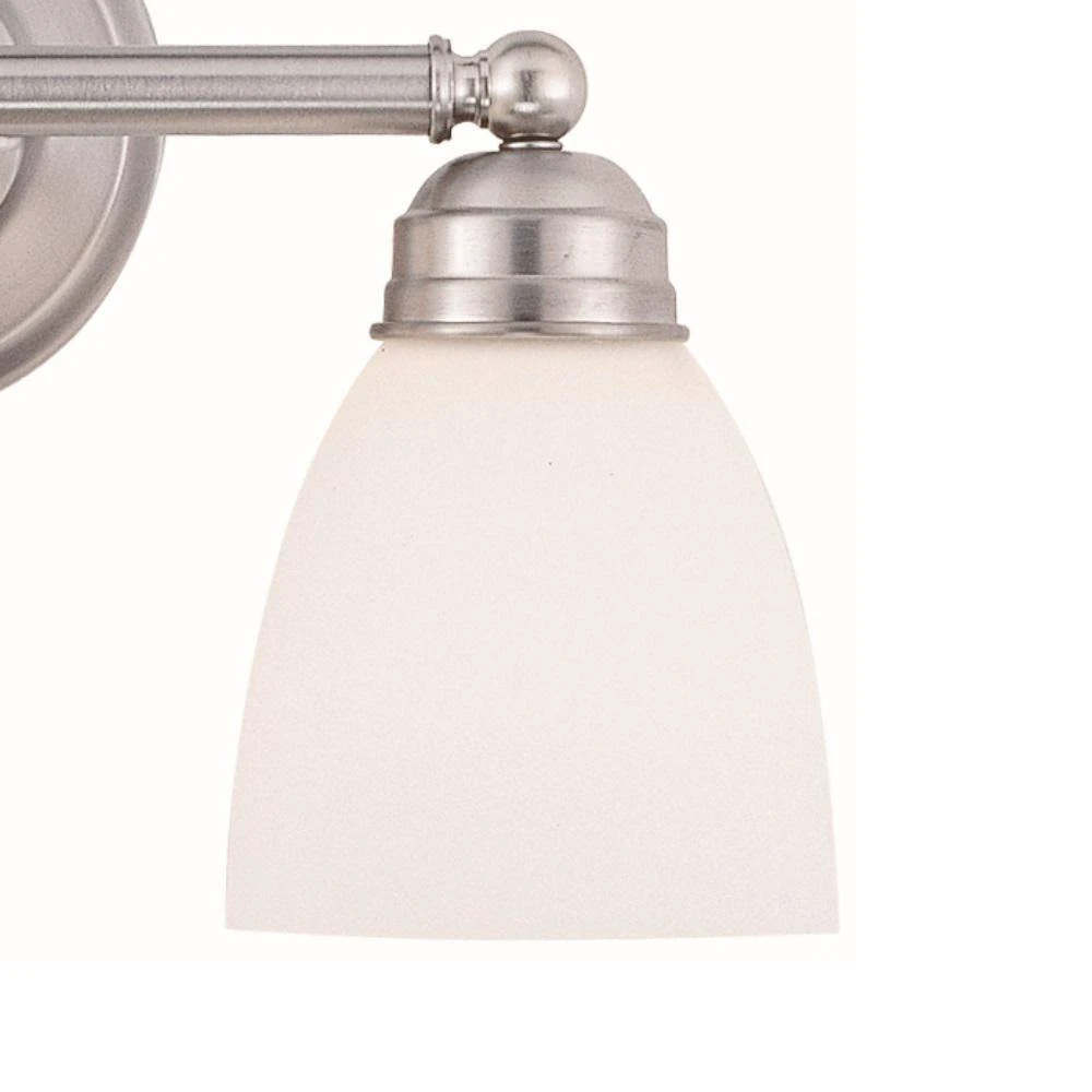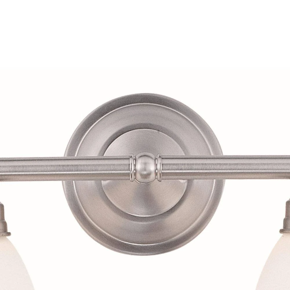 The Ardmore Collection from Bel Air exhibits transitional vanity lighting that will upgrade your bathroom or powder room with contemporary, elegant styling. The Ardmore 15.75-inch wide vanity bar is the smallest in the collection and works well in small powder rooms, or when used as a set over a double vanity sink. The metal frame and round wall plate are finished in brushed nickel to coordinate seamlessly with existing nickel-finished sconces and bathroom hardware. Two frosted glass bell-shaped shades are included, each housing a single 60-watt incandescent or LED bulb. The shades are supported by a simple metal rod and knob detailing, and can be mounted facing upwards or downwards for directional lighting either above or below the fixture.