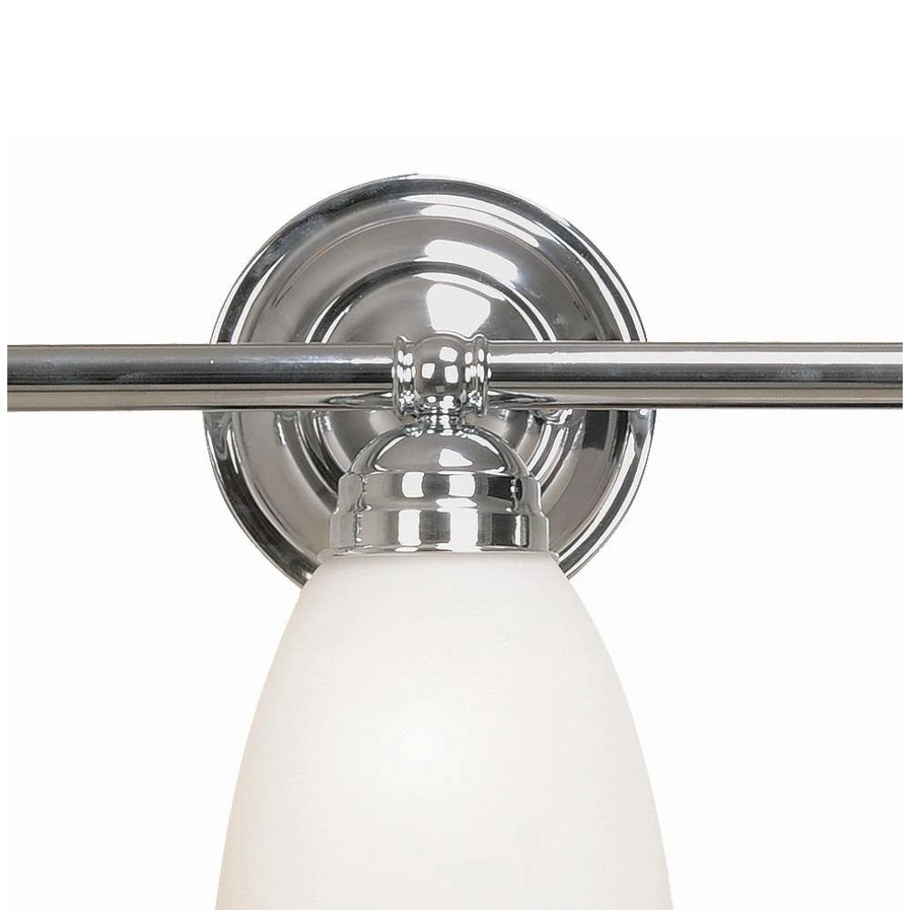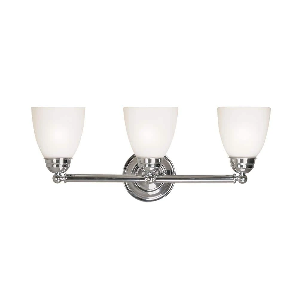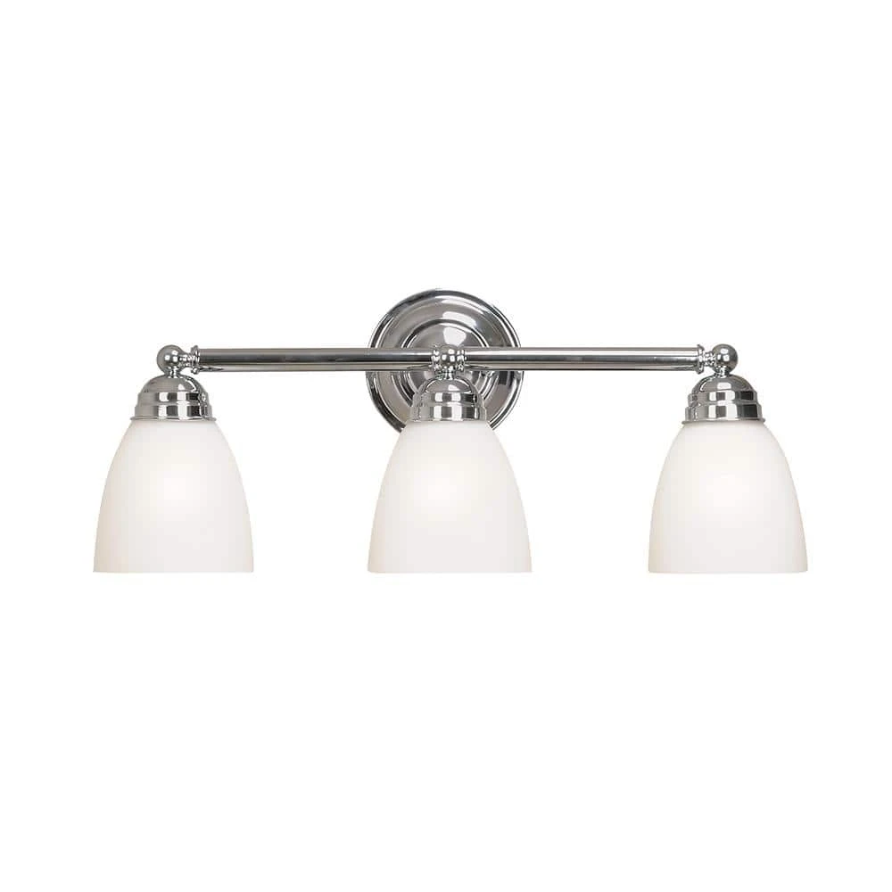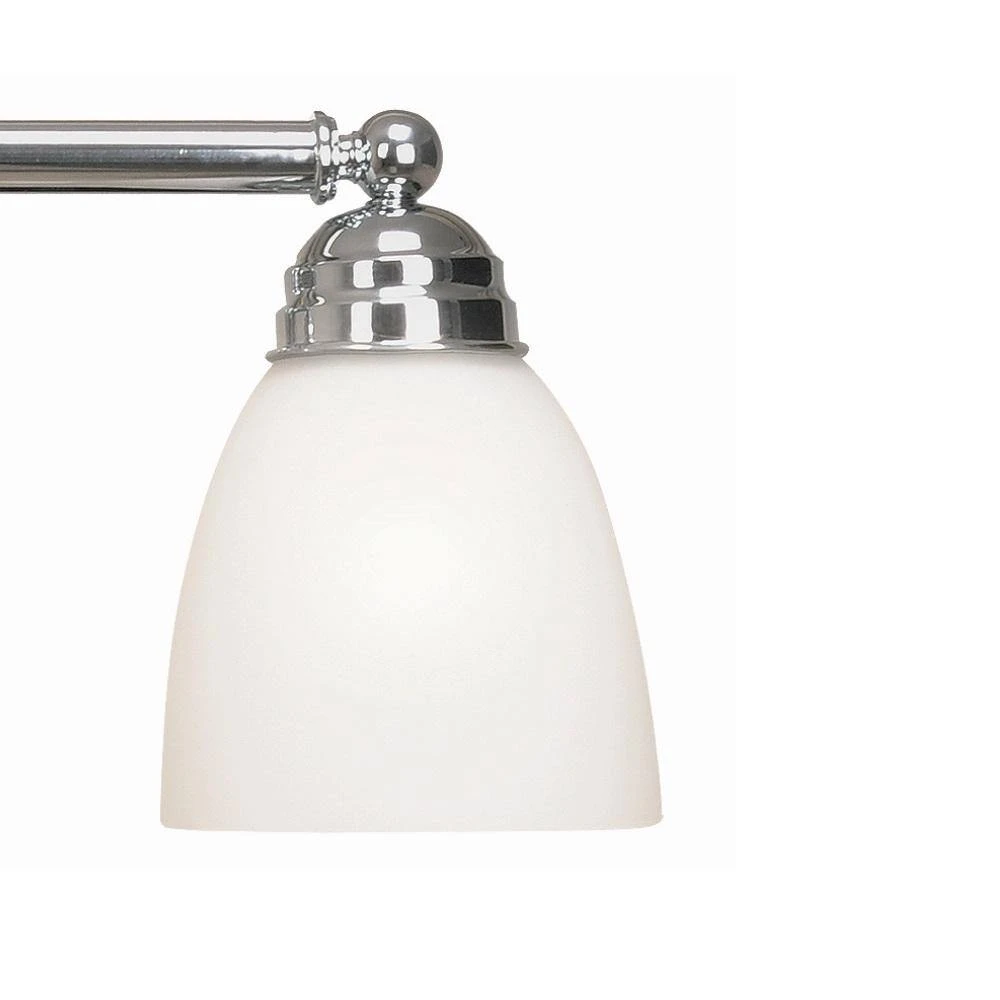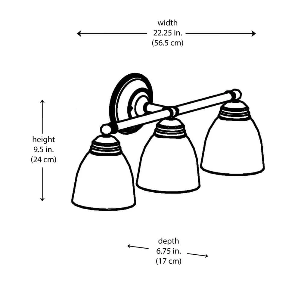 The Ardmore Collection from Bel Air exhibits transitional vanity lighting that will upgrade your bathroom or powder room with contemporary, elegant styling. The Ardmore 22.25-inch wide vanity bar is the middle size in the collection and works well in small powder rooms, or when used as a set over a double vanity sink. The metal frame and round wall plate are finished in polished chrome to coordinate seamlessly with existing chrome-finished sconces and bathroom hardware. Three frosted glass bell-shaped shades are included, each housing a single 60-watt incandescent or LED bulb. The shades are supported by a simple metal rod and knob detailing, and can be mounted facing upwards or downwards for directional lighting either above or below the fixture.