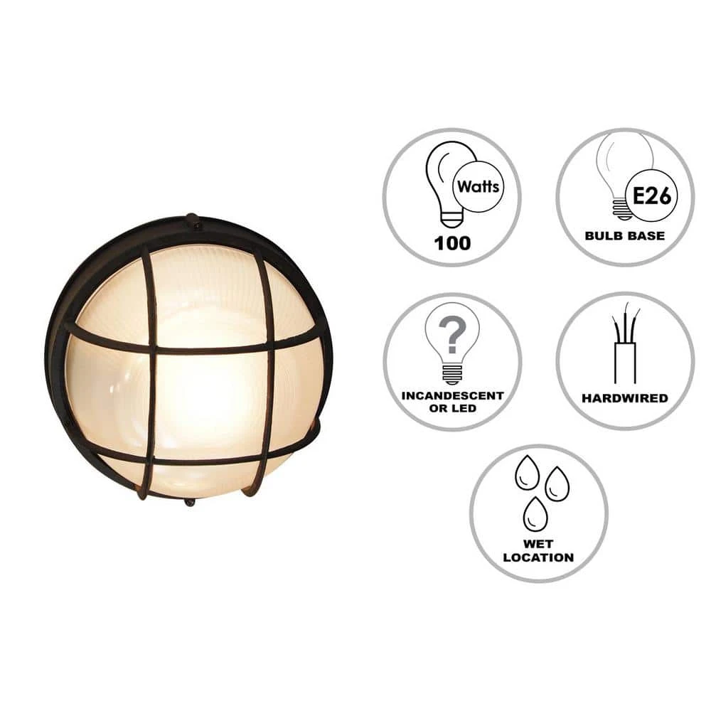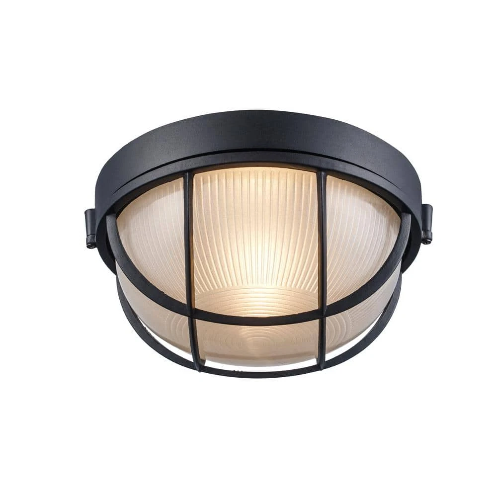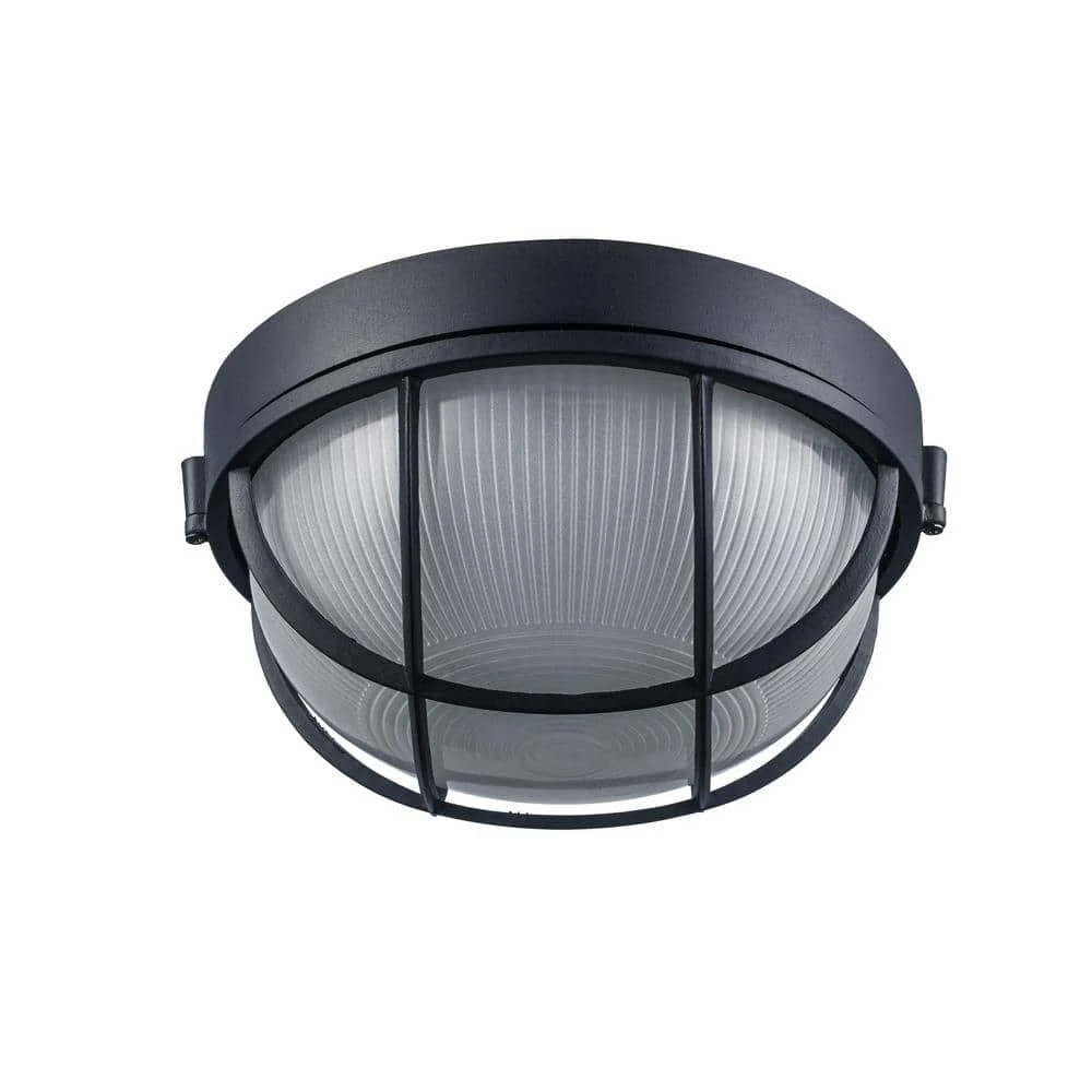 The Aria Collection features outdoor bulkhead lighting with ribbed frost glass and caged metalwork, reminiscent of nautical design themes. The Aria 10 inch round fixture is the largest of its class in the collection. The low profile design extends only 5 inches from the wall, allowing this piece to be used in a variety of exterior locations. The black finish is powder coated to hold up in harsh weather conditions and will coordinate well with existing decor. This fixture accepts a single 100-watt bulb, which emits enough illumination for use in exterior entryways, hallways, walkways, and more. The Aria Collection can be used as wall lighting or ceiling lighting.