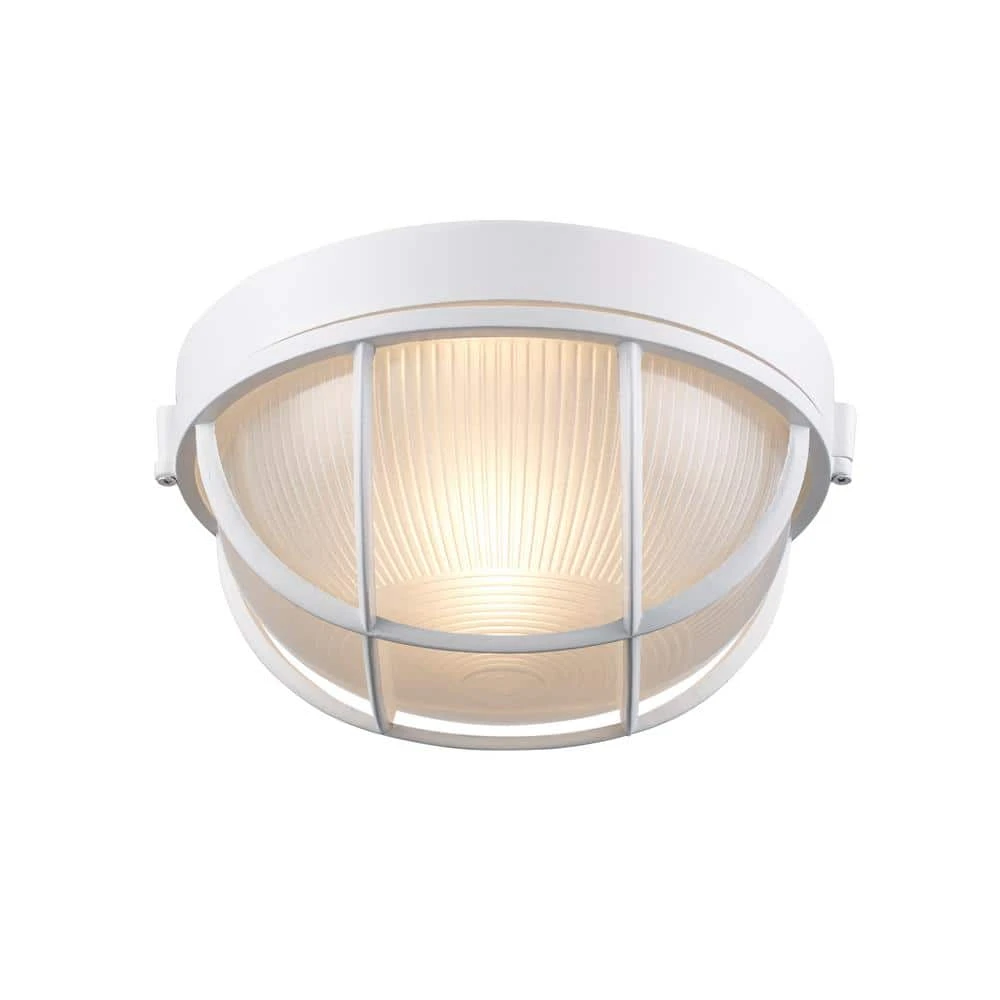 The Aria Collection features outdoor bulkhead lighting with ribbed frost glass and caged metalwork, reminiscent of nautical design themes. The Aria 10 inch round fixture is the largest of its class in the collection. The low profile design extends only 5 inches from the wall, allowing this piece to be used in a variety of exterior locations. The white finish is powder coated to hold up in harsh weather conditions and will coordinate well with existing decor. This fixture accepts a single 100-watt bulb, which emits enough illumination for use in exterior entryways, hallways, walkways, and more. The Aria Collection can be used as wall lighting or ceiling lighting.