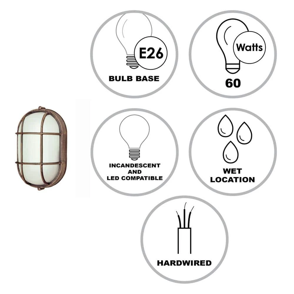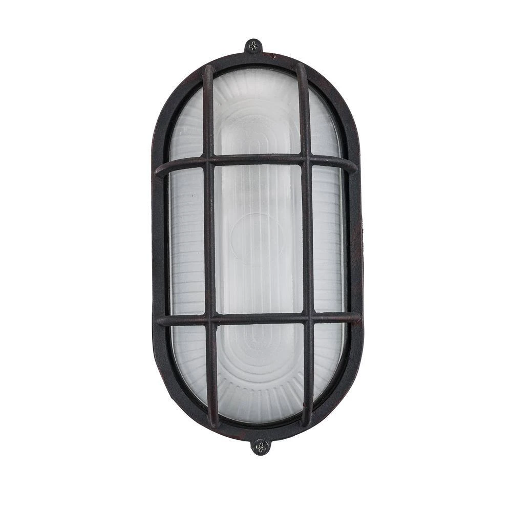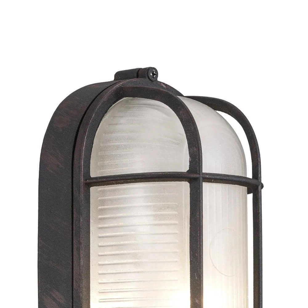 The Aria Collection features outdoor bulkhead lighting with ribbed frost glass and caged metalwork, reminiscent of nautical design themes. The Aria 8.25 inch tall oval shaped fixture is the smallest of its class in the collection. The low profile design extends less than 4 inches from the wall, allowing this piece to be used in a variety of exterior locations. The rust-brown finish is powder coated to hold up in harsh weather conditions and will coordinate well with existing decor. This fixture accepts a single 60-watt bulb, which emits enough illumination for use in exterior entryways, hallways, walkways, and more. The Aria Collection can be used as wall lighting or ceiling lighting.