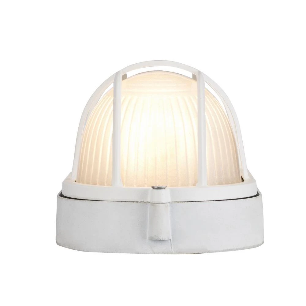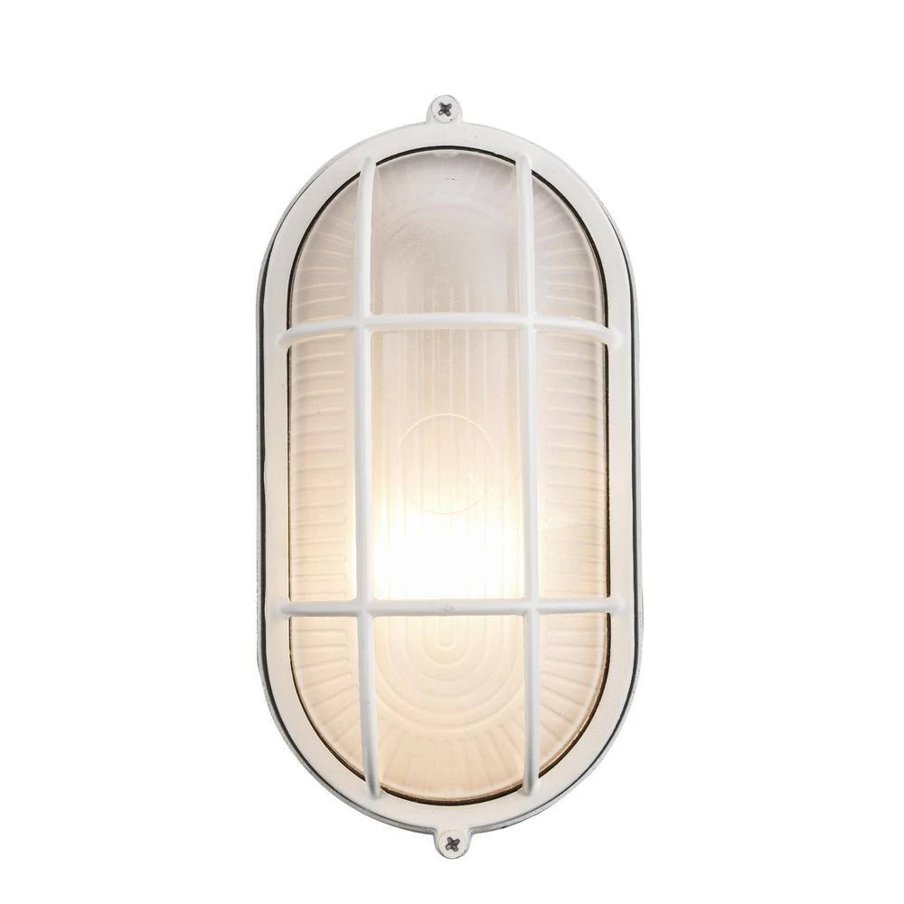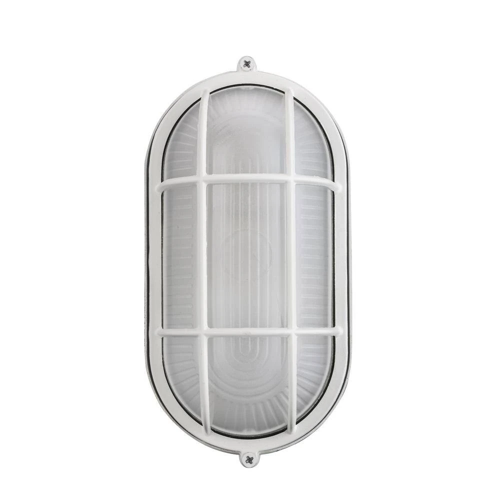 The Aria Collection features outdoor bulkhead lighting with ribbed frost glass and caged metalwork, reminiscent of nautical design themes. The Aria 8.25 inch tall oval shaped fixture is the smallest of its class in the collection. The low profile design extends less than 4 inches from the wall, allowing this piece to be used in a variety of exterior locations. The white finish is powder coated to hold up in harsh weather conditions and will coordinate well with existing decor. This fixture accepts a single 60-watt bulb, which emits enough illumination for use in exterior entryways, hallways, walkways, and more. The Aria Collection can be used as wall lighting or ceiling lighting.