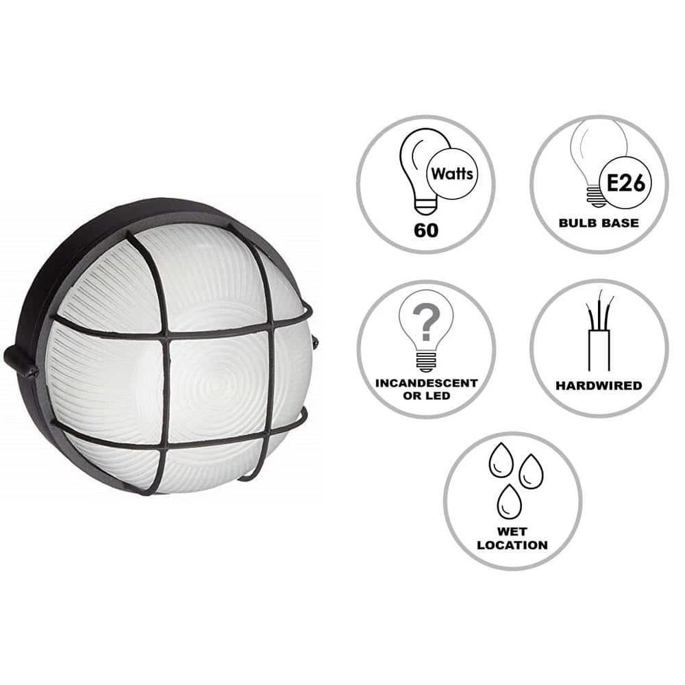 The Aria Collection features outdoor bulkhead lighting with ribbed frost glass and caged metalwork, reminiscent of nautical design themes. The Aria 8 inch round fixture is the smallest of its class in the collection. The low profile design extends only 4 inches from the wall, allowing this piece to be used in a variety of exterior locations. The black finish is powder coated to hold up in harsh weather conditions and will coordinate well with existing decor. This fixture accepts a single 60-watt bulb, which emits enough illumination for use in exterior entryways, hallways, walkways, and more. The Aria Collection can be used as wall lighting or ceiling lighting.