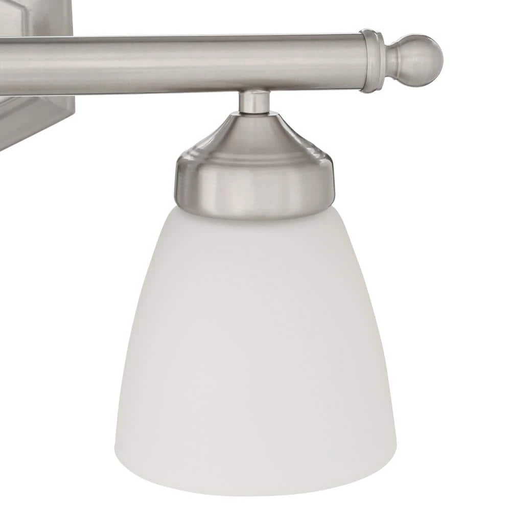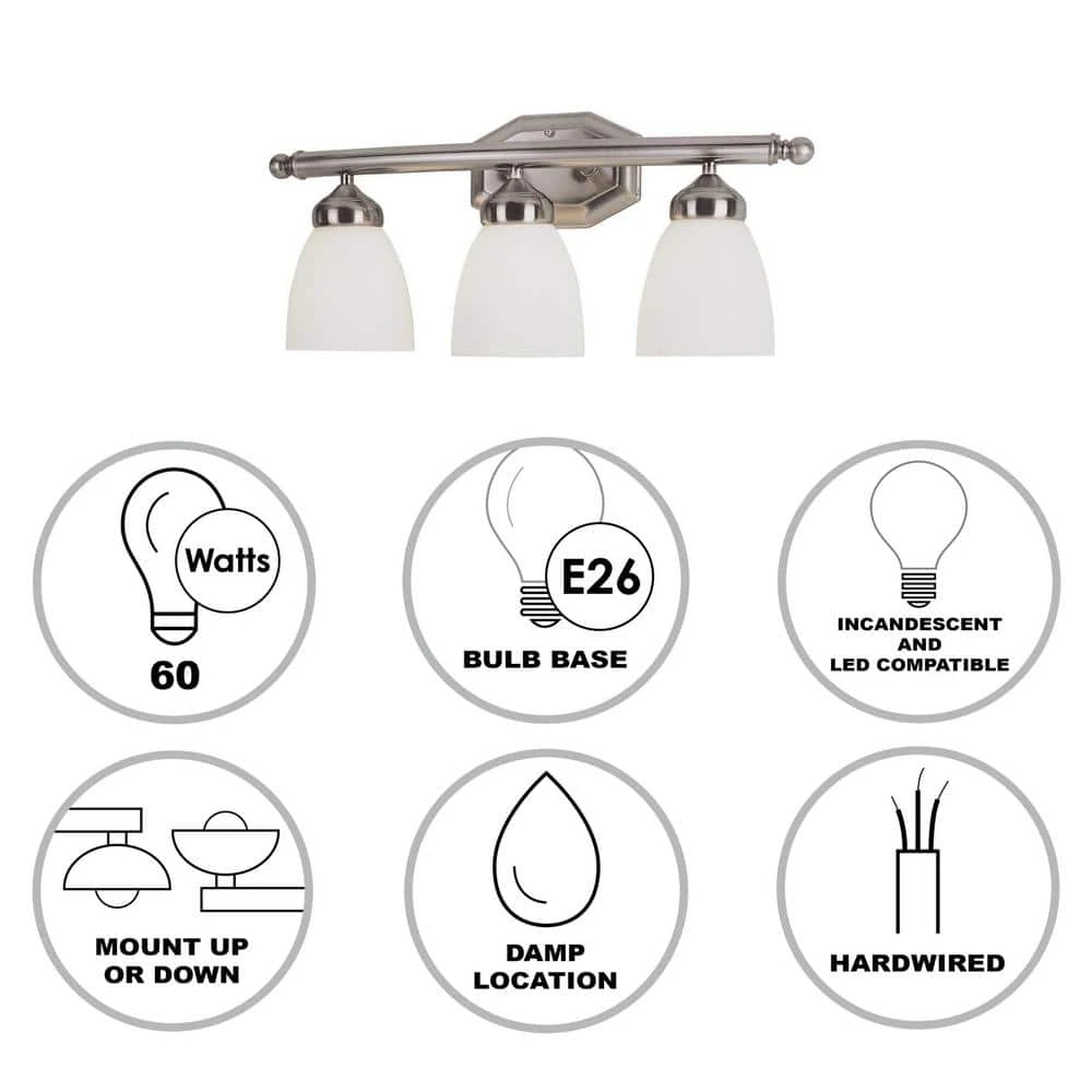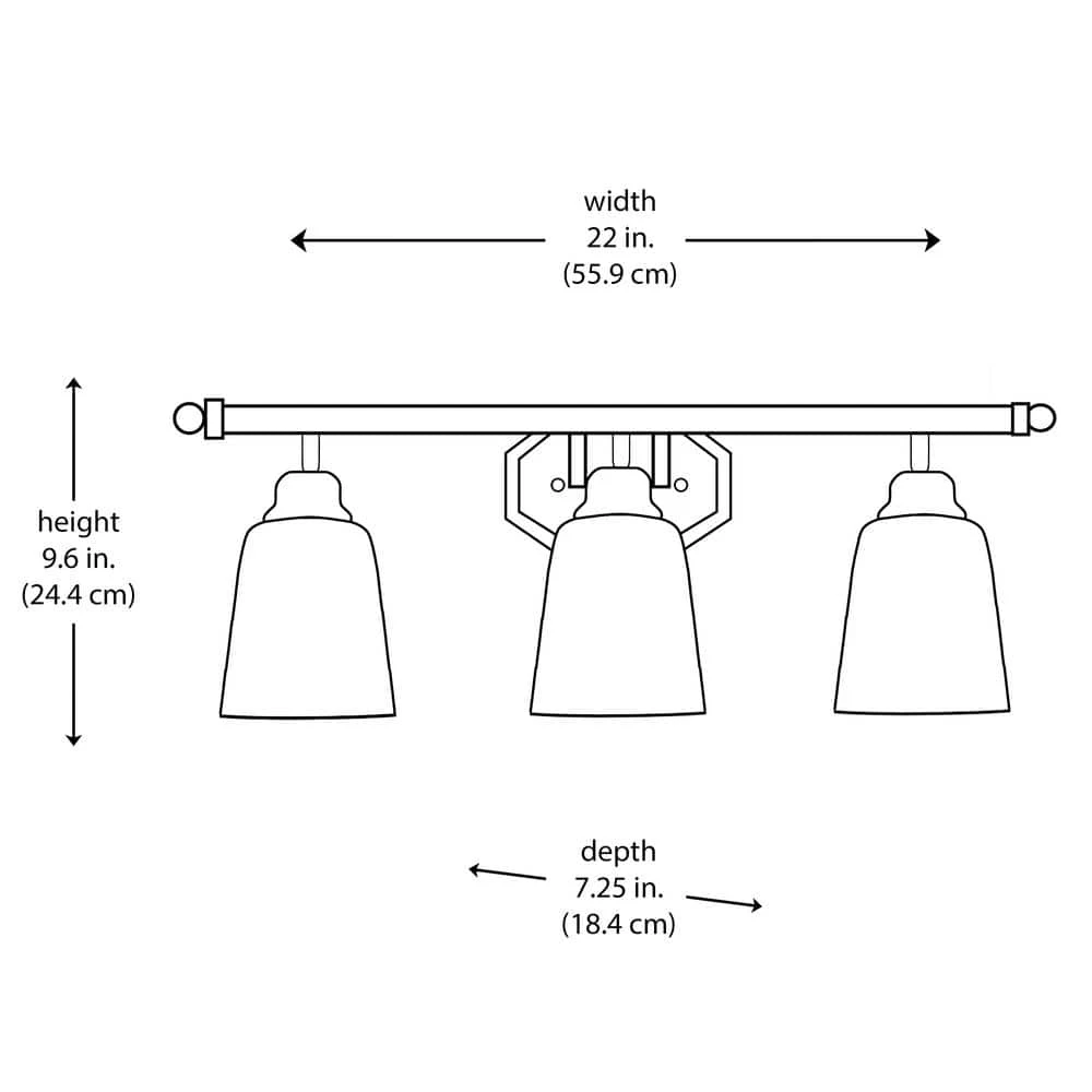 The Ashlea Collection from Bel Air exhibits contemporary styled vanity lighting with metallic finishes and contrasting whited frosted glass shades, designed to complement a wide variety of bathroom and powder room decor styles from transitional to modern. The Ashlea 22 inch vanity light is finished in brushed nickel and includes a coordinating octagon-shaped wall plate and straight arm detail to hold the three shades in place. The bell shaped shades are open at the bottom to allow for directional lighting from the 60-watt bulbs inside. This wall light is damp rated and can be mounted anywhere in the home for additional accent and task lighting. The piece looks great as a single unit, but also works well when mounted in multiples over a double bathroom sink or mirror. The Ashlea Collection is versatile, and can be mounted upwards or downwards for a customized look.