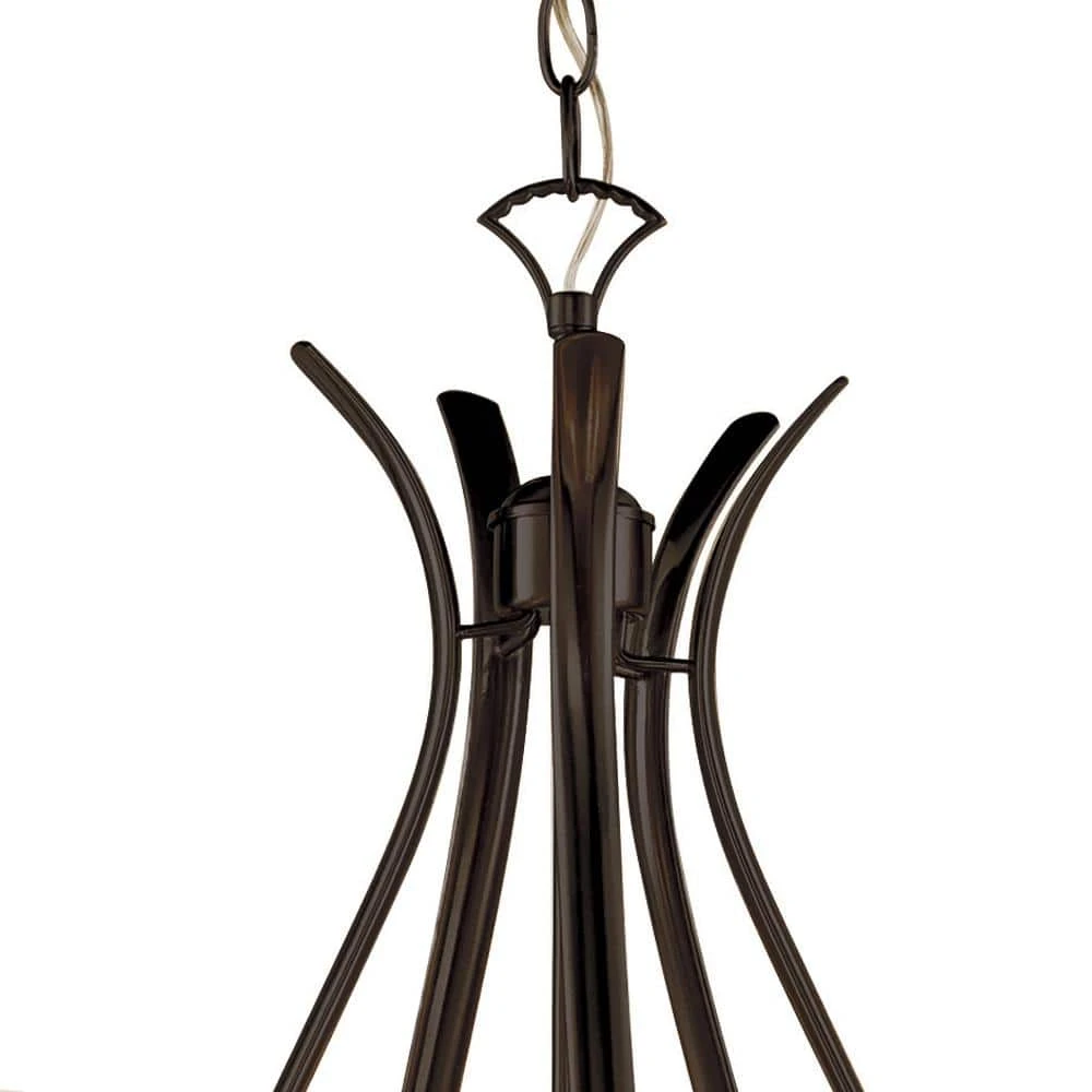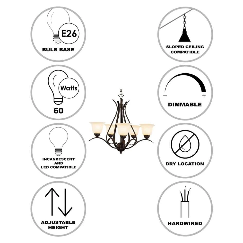The Aspen Collection exhibits traditional style interior lighting with decorative accents and glass shades, suitable for a variety of applications and home types. The Aspen 26 inch round chandelier features a dark, rubbed oil bronze finish paired with white marbleized glass shades. The offset of dark brown with the white glass creates a delicate, contemporary feel that allows this piece to coordinate with many different home decor styles from transitional to modern. Each of the five glass shade surrounds a single 60-watt light bulb, and are open at the top to allow for an ample amount of light to pour out and illuminate entryways, dining rooms areas, and kitchens. The Aspen Collection is unique for its simple curved lines and delicate support arms that hold each of the shades firmly in place. The chandelier body hangs from a matching bronze chain, offering height adjustability and sloped ceiling compatibility.