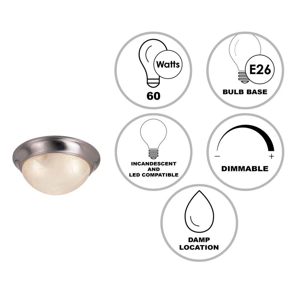 The Athena Collection from Bel Air offers sleek and sophisticated indoor lights that are designed to coordinate well with a variety of existing decor styles and existing lighting fixtures. The Athena 14 inch round flush mount is a low-profile style ceiling fixture that casts a soft, ambient light over a wide area. The metallic brushed nickel metal frame is complimented by the white, marbleized glass bowl shade for a look that is both decorative and unique. Two 60-watt bulbs are housed inside the shade, offering ample light for a variety of interior living areas. This ceiling light is damp rated, and can be used in bathrooms, bedrooms, kitchens, and wherever additional task lighting is needed in the home.