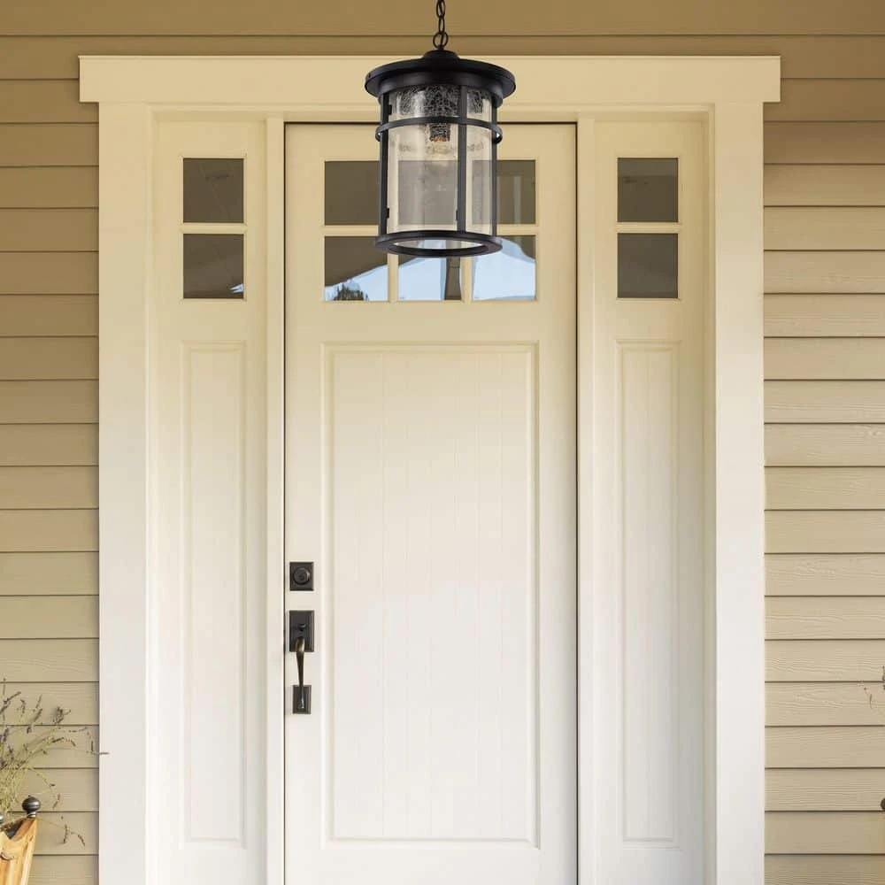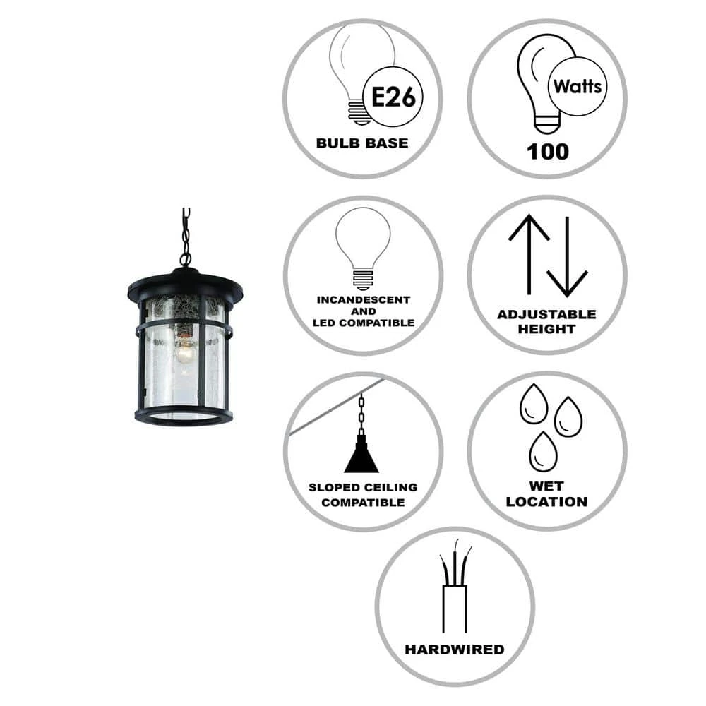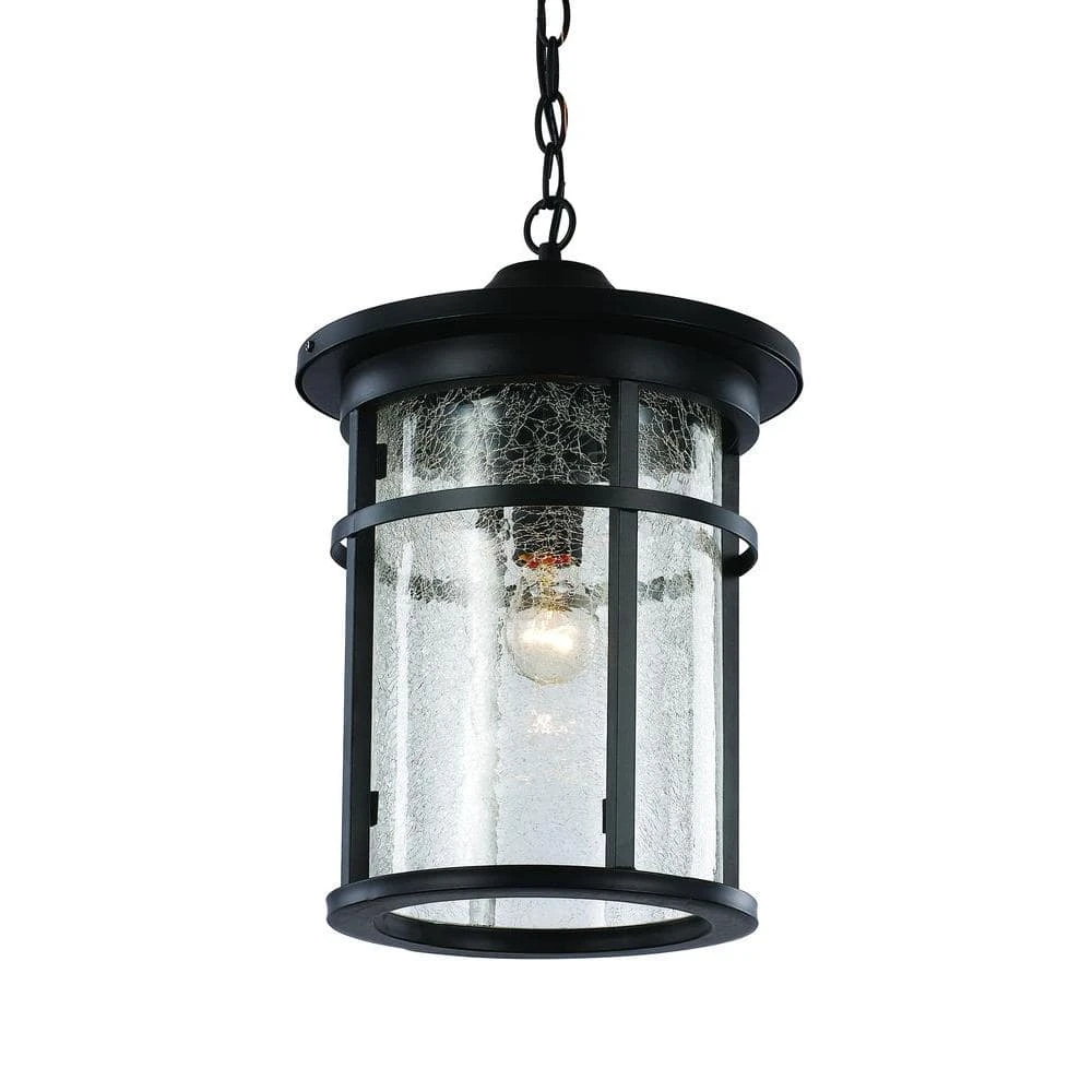 The Avalon Collection from Bel Air presents transitional outdoor lights, designed to complement a wide range of home styles from traditional to modern. The Avalon outdoor pendant light is a lantern style fixture that draws on its rustic appeal to bring functional illumination to your home’s porch spaces, covered patios, and decks. The piece is finished in black to easily coordinate with existing decor and outdoor hardware, and includes a textured glass cylindrical shade. A single 100-watt bulb is housed inside, offering ample illumination for both small and large spaces. The lantern body hangs from a matching black chain, offering an adjustable height and sloped ceiling compatibility. Shop the Avalon Collection for a complete selection of lighting styles to coordinate with this outdoor ceiling light.