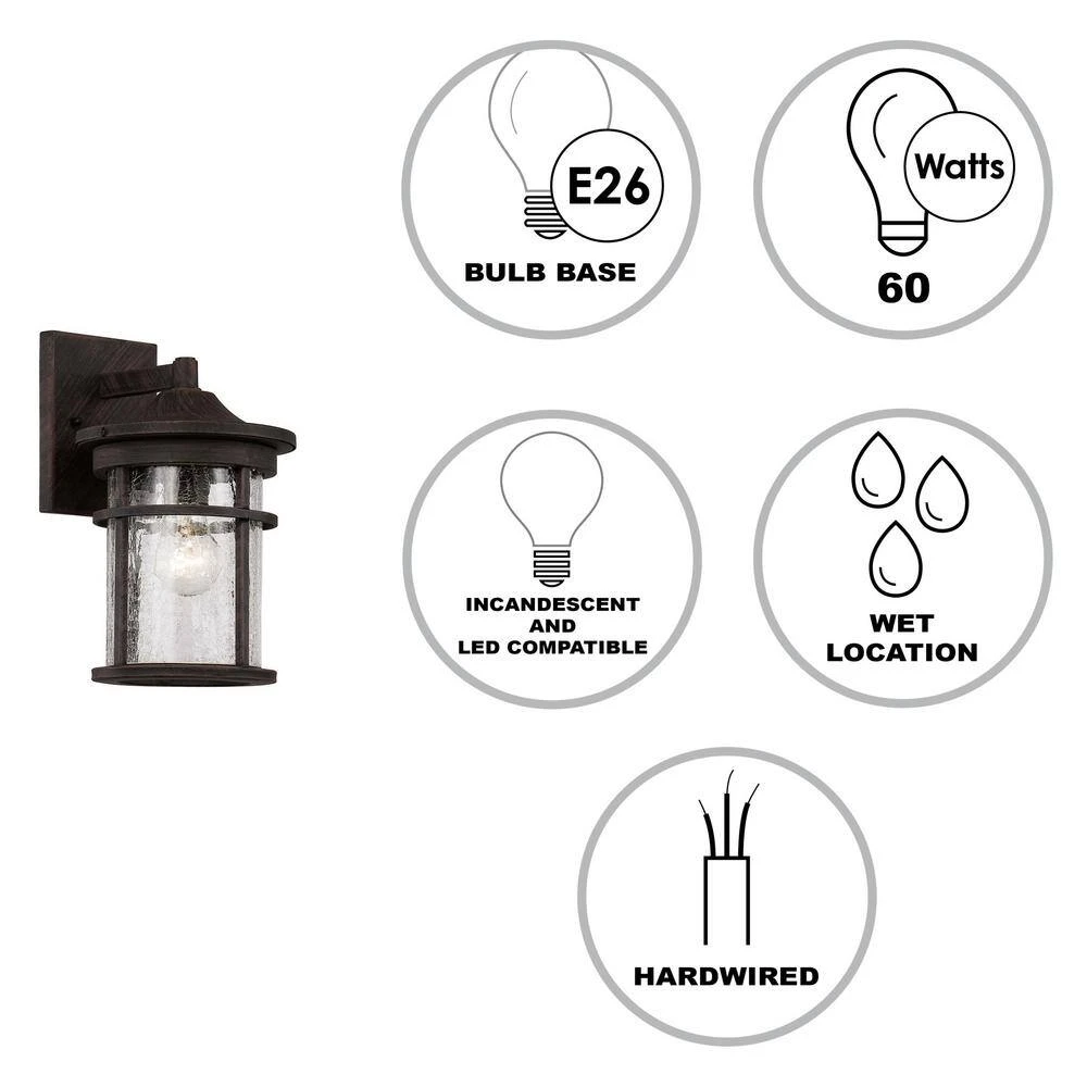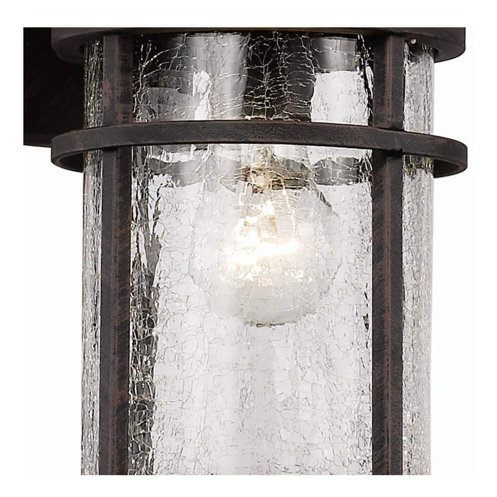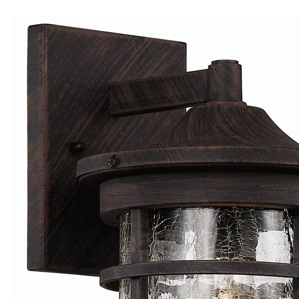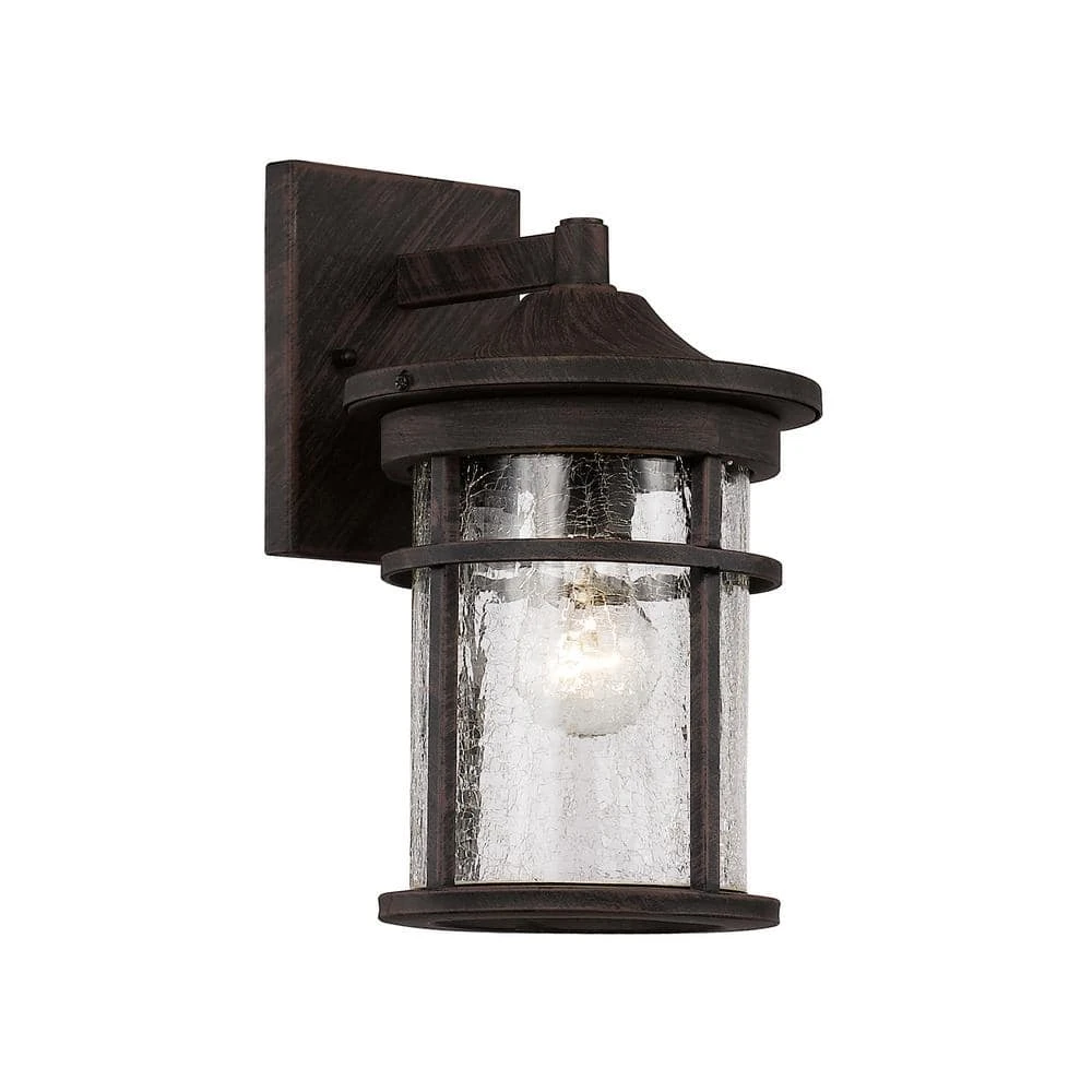 The Avalon Collection exhibits transitional style exterior lighting, designed to compliment a wide range of home styles from traditional to modern. The Avalon 11 inch tall outdoor wall light is the smallest in the series, and maintains a distinctive look as it provides accent and area lighting to porches, driveways, walkways, and landscape areas. The round, clear crackled glass shade is housed in a durable cast aluminum frame finished in a warm, rust-brown. The sconce attaches to a matching wall plate by a sturdy arm, ensuring this light will hold up in harsh weather conditions. Avalon’s simple elegance and variety of fixture types makes it easy to update the exterior of your home with functional style.