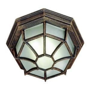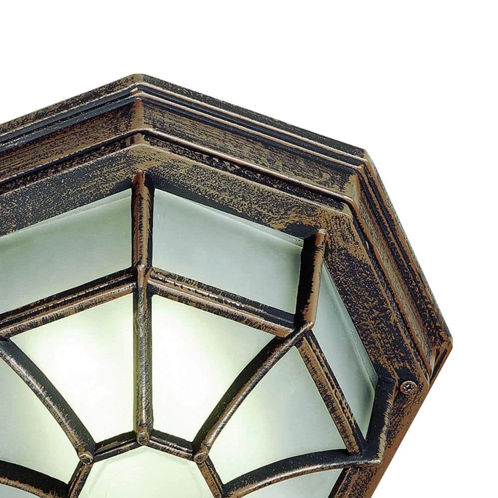 The Benkert Collection of outdoor lights is characterized by octagon shaped fixtures and metal wagon-wheel style webbed frames. The Benkert 9 inch flush mount is the smallest in the collection, and perfect for bringing bright illumination to your exterior living spaces while providing an interesting and unique design. The rust-brown finish and geometric styling give this ceiling light a classic flair that compliments a wide variety of home decor styles, from cottage to farmhouse. The white frosted glass shade beneath the webbed frame softly diffuses the light from the single 100-watt bulb and ensures even illumination in porch and patio areas. The fixture is made of a durable cast aluminum construction and has a powder coated finish to hold up in harsh weather conditions. This flush mount can be used as a ceiling fixture or a wall light.