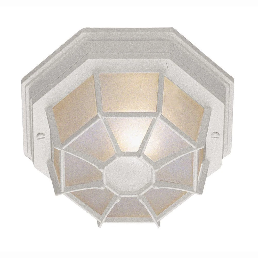 The Benkert Collection is characterized by its octagon shaped fixtures and webbed frames. The Benkert 9 inch flush mount is perfect for bringing bright illumination to your outdoor living spaces while providing an interesting and pleasing design. The white finish and geometric styling give this ceiling light a rustic flair that compliments a wide variety of outdoor decor styles, from cottage to farmhouse. The white frosted glass shade beneath the webbed frame softly diffuses the light from the single 100-watt bulb and ensures even illumination in porch and patio areas. The fixture is made of a durable cast aluminum construction and has a powder coated finish to hold up in harsh weather conditions. This flush mount can be used as a ceiling fixture or a wall light. Shop the Benkert Collection for additional finishes and sizes.