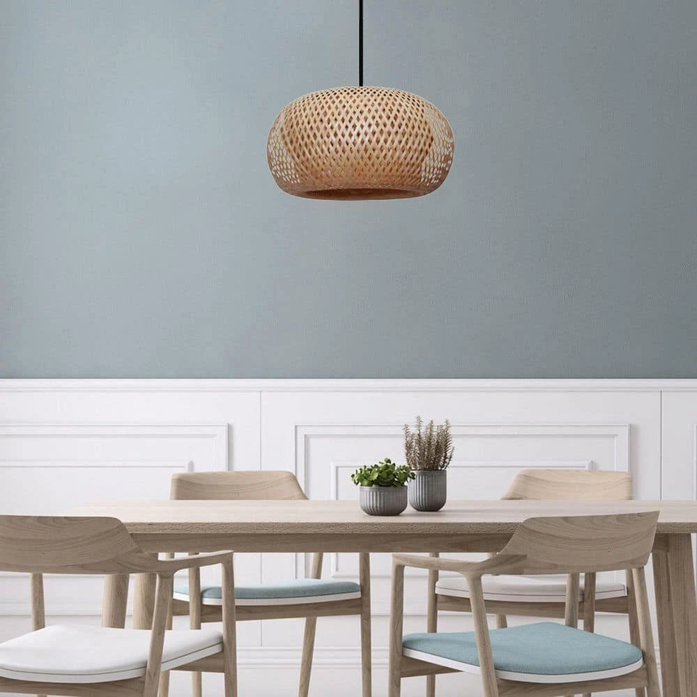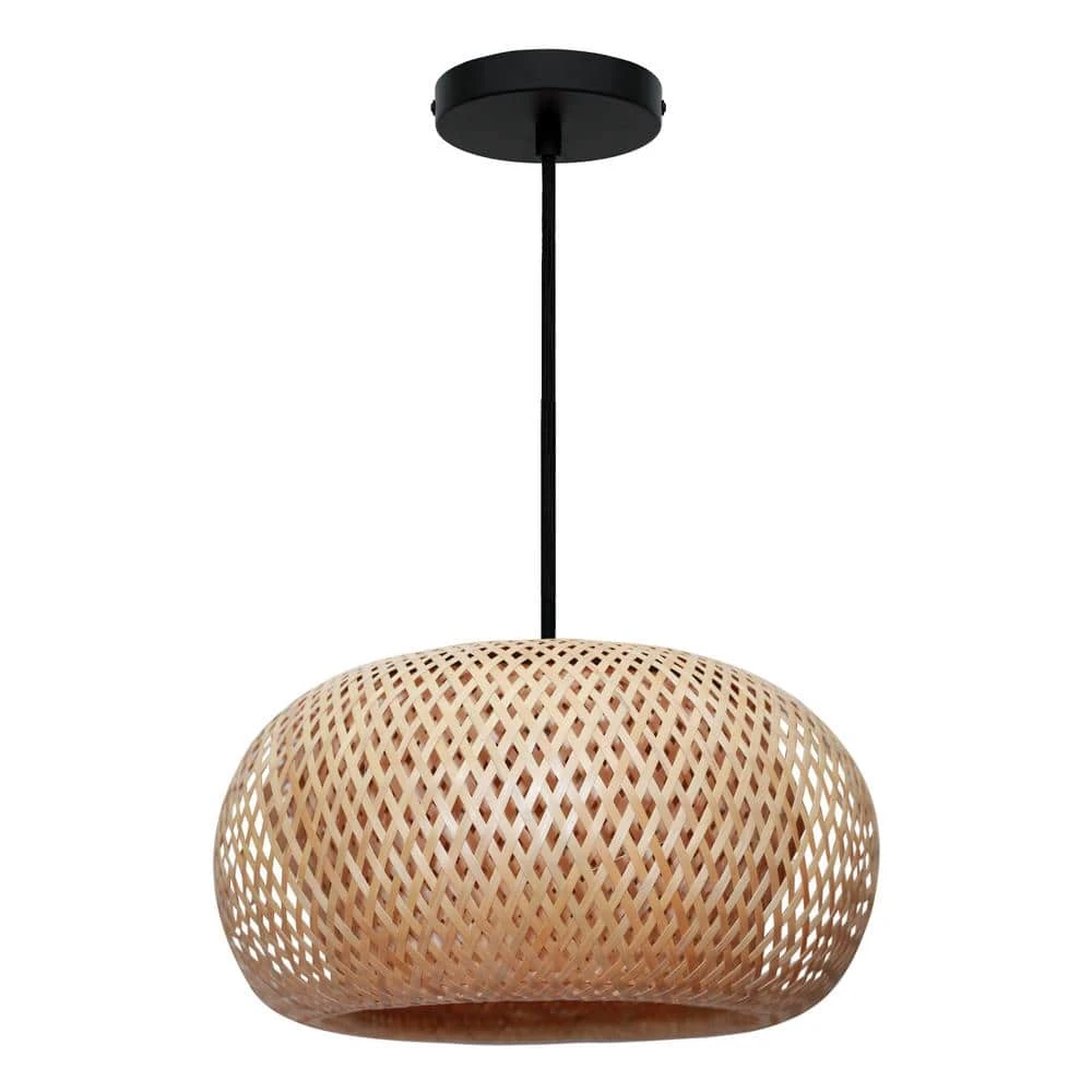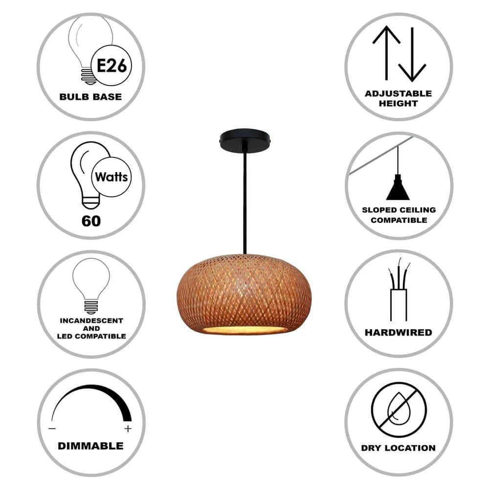 The Bernice Collection features bohemian style indoor pendant lights with natural fiber woven rattan shades. The Bernice 18 in. rattan pendant includes a round mounting canopy and a cord for an adjustable hanging height. The single 60-Watt down light illuminates beautifully out from the woven drum shade, providing ample light for a variety of indoor spaces. The shade is open at the bottom to allow easy access to the light bulb. The boho-chic style of this pendant is ideal for creating a warm and inviting impression in living rooms, bedrooms, dining rooms and more.