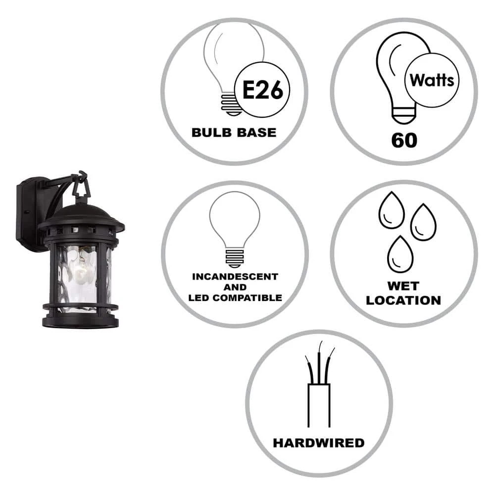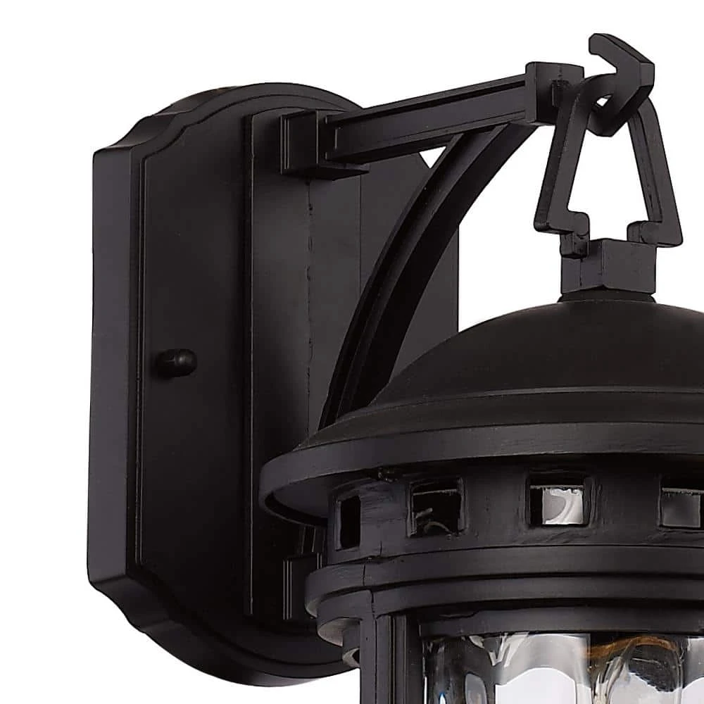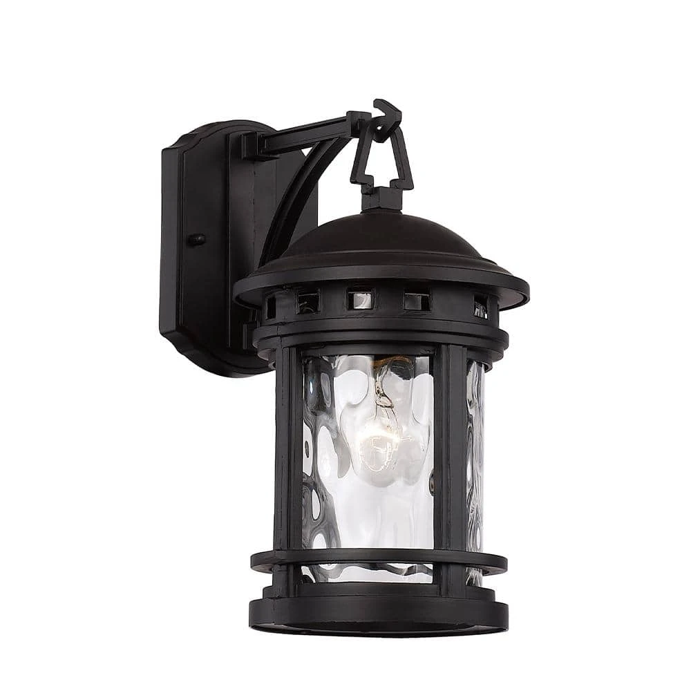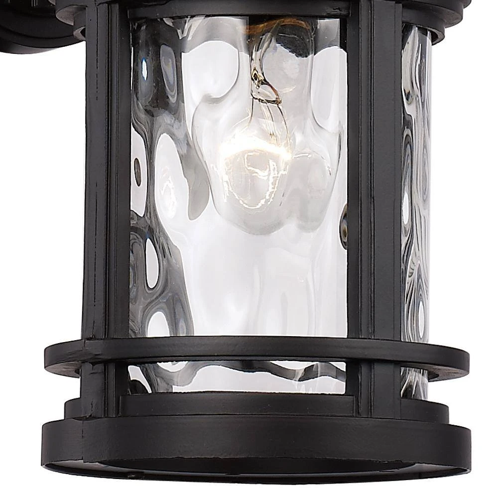 The Boardwalk Collection from Bel Air Lighting features craftsman style exterior lighting designed to coordinate with a variety of home styles from transitional and modern. The Boardwalk 12.5 inch tall lantern is the smallest outdoor wall light in the collection. The piece is finished in black and includes a clear water glass shade that allows ample illumination from the single bulb inside to shine out and light up porches, entryways, and exterior walkways. The cylindrical lantern body appears to hang from a ring hook and decorative arm detail, while remaining firmly affixed to the wall plate for strength and stability in harsh weather conditions. The fixture looks great as a single piece, or when mounted in multiples on either side of a garage door, front entryway, or gate. Shop the Boardwalk Collection for additional sizes, finishes, and exterior lighting styles.