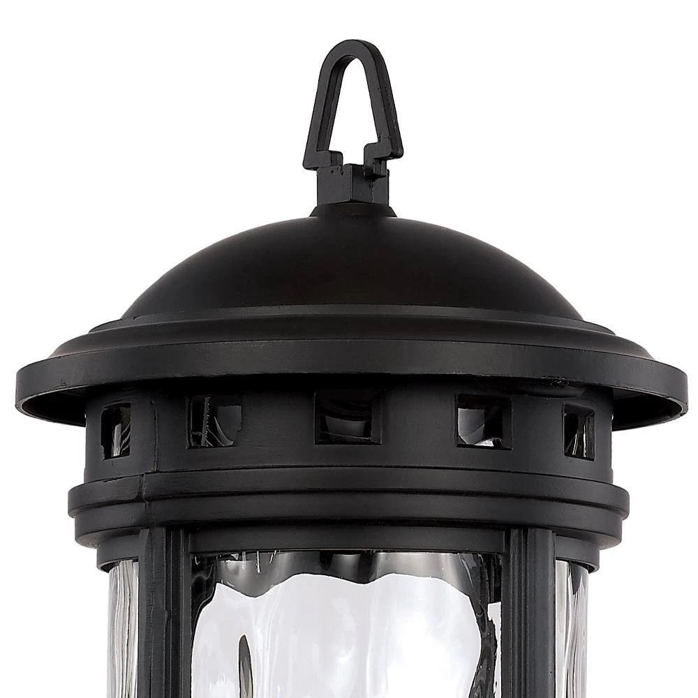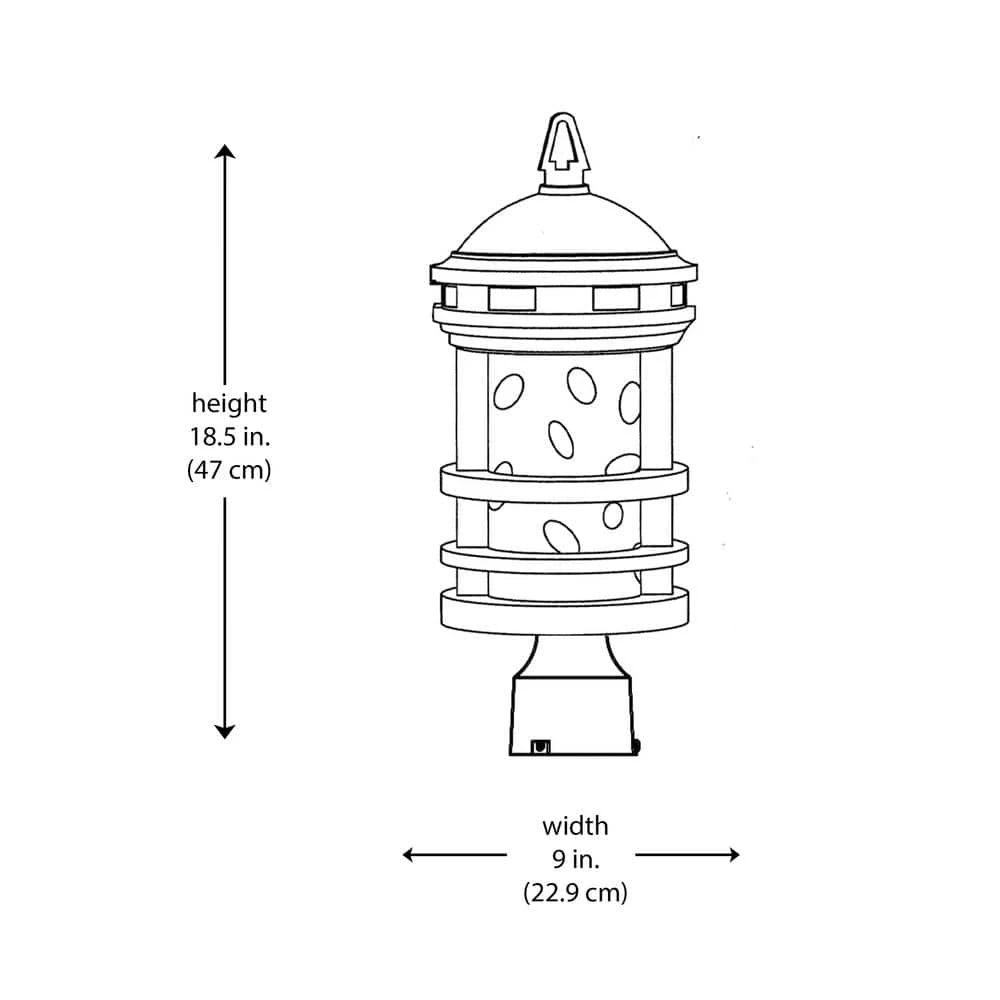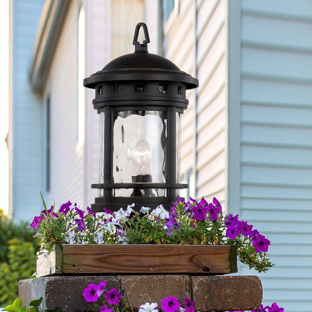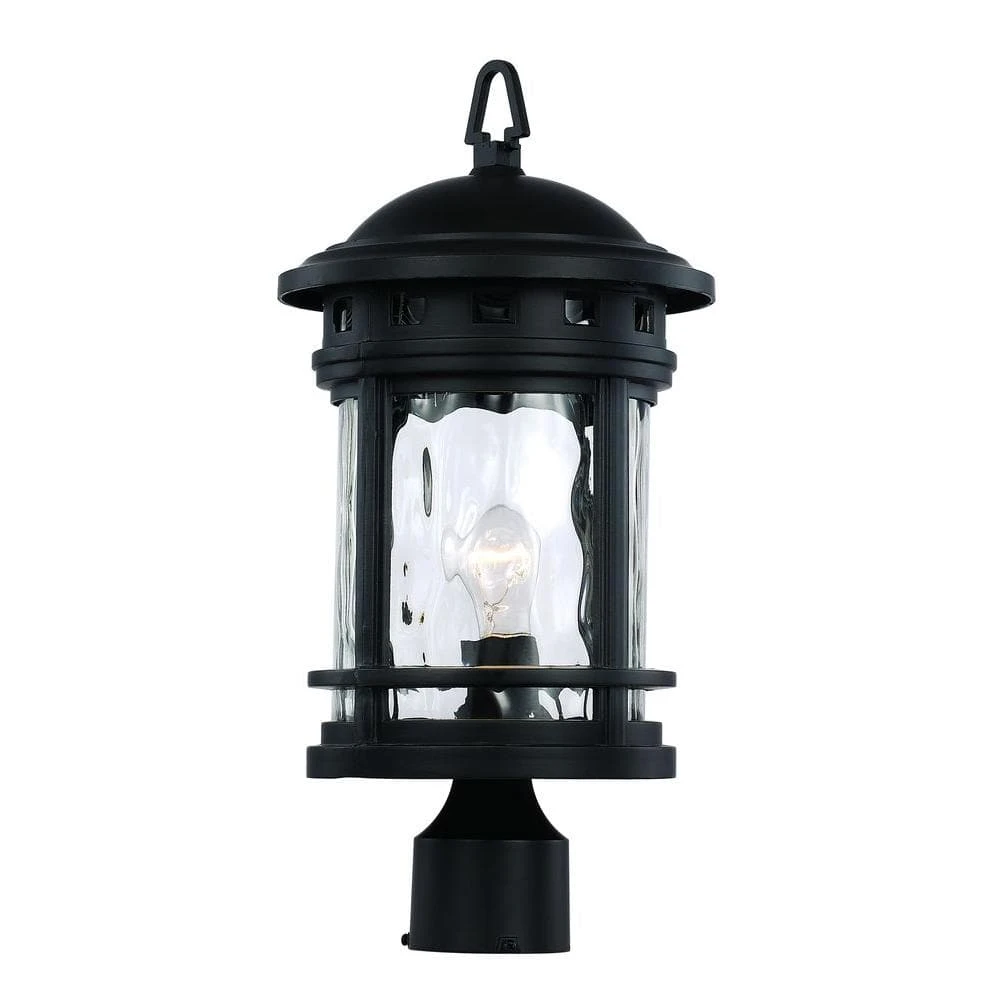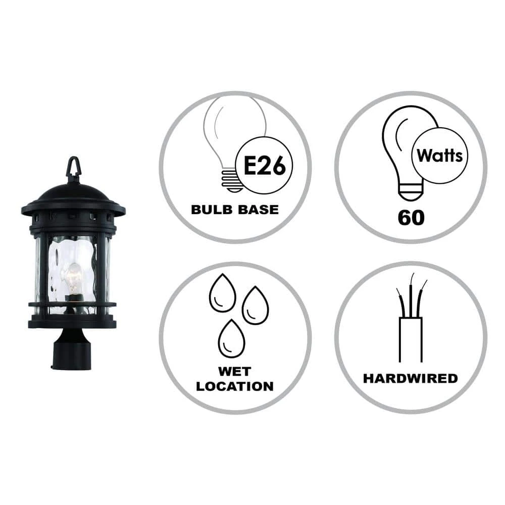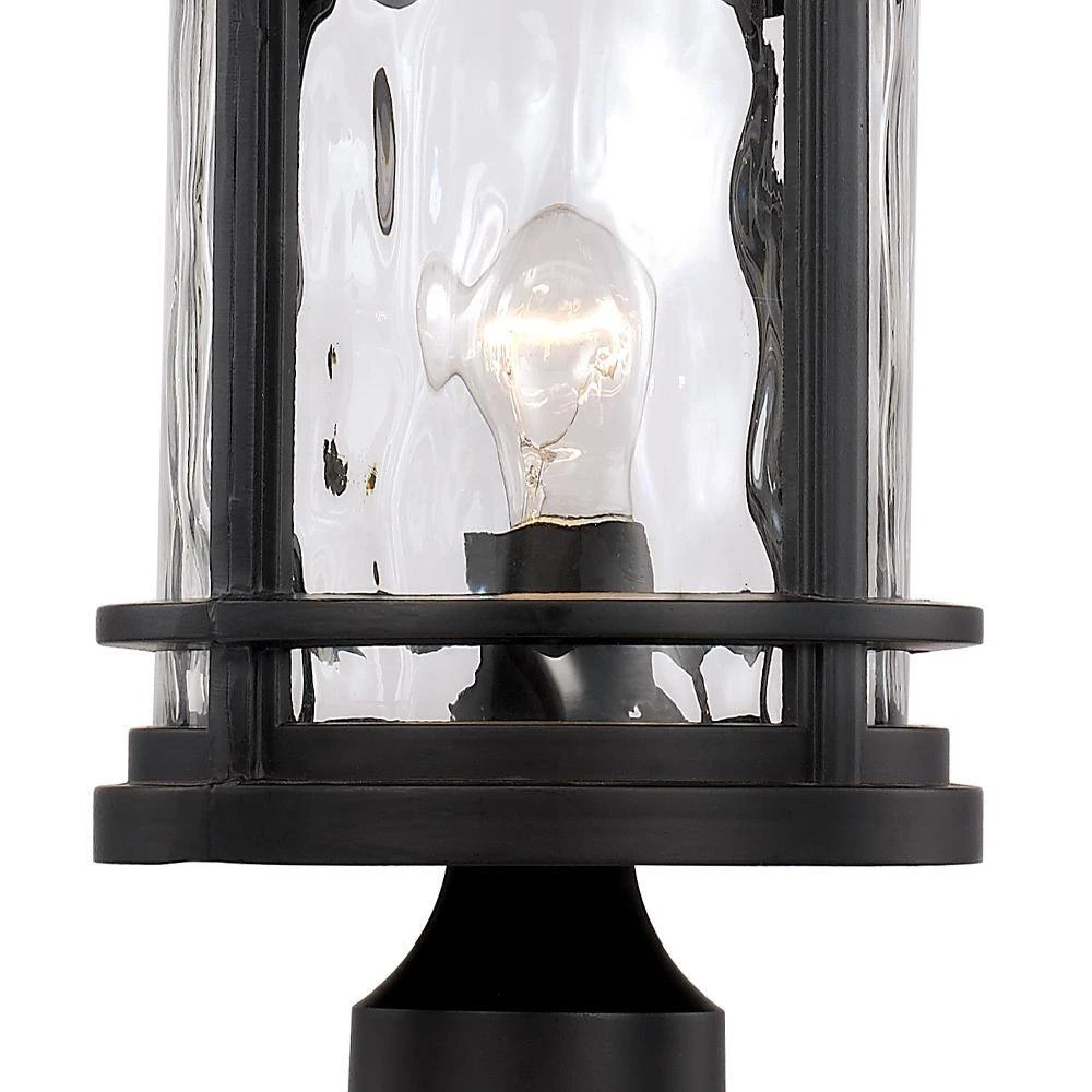 The Boardwalk Collection from Bel Air Lighting features craftsman style exterior lighting designed to coordinate with a variety of home styles from transitional and modern. The Boardwalk 18.5 inch tall post mounted lantern is the smallest lamp post light in the collection. The piece is finished in black and includes a clear water glass shade that allows ample illumination from the single bulb inside to shine out and light up walkways, steps, and landscape areas. The cylindrical lantern body is encased in a durable metal frame and includes a decorative ring hook finial, an element that is present throughout the Boardwalk family. This fixture requires a hardwired connection and can easily be mounted on standard light poles, pier mount bases, and column adapters. Shop the Boardwalk Collection for additional sizes, finishes, and exterior lighting styles.