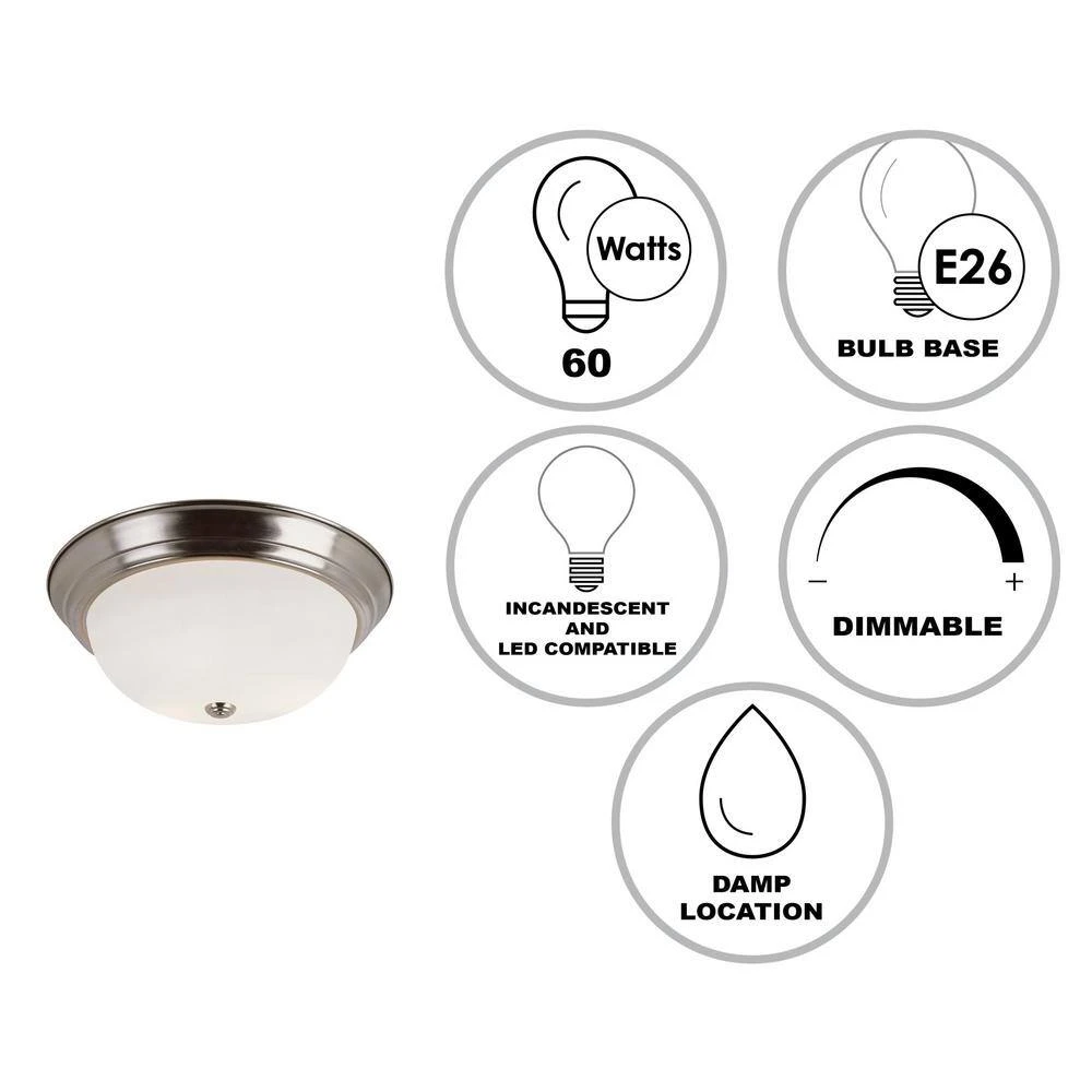 The Bowers collection combines traditional design themes with functionality, exhibiting unique interior lighting suitable for a variety of home types. The Bowers 11 inch round flush mount is the smallest ceiling light in the collection, and casts a soft ambient light over a wide area. The minimal aesthetic is ideal to blend with any decor while also illuminating a variety of interior living areas. This fixture has a white frosted glass bowl shade and a brushed nickel finish metal frame. Two 60-watt light bulbs are housed inside the shade, and can be dimmed when used with a compatible light bulb and dimmer switch combination. The Bowers family of flush mounts are rated safe for use in damp location such as bathrooms, making them an ideal choice for any room of the house. Shop the complete Bowers Collection for coordinating styles and additional finishes.