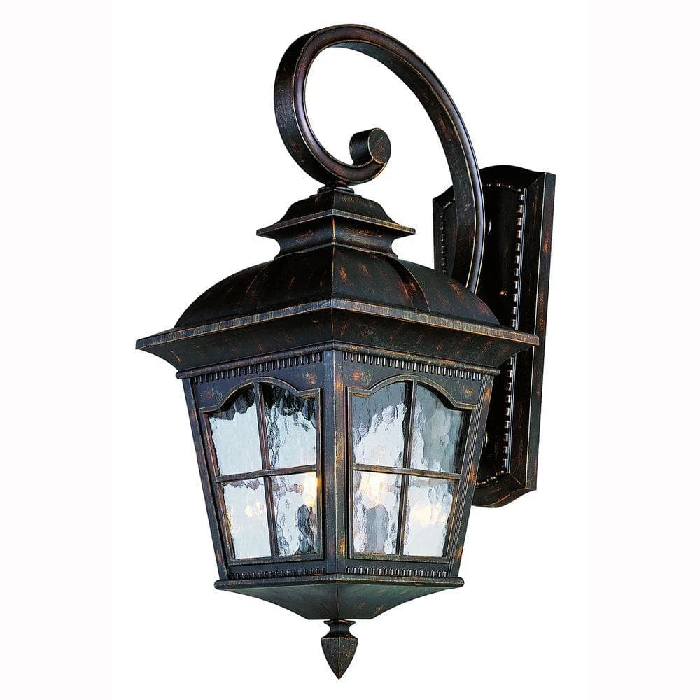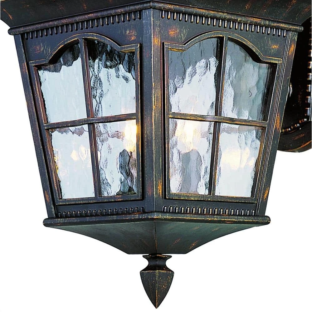 The Briarwood Collection from Bel Air presents craftsman outdoor lights with colonial appeal, ideal for traditional and old-English styled homes. The Briarwood 21.5 inch tall outdoor wall light is a hanging lantern style fixture that draws on the rustic appeal of classic American styling to bring functional illumination to your home’s walkways, exterior entryways, porches, and more. The piece is finished in an aged antique rust color that adds to the charm, and includes clear water glass windows on all four sides of the lantern. Two candelabra bulbs are housed inside the fully enclosed fixture, offering ample illumination for smaller and larger sized areas. The lantern body hangs from a decorative scroll arm detail and affixes firmly to a matching rectangular wall plate. Shop the Briarwood Collection for a complete selection of lighting styles to coordinate with this outdoor wall light.