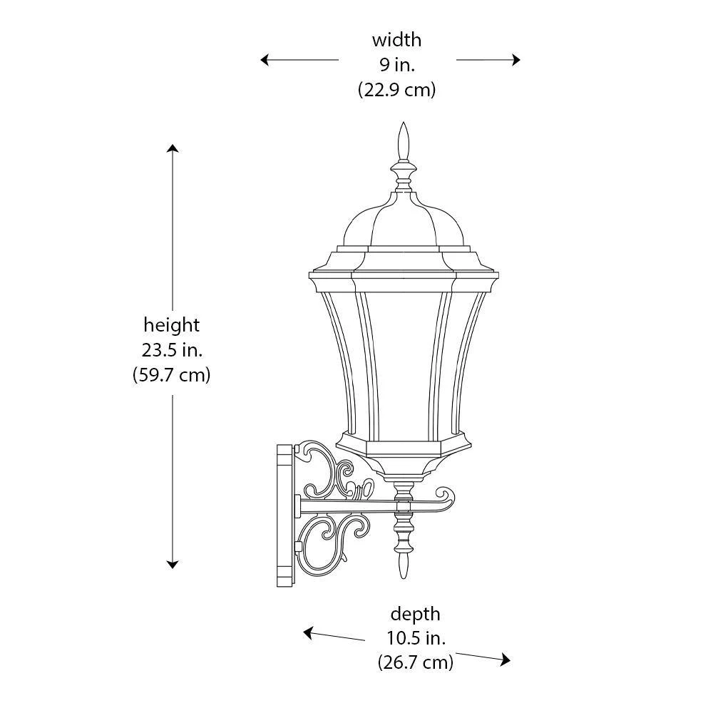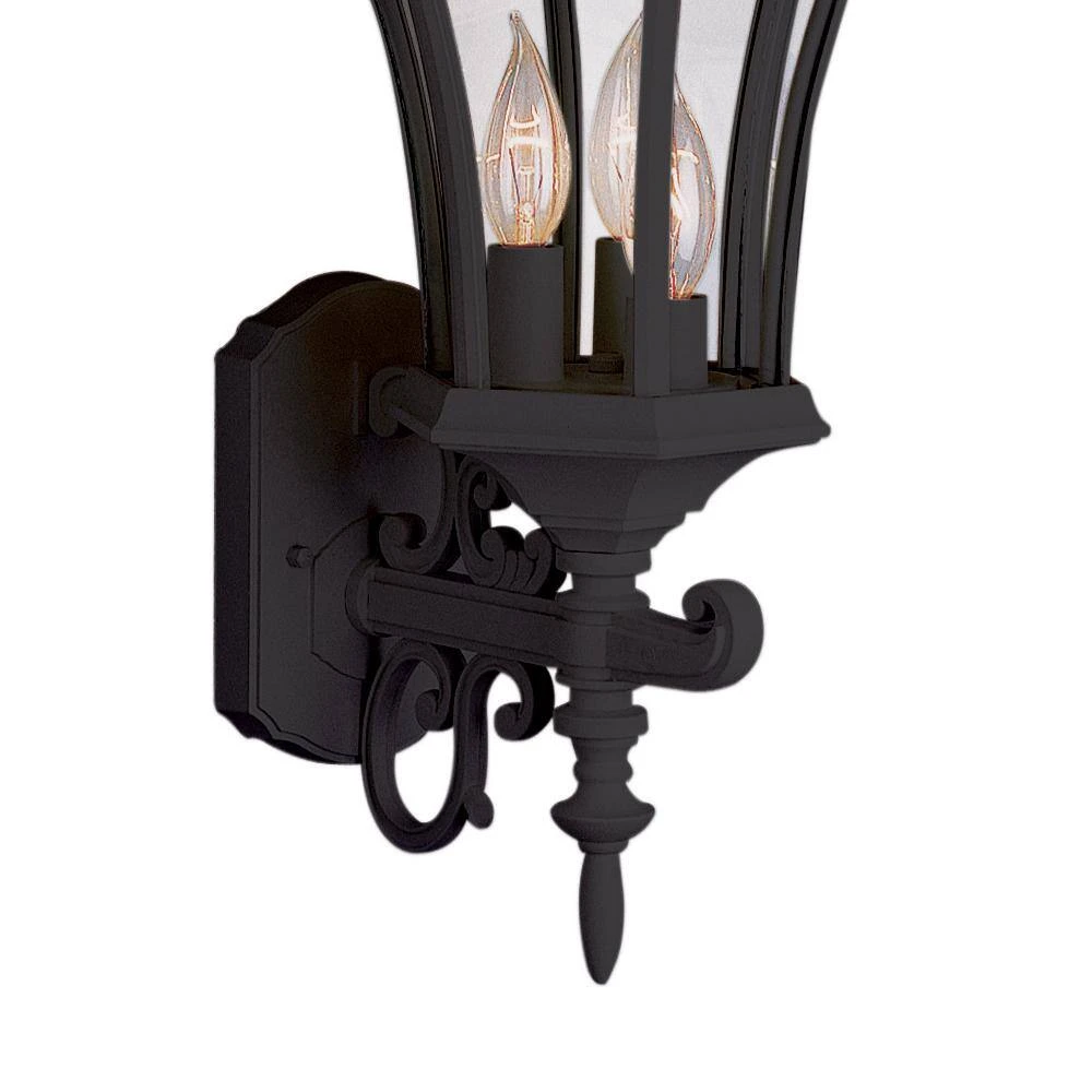 The Burlington Collection exhibits traditional style outdoor lighting with curved glass edges and unique craftsman details, designed to add functional lighting to outdoor spaces and highlight the charm of your home. The Burlington 23.5 inch tall coach style lantern is the largest wall light available in the collection and is finished in black to coordinate seamlessly with existing exterior decor styles and other black finish fixtures. The piece is fully enclosed and includes decorative top and bottom finials, a design element that is present throughout the Burlington family. The three candelabra bulbs that are visible inside the clear glass sides provide ample illumination for a variety of applications. This outdoor wall light is ideal for illuminating entryways, walkways, and larger driveway areas. Shop the Burlington Collection for additional coordinating pieces.