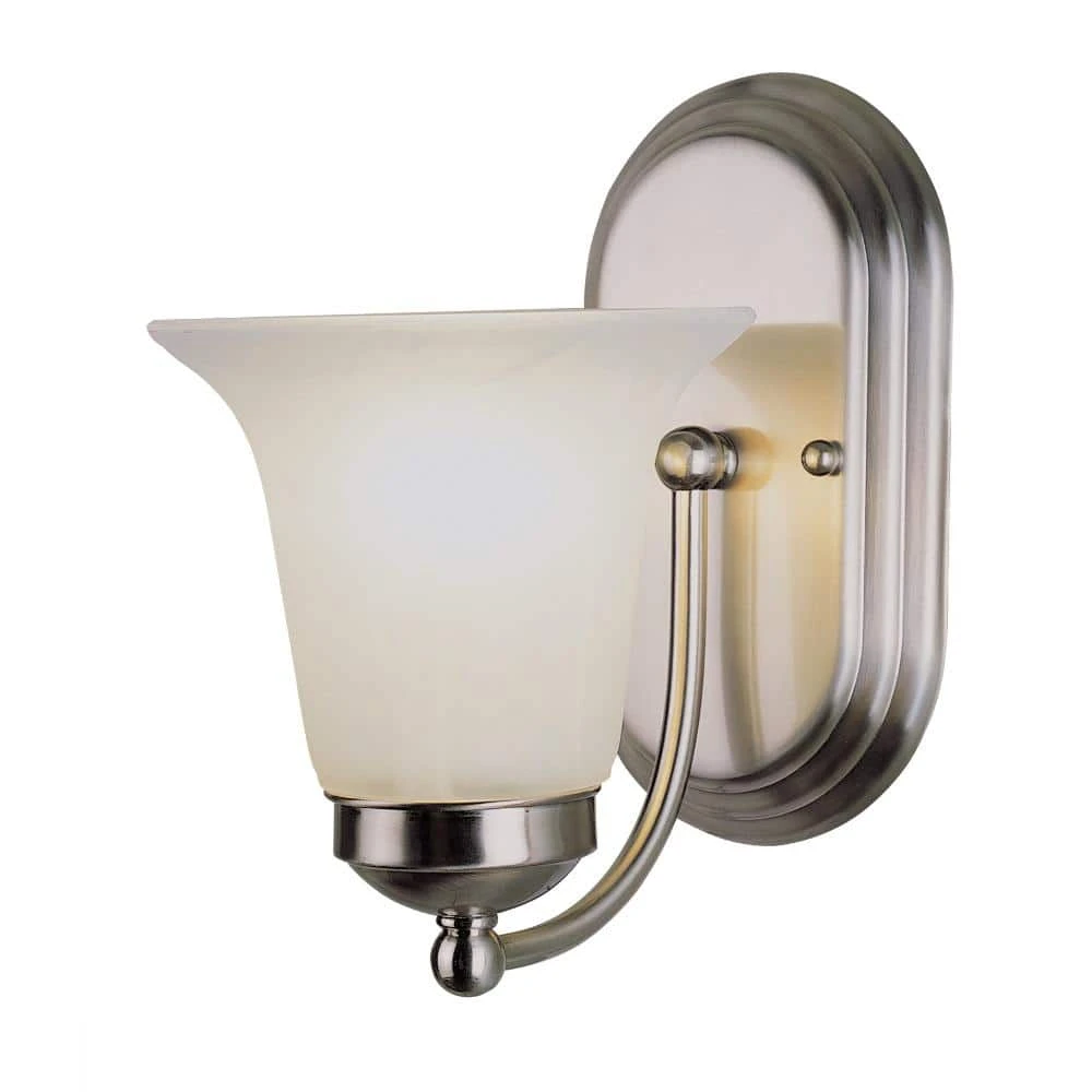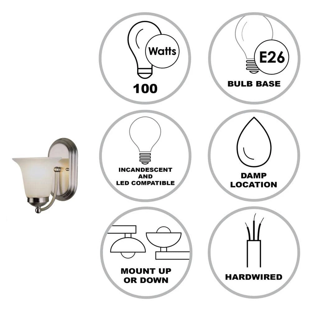 The Cabernet Collection from Bel Air exhibits traditional wall lighting, suitable for use in hallways, bedrooms, bathrooms, or powder rooms. The Cabernet wall sconce is a versatile piece that can be mounted with the shade facing up or down for a customized look and directional lighting. The metal frame is finished in brushed nickel that will blend seamlessly with existing nickel finished bathroom hardware. A curved arm reaches out from the oval wall plate to hold a bell-shaped glass shade in place. The marbled white glass compliments the metallic finish and allows the light from the single bulb inside to illuminate warmly and evenly without any harsh shadows. Mount as a single unit for coordinated accent lighting, or as a set on either side of a vanity mirror, hallway, or doorway for whole-room task illumination.