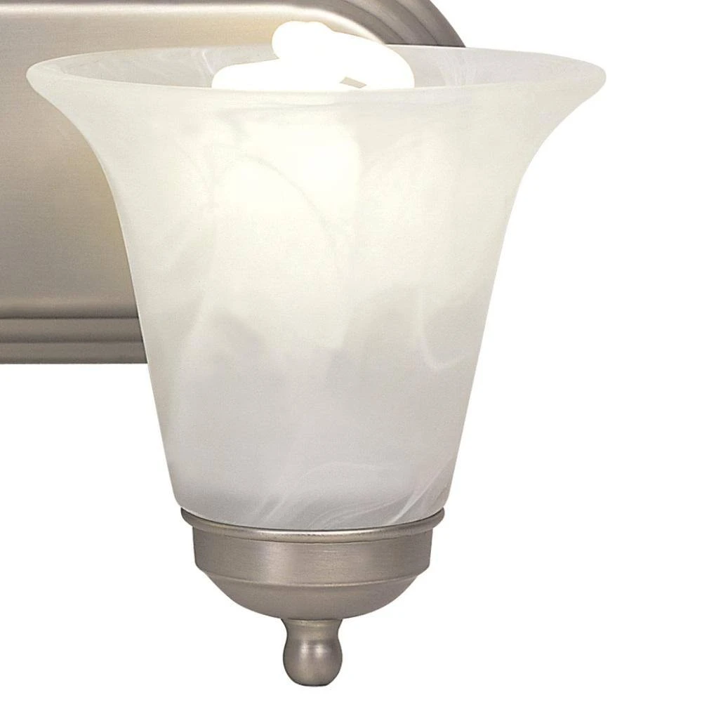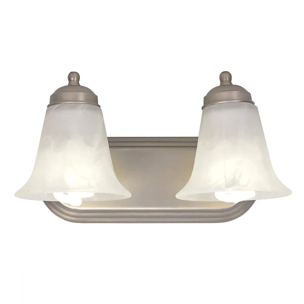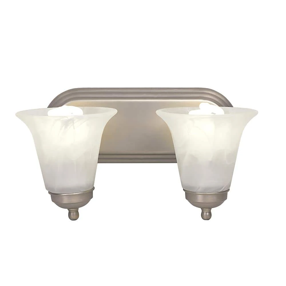 The Cabernet Collection features traditional style vanity lighting with elegant, marbleized glass shades and 3 finish options to choose from. This Cabernet 2-light vanity bar is finished in a warm toned brushed nickel, designed to blend seamlessly with a variety of bathroom and powder room decor styles and existing hardware. Each of the 2 bell-shaped shades houses a single 60-Watt bulb and is open at the base to allow for directional lighting. Each piece in the Cabernet Collection can be mounted with the shades facing upwards or downwards for a customizable look. This 2-light fixture is the smallest vanity light in the Cabernet Collection, and is ideal for use over smaller vanities and mirrors.
