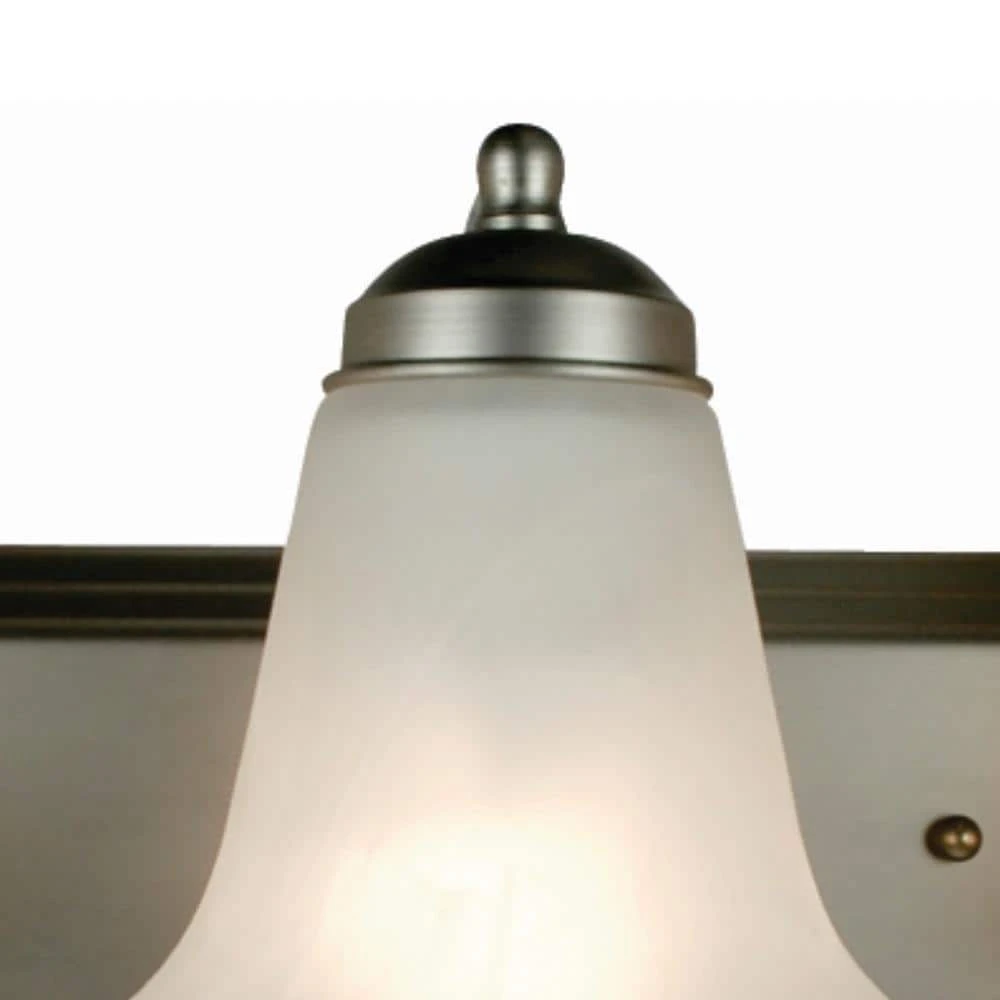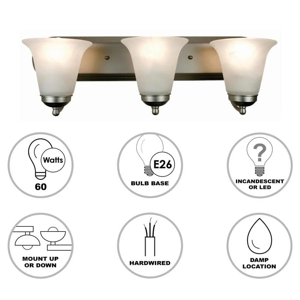 The Cabernet Collection features traditional style vanity lighting with elegant, marbleized glass shades and three finish options to choose from. This Cabernet 3-light vanity bar is finished in a warm toned brushed nickel, designed to blend seamlessly with a variety of bathroom and powder room decor styles and existing hardware. Each of the three bell-shaped shades houses a single 60-watt bulb and is open at the base to allow for directional lighting. Each piece in the Cabernet Collection can be mounted with the shades facing upwards or downwards for a customizable look.