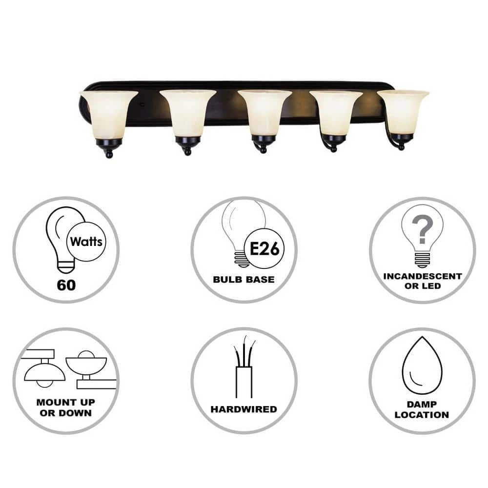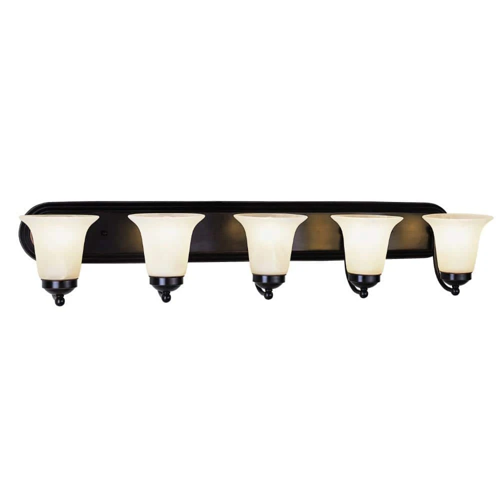The Cabernet Collection features traditional style vanity lighting with elegant, marbleized glass shades and three finish options to choose from. This Cabernet 5-light vanity bar is finished in a warm rubbed oil bronze, designed to blend seamlessly with a variety of bathroom and powder room decor styles and existing hardware. Each of the five bell-shaped shades houses a single 60-watt bulb and is open at the base to allow for directional lighting. Each piece in the Cabernet Collection can be mounted with the shades facing upwards or downwards for a customizable look. This 5-light fixture is the largest vanity light in the Cabernet Collection, and is ideal for use over large double vanities.