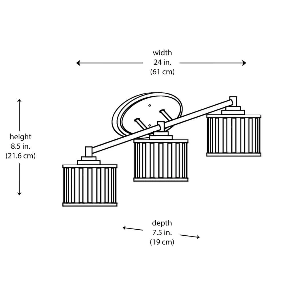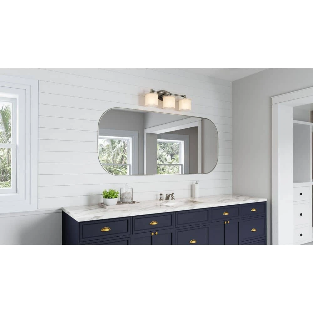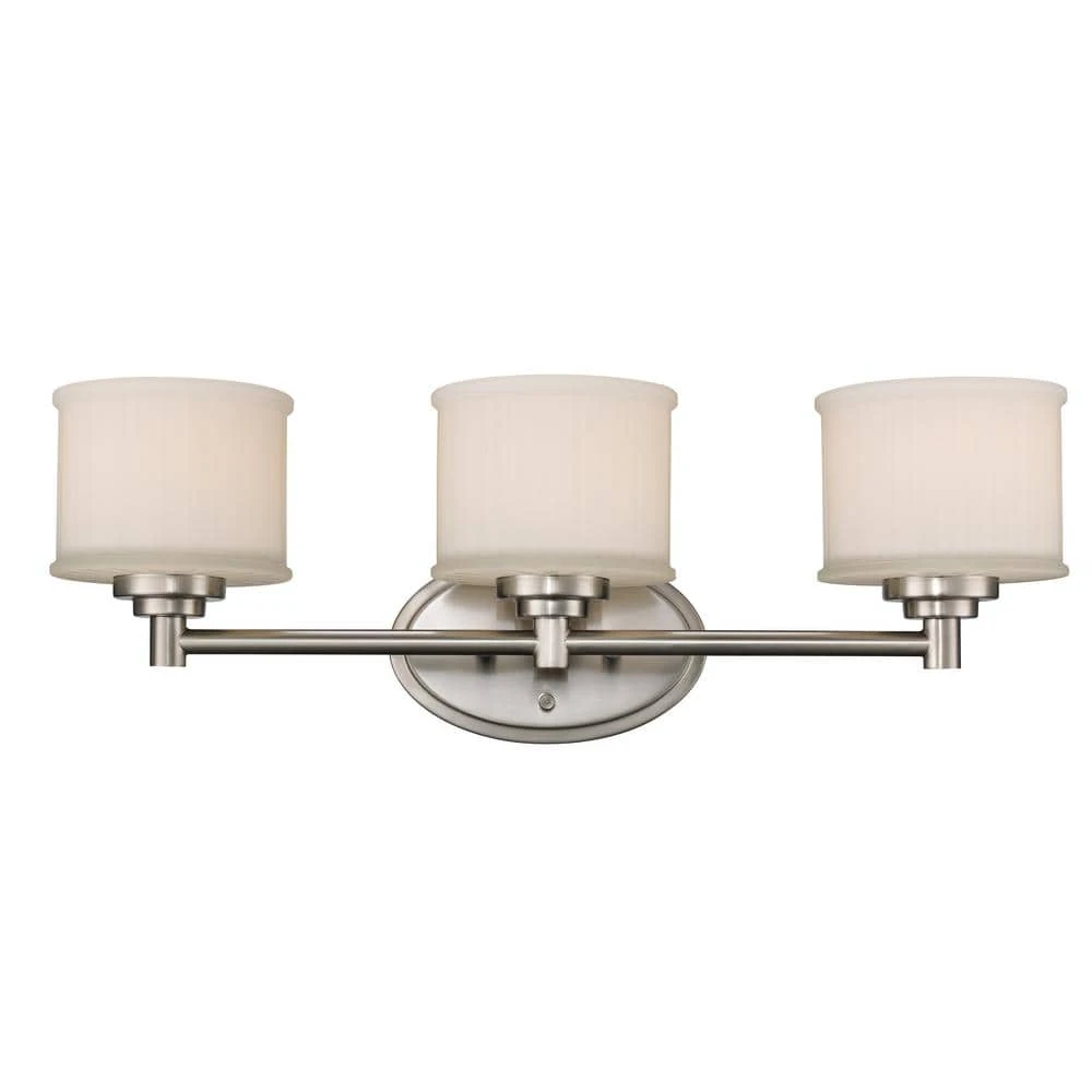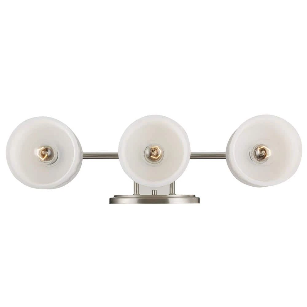 The Cahill Collection from Bel Air exhibits interior lighting styles designed to coordinate with a wide range of home decor types from transitional to modern. The Cahill 24 inch wide vanity light is a decorative way to bring functional illumination into your bathroom or powder room spaces. The three-light design is the medium-sized fixture in the Cahill family, and is ideal for use over small to medium sized vanity counters and mirrors. The piece is finished in brushed nickel to easily coordinate with existing bathroom hardware. Three frosted glass shades are included, held in place by a straight metal arm detail and mounted to a matching nickel wall plate. The vanity light can be installed with the shades facing upwards or downwards for a customized look and directional lighting. Shop the Cahill Collection for coordinating interior lighting styles and additional finishes.