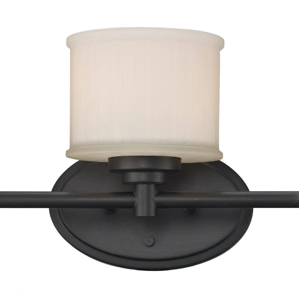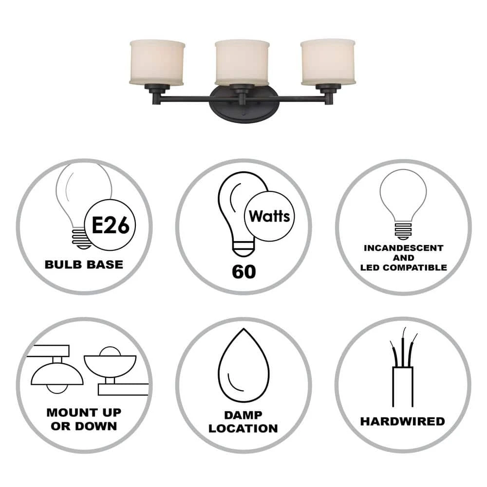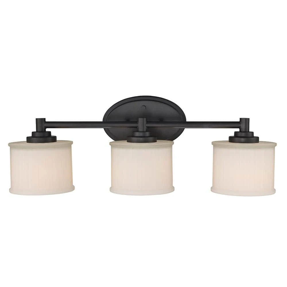 The Cahill Collection from Bel Air exhibits interior lighting styles designed to coordinate with a wide range of home decor types from transitional to modern. The Cahill 24 inch wide vanity light is a decorative way to bring functional illumination into your bathroom or powder room spaces. The three-light design is the medium-sized fixture in the Cahill family, and is ideal for use over small to medium sized vanity counters and mirrors. The piece is finished in a sleek rubbed oil bronze to easily coordinate with existing bronze bathroom hardware. Three frosted glass shades are included, held in place by a straight metal arm detail and mounted to a matching bronze wall plate. The vanity light can be installed with the shades facing upwards or downwards for a customized look and directional lighting. Shop the Cahill Collection for coordinating interior lighting styles and additional finishes.
